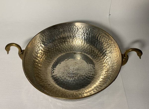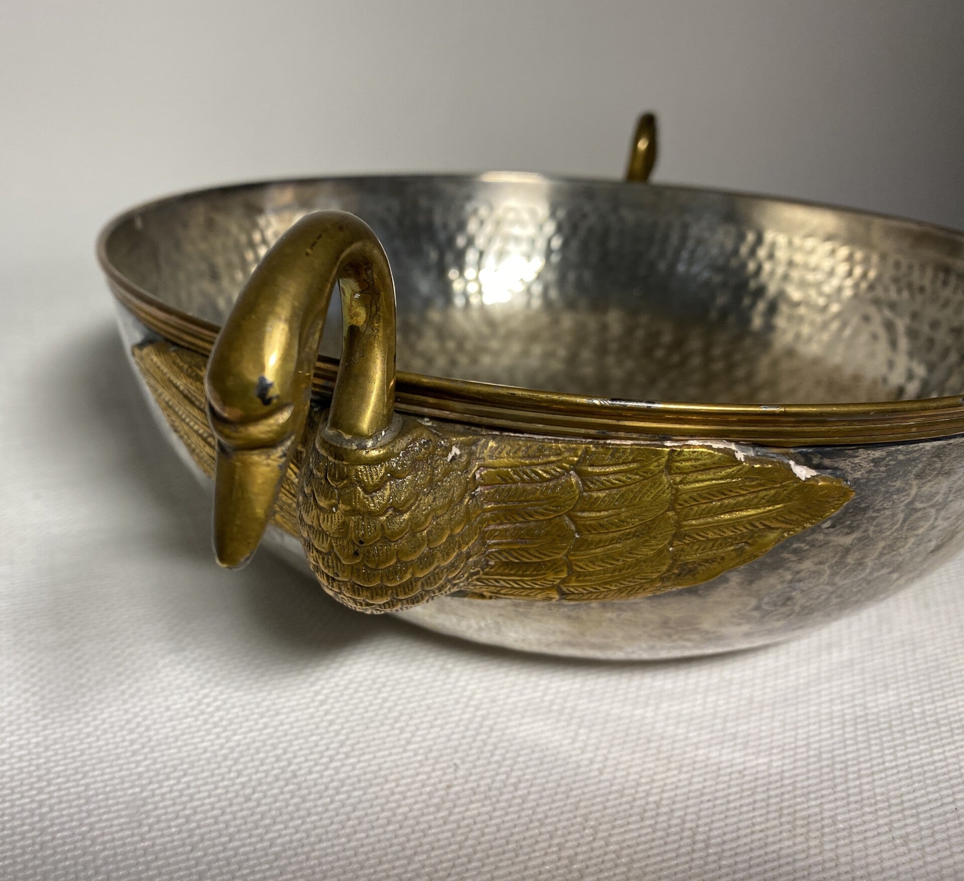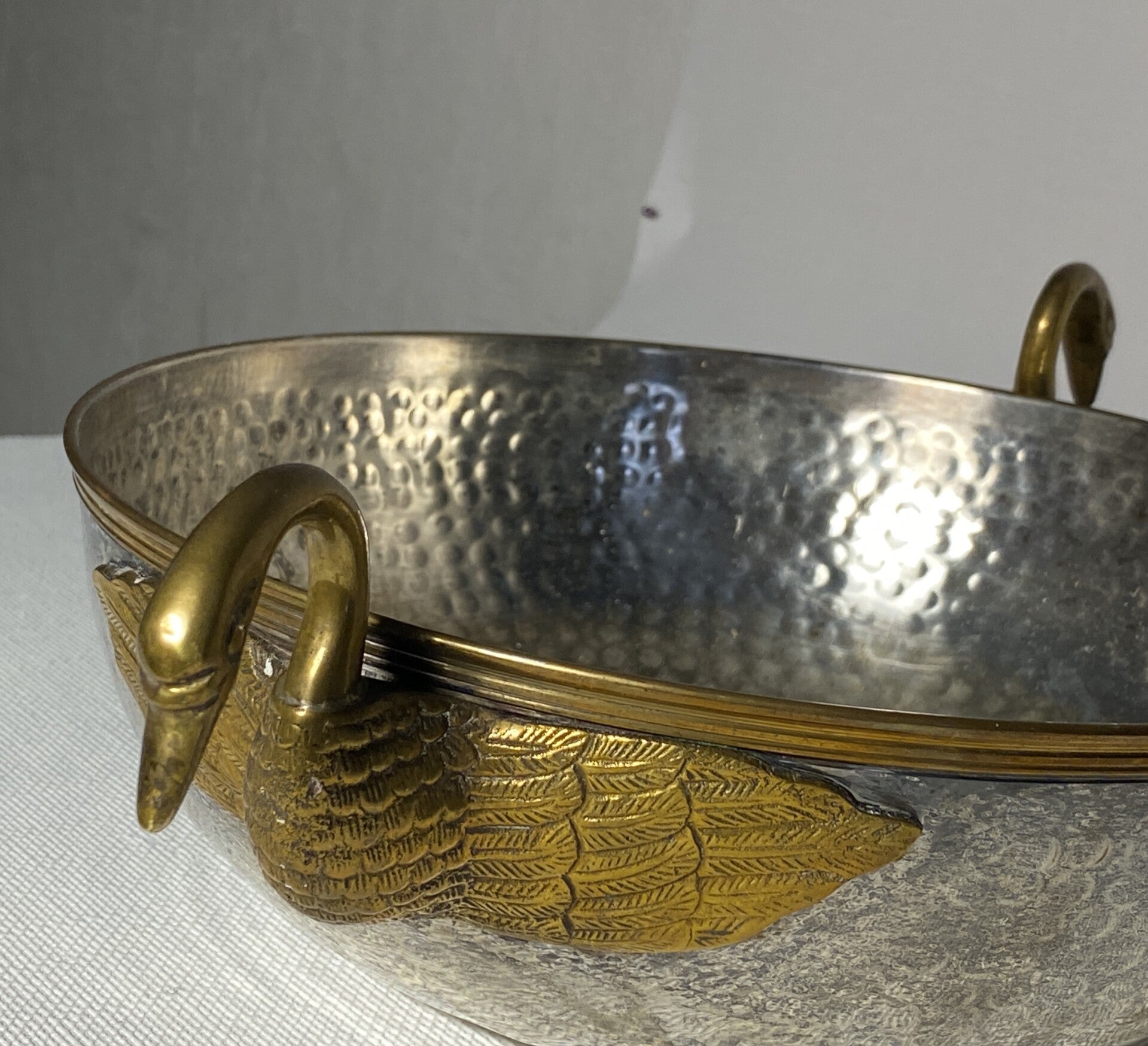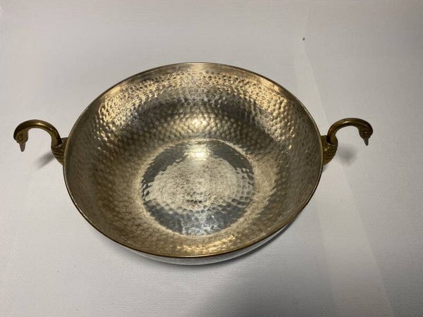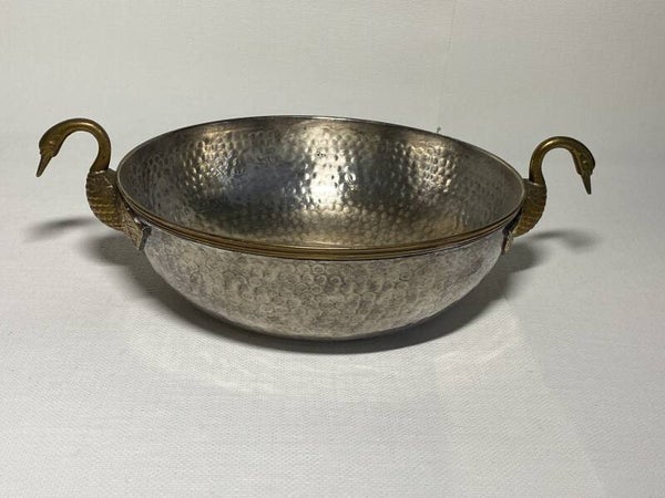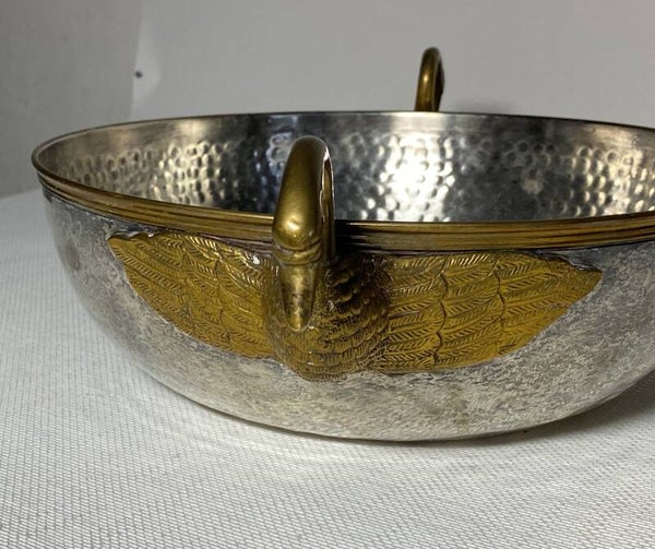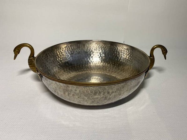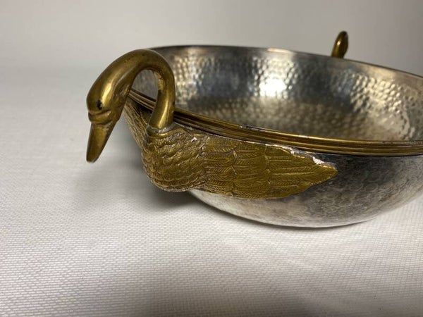 Verzilverde schaal met vergulde zwanen als handvaten.