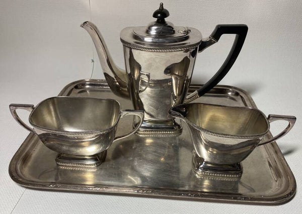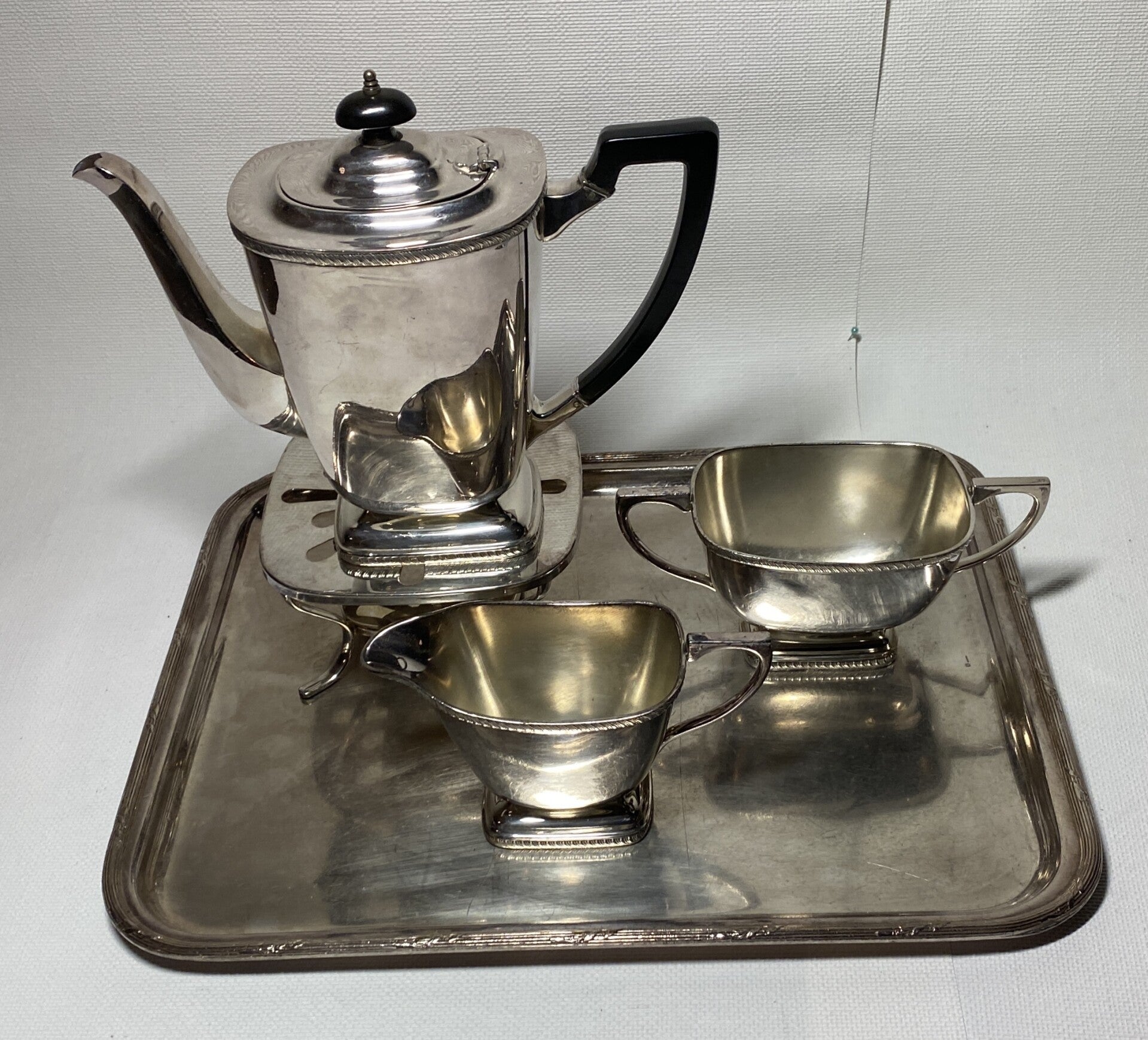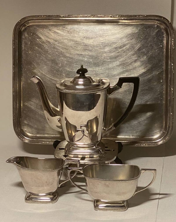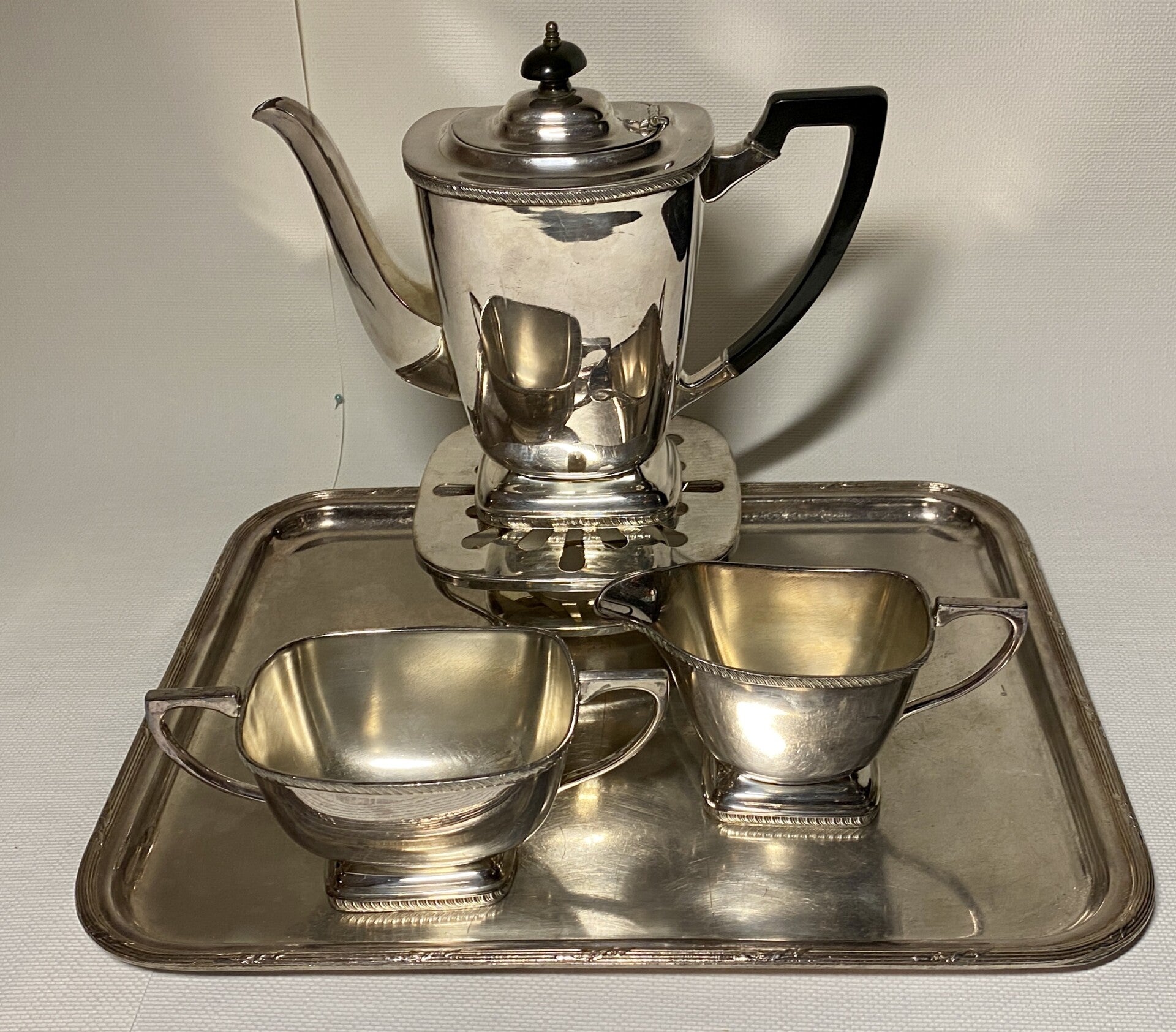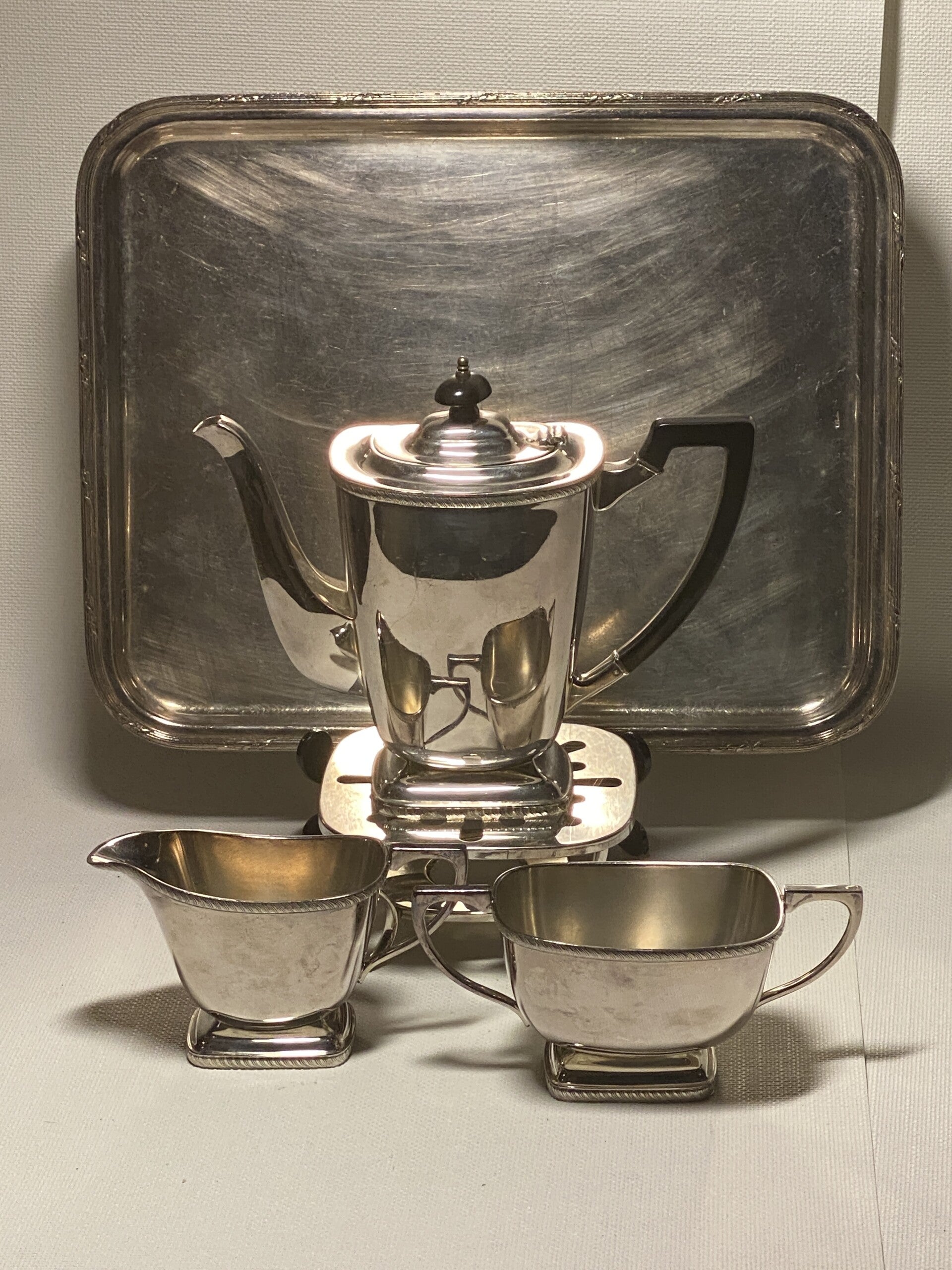 5-delig verzilverde Art Deco theeservies bestaande uit een roomkan, suikerkan, dienblad, theepot en theepot verwarmer.