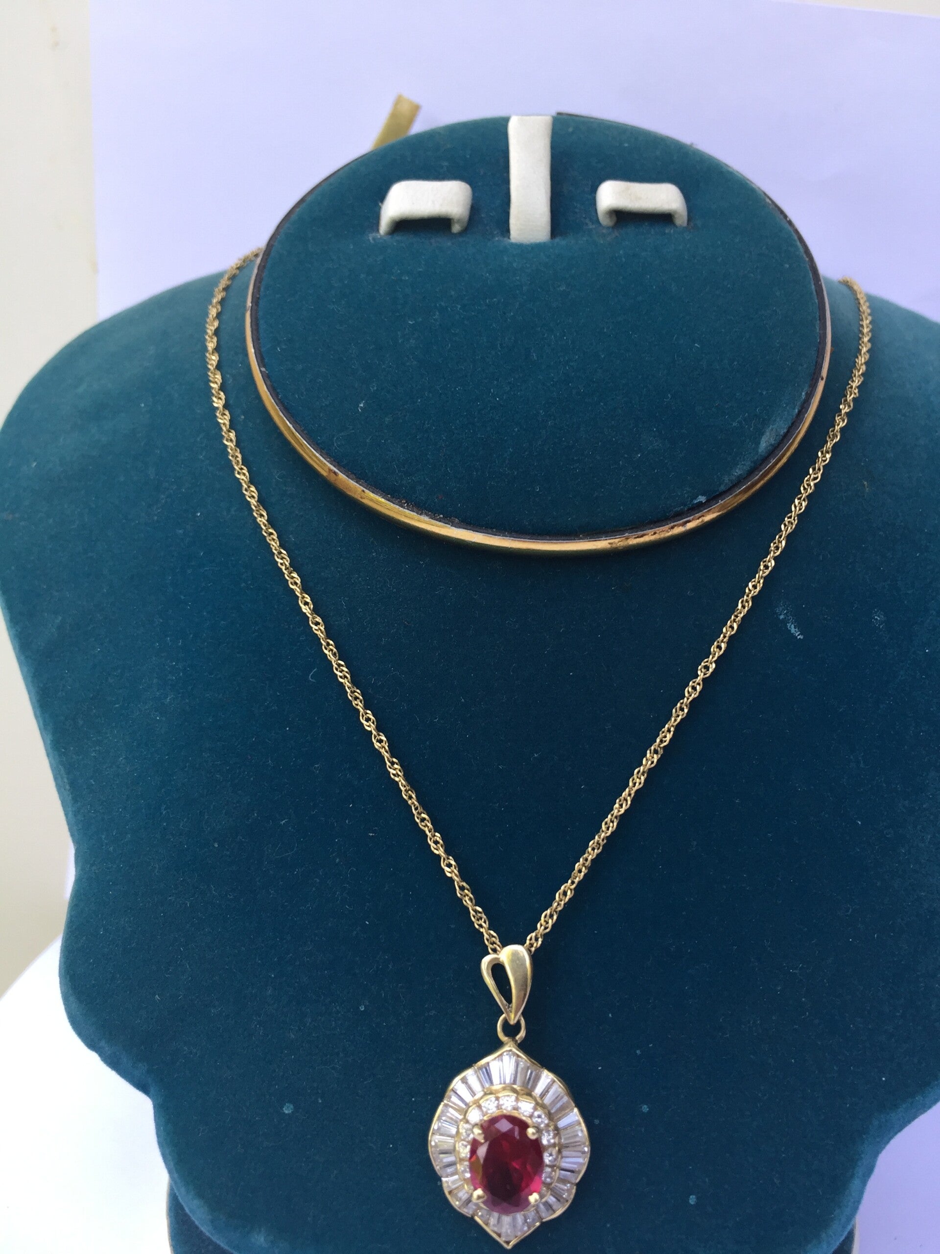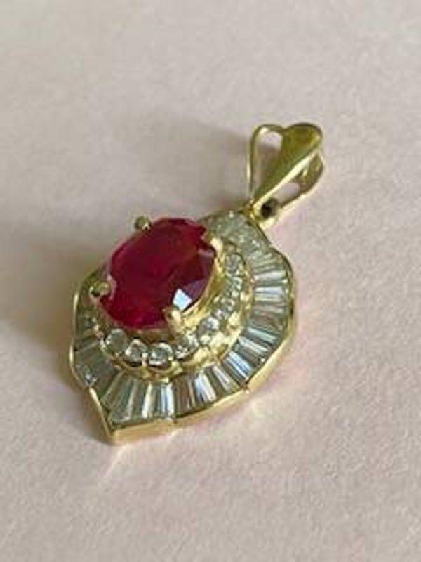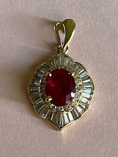 14k gouden ketting met 14k gouden synthetische robijn hanger.