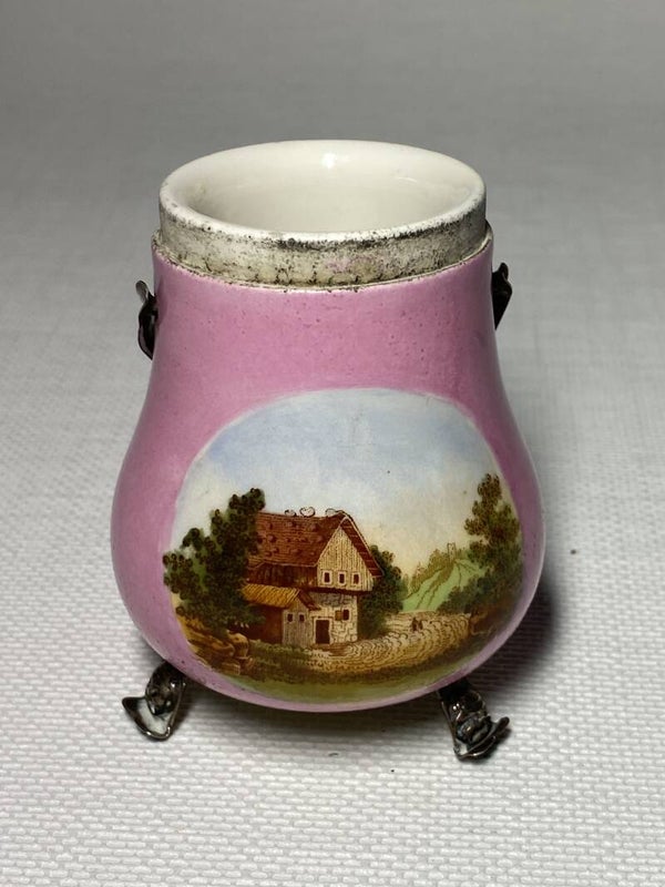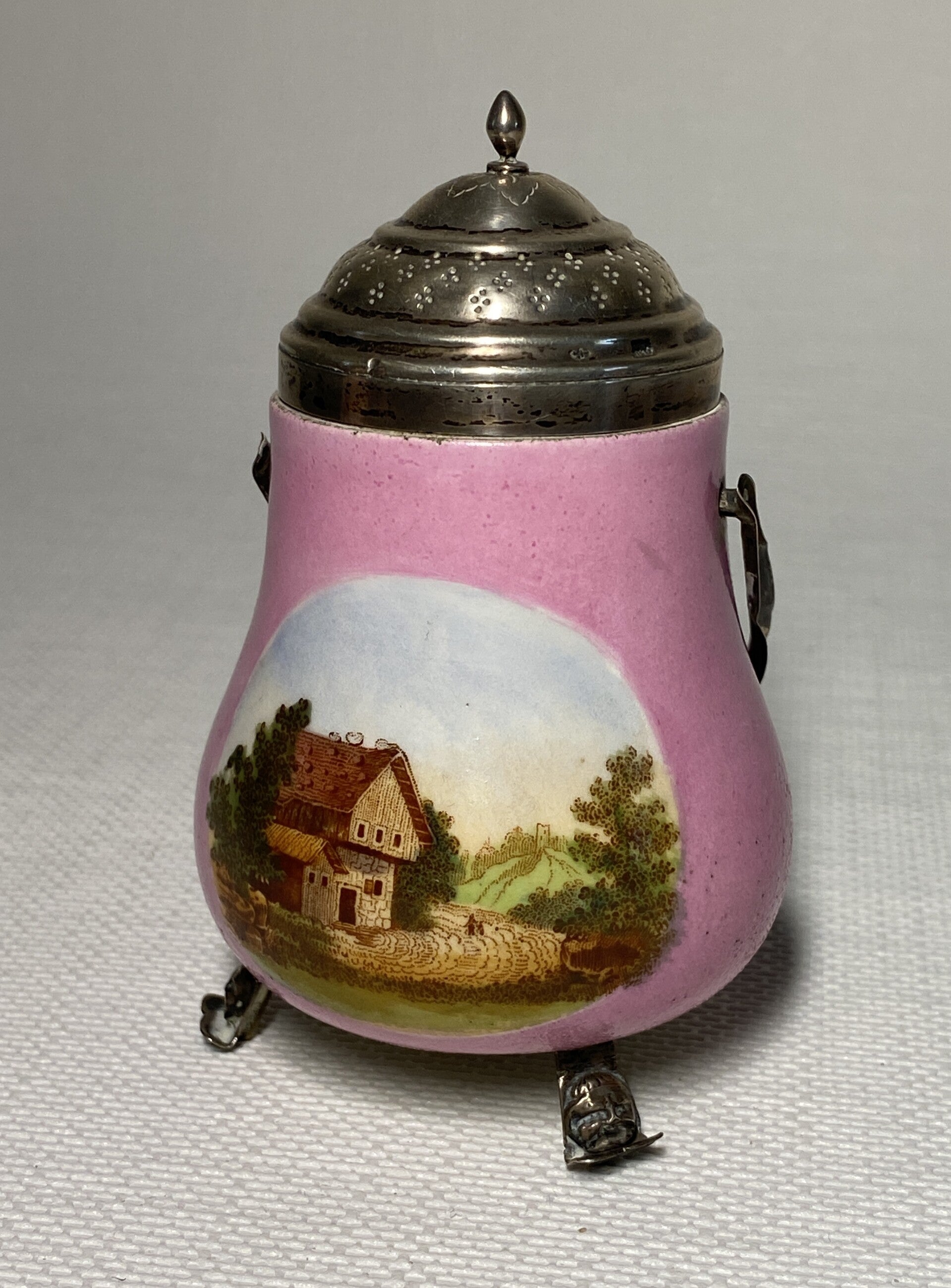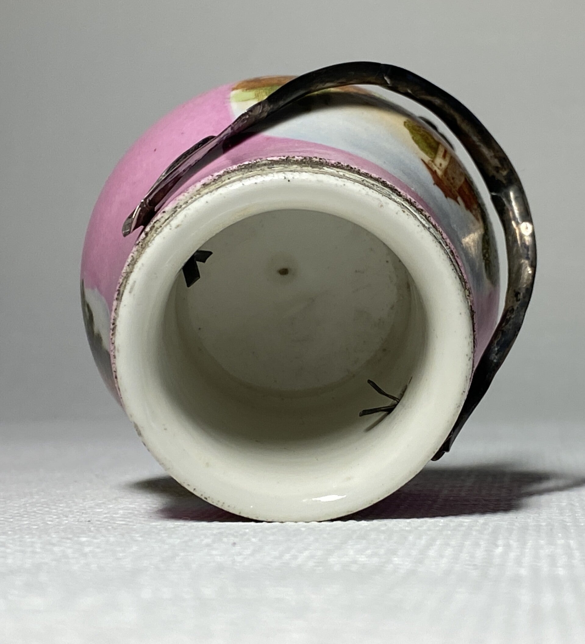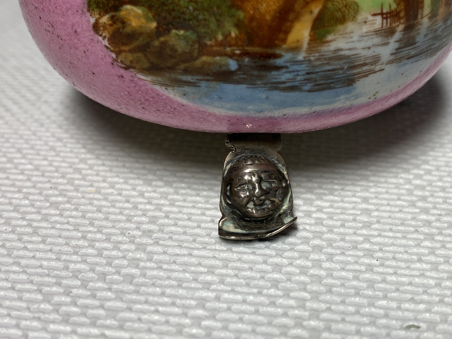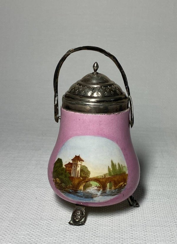 Biscuit pot van aardewerk met twee verschillende plaatjes en zilveren poten, beugel en deksel.
