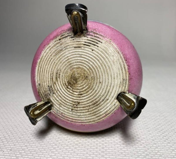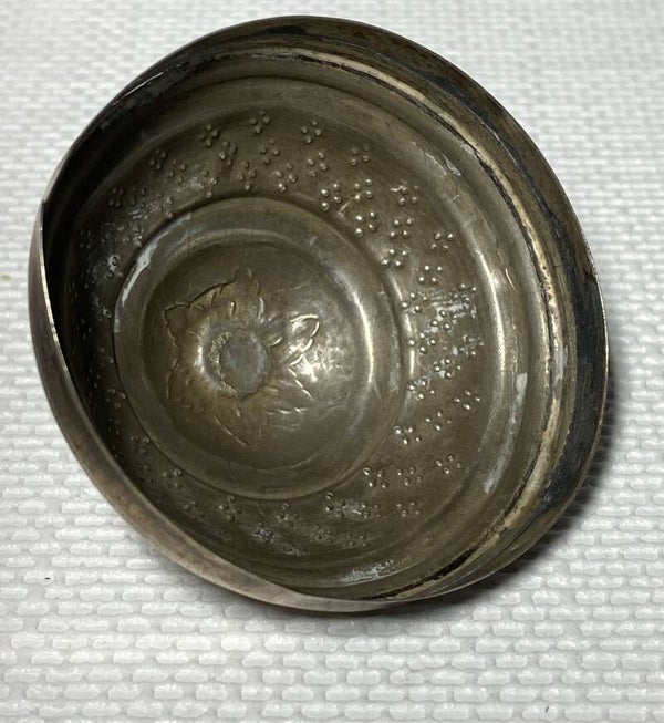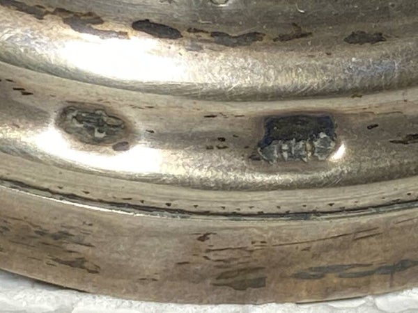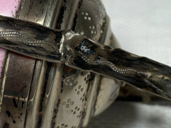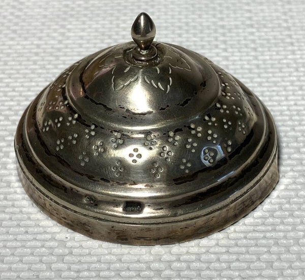 Alle vier de poten hebben een gezicht. De beugel en de deksel hebben gegraveerd werk op het zilver.