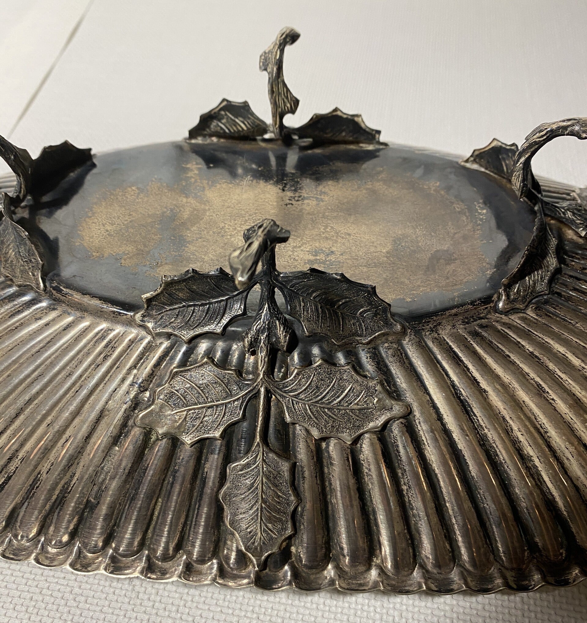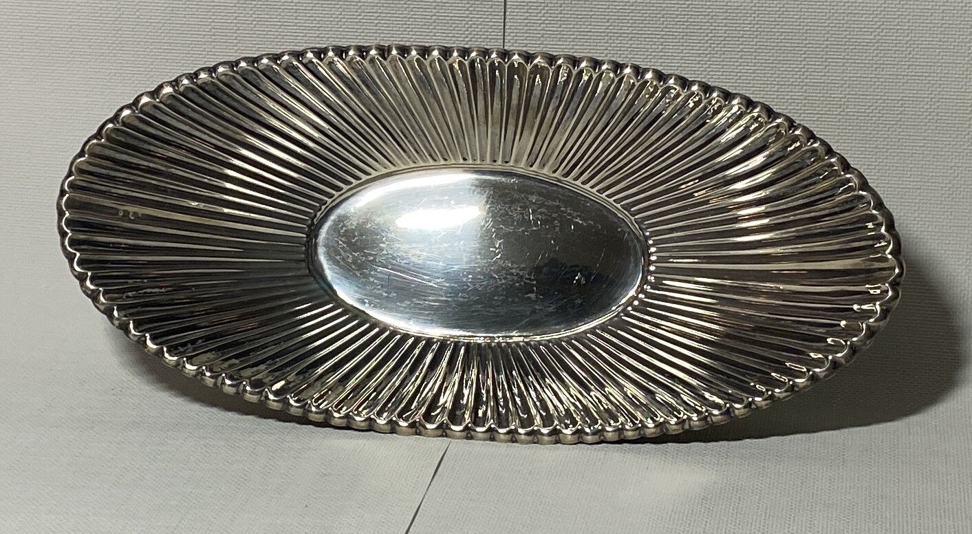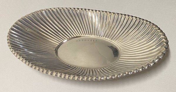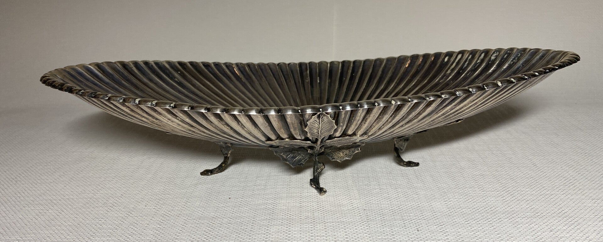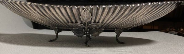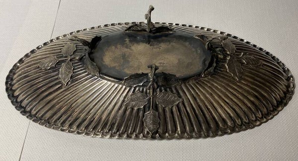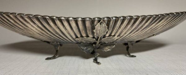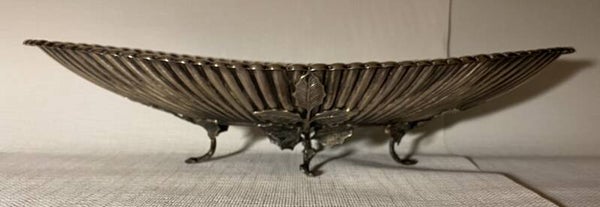 Ovale zilveren schaal met voet gedecoreerd als blad.