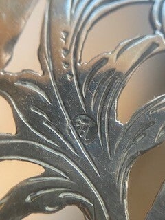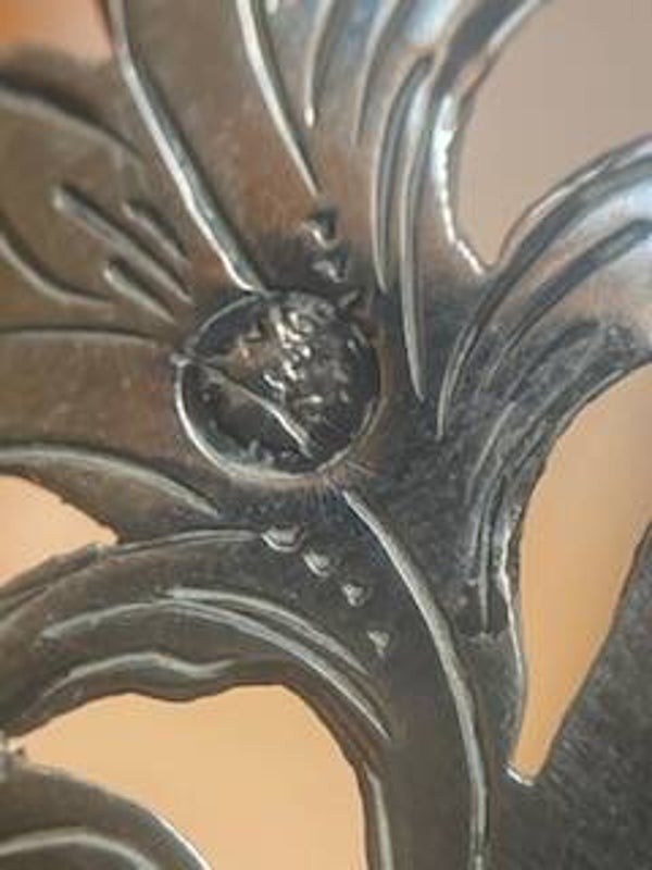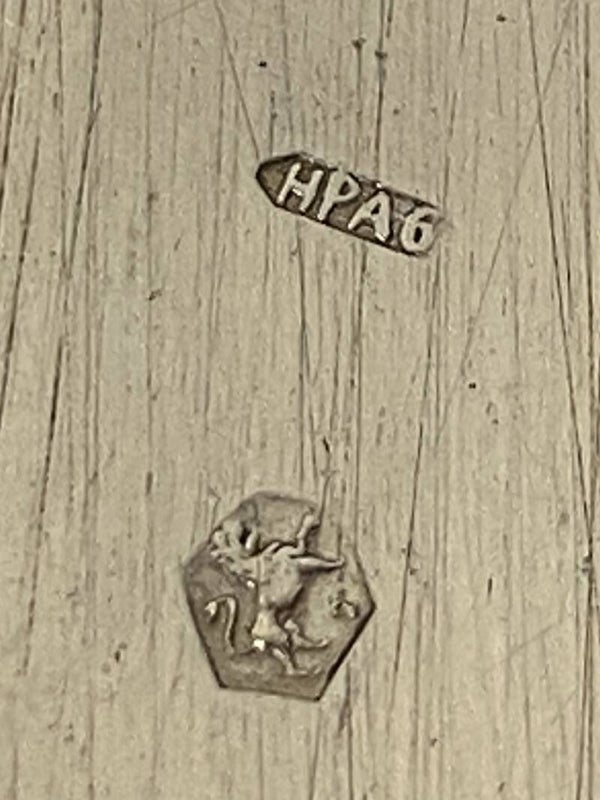 Zilverstempel: leeuw staat voor de zuiverheid van het zilver. De twee andere zilverstempels zijn niet duidelijk zichtbaar.
