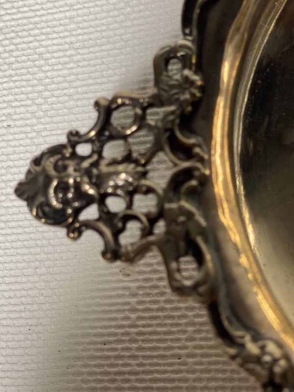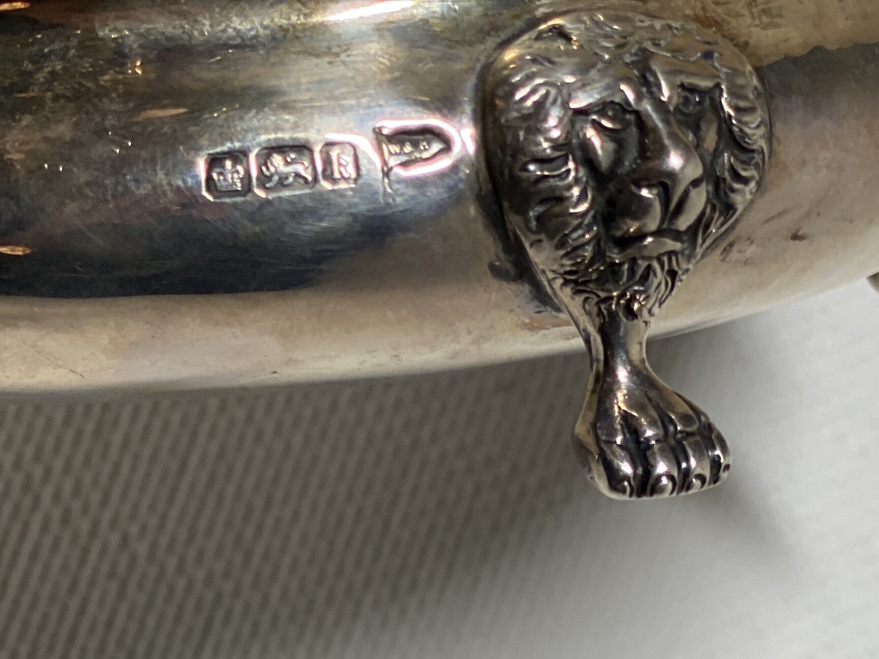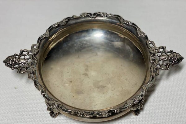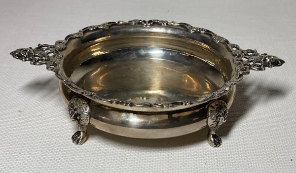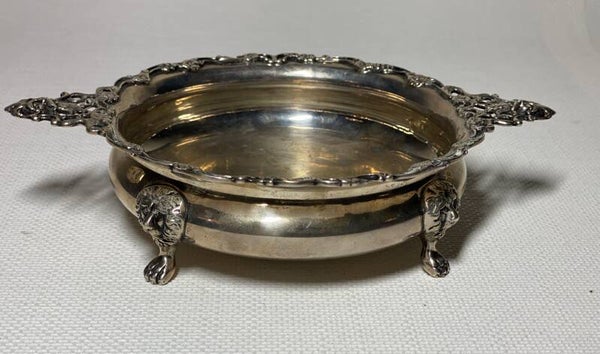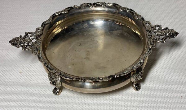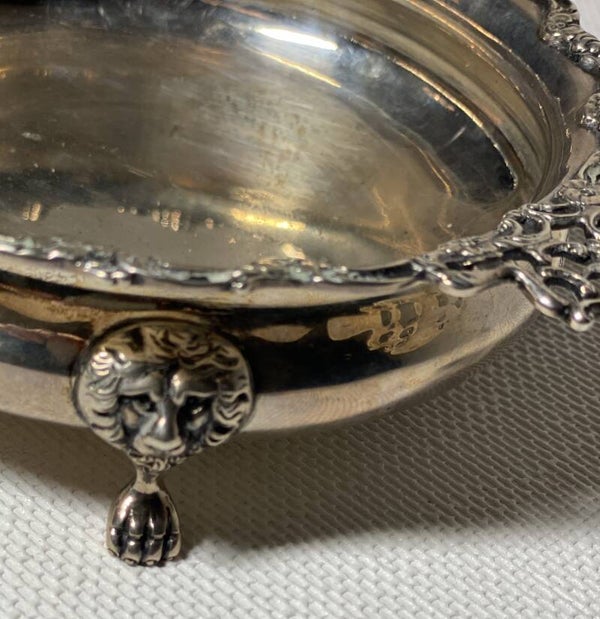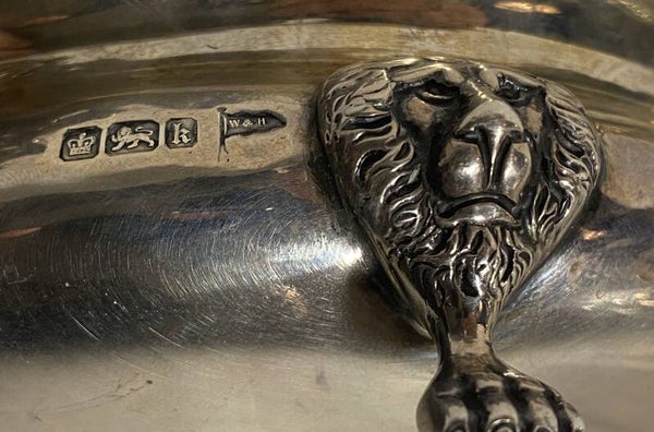 Engelse zilveren schaal gedecoreerd met bloemen en gezichten van zowel mensen als leeuwen.
