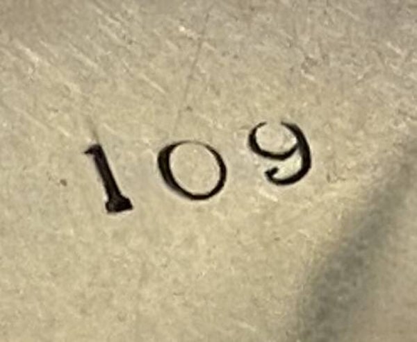 Zilverstempels: K staat voor 1869, de leeuw is een standaard Engelse zilverstempel wat staat voor sterling zilver .925, de kroon staat voor de stad en dat is in dit geval Sheffield en de vlag is een stempel van de ontwerper.