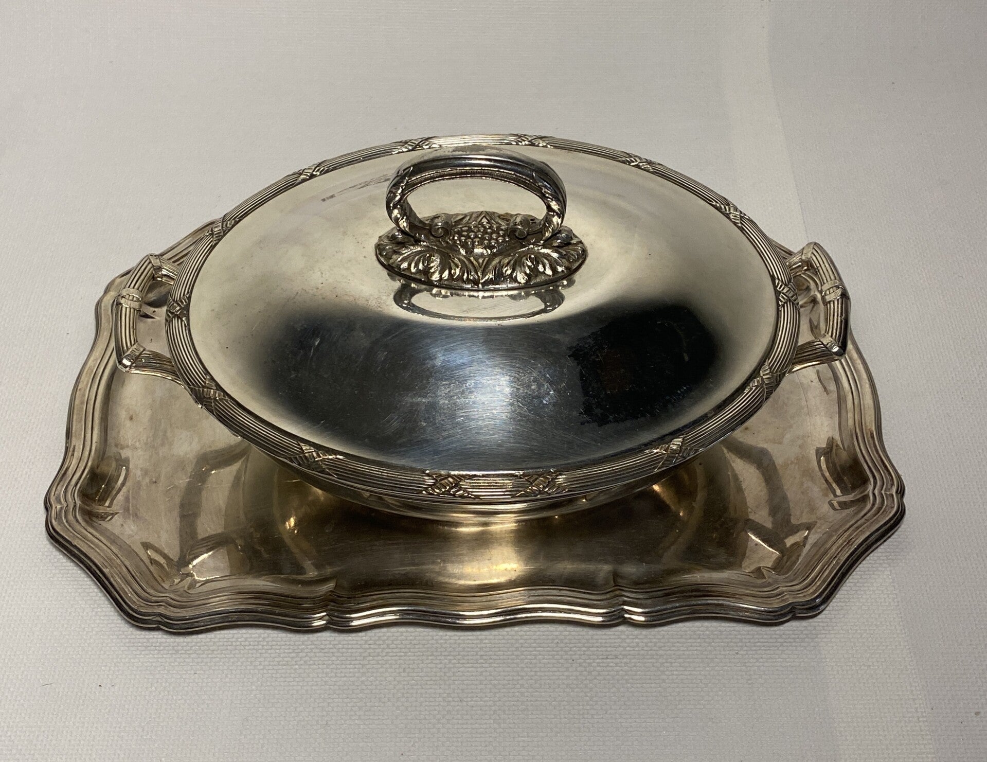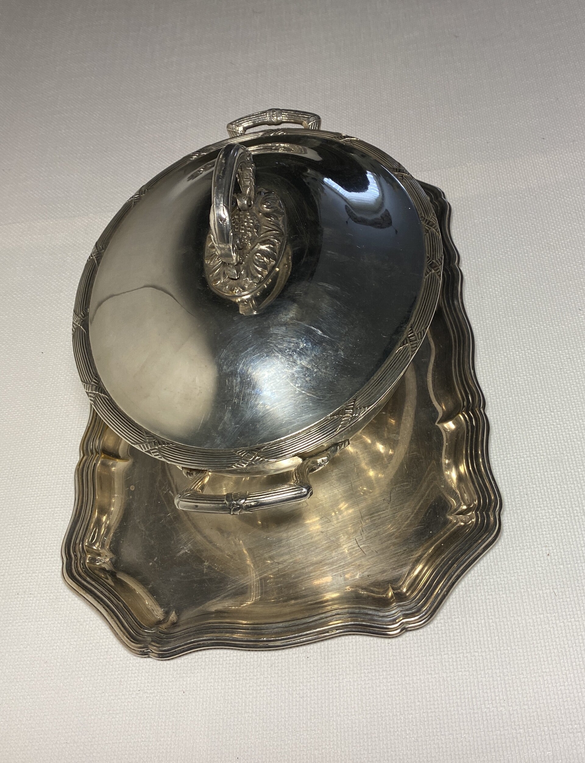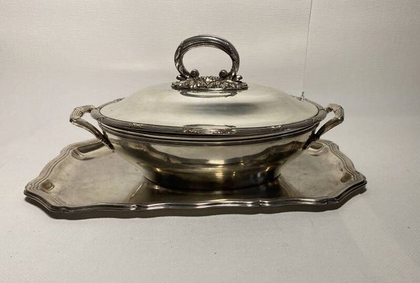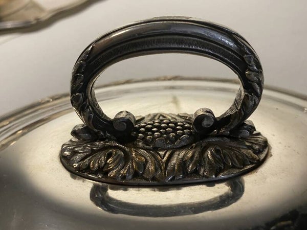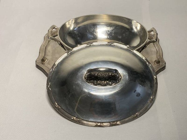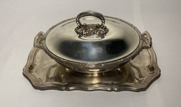 Antieke verzilverde serveerschaal met deksel op verzilverde dienblad.