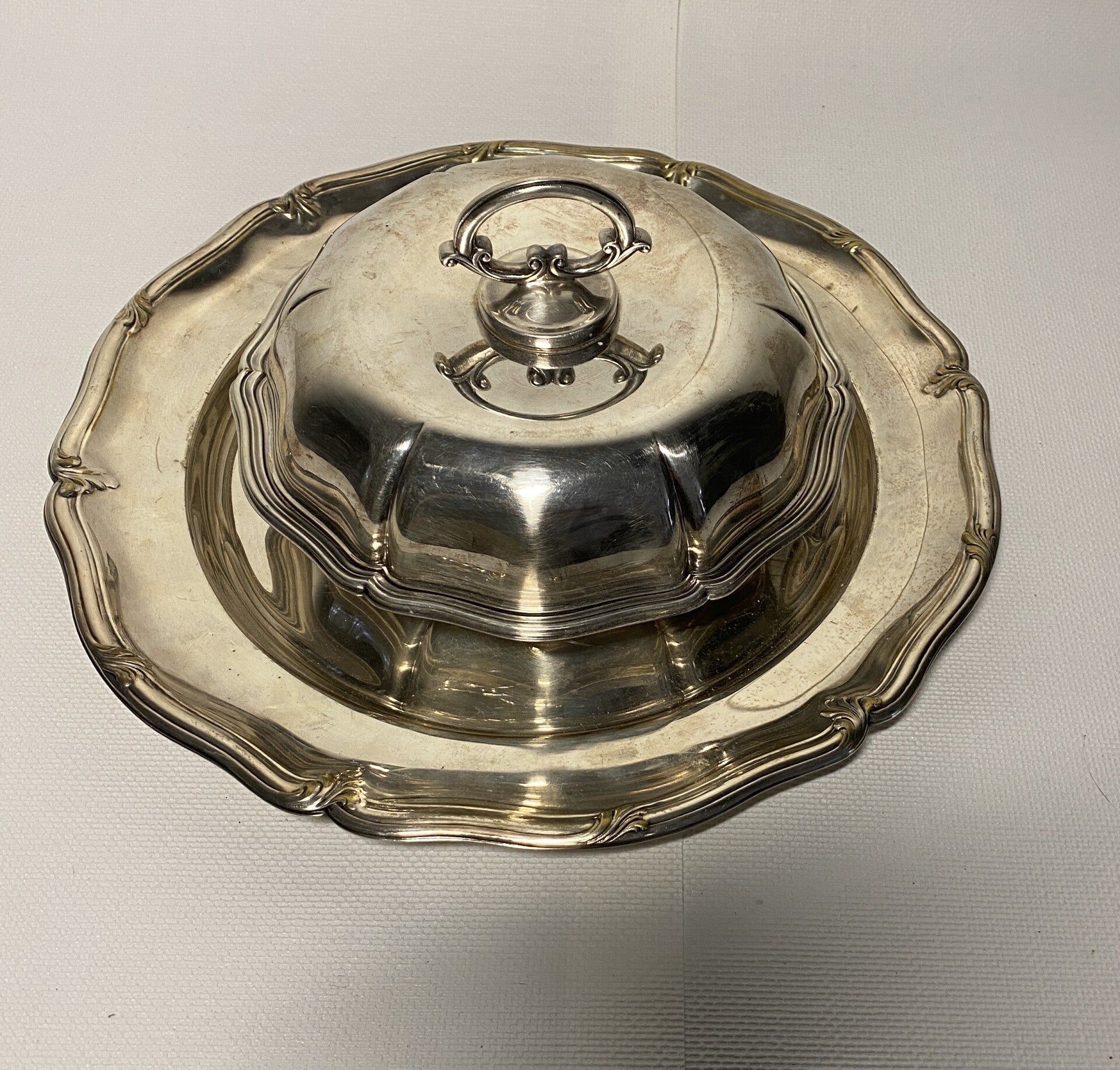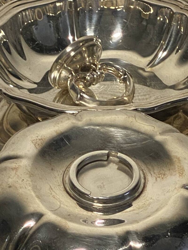 Verzilverde serveerschaal met deksel op verzilverde dienblad.