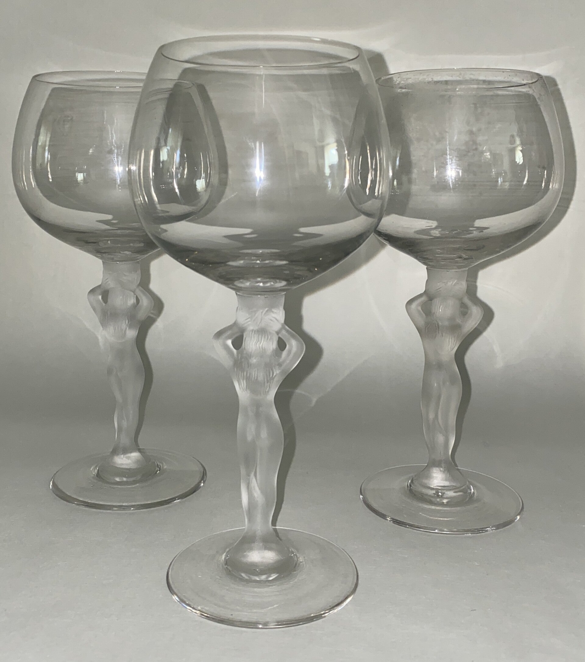 3 Franse kristallen Bayel wijnglazen met vrouwelijke figuren (bacchante Lalique glazen).