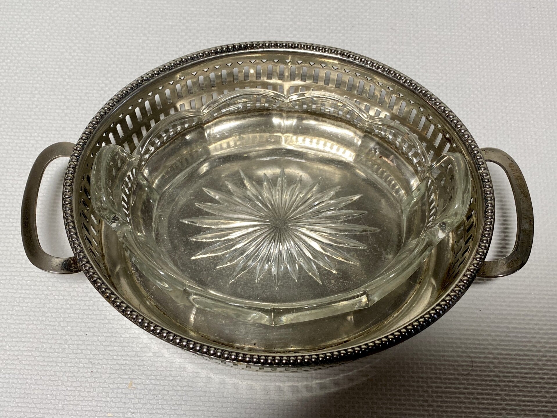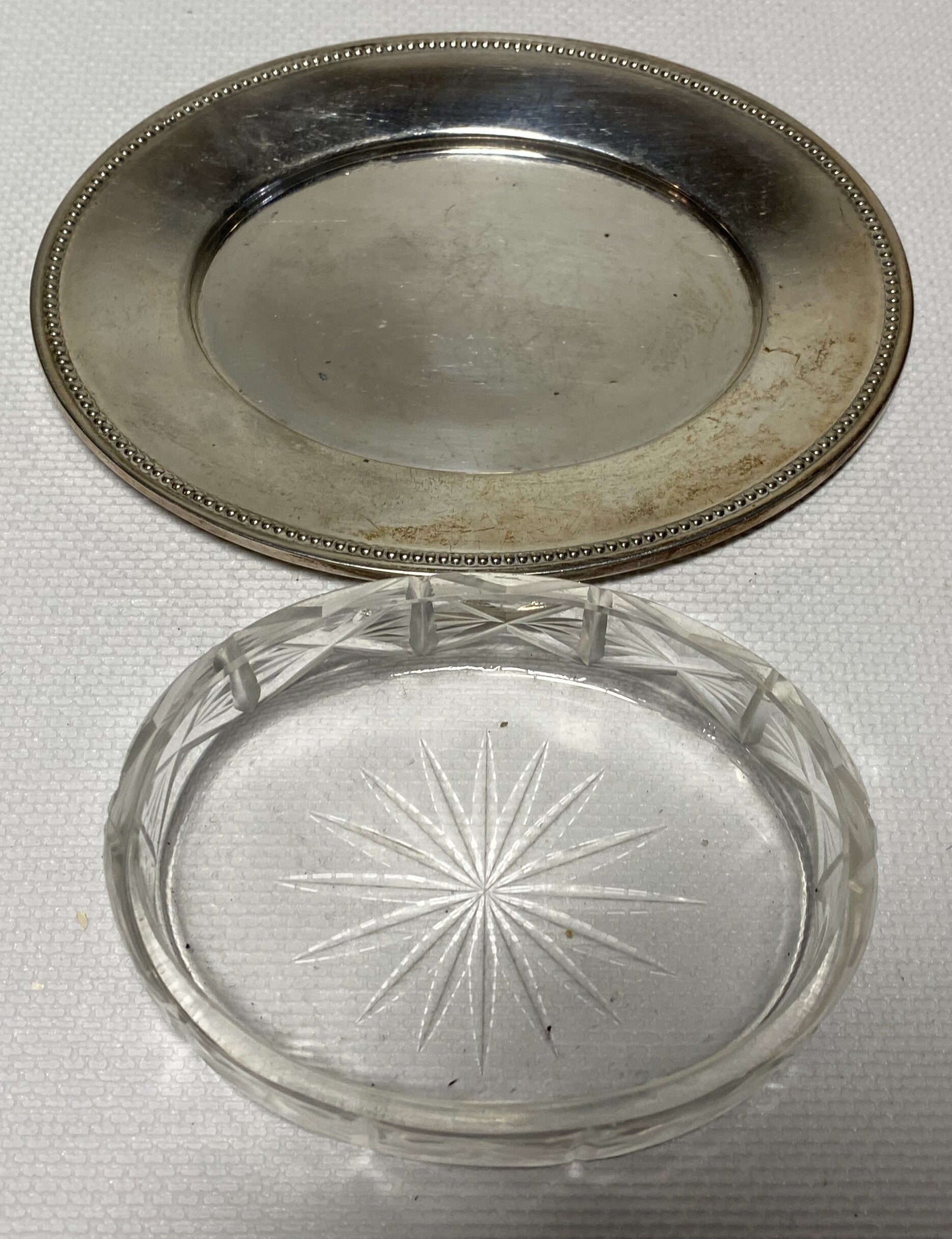 7 kristallen schalen op verzilverde dienbladen.