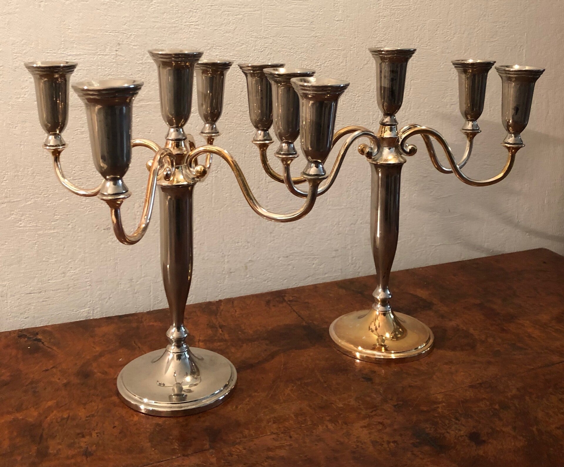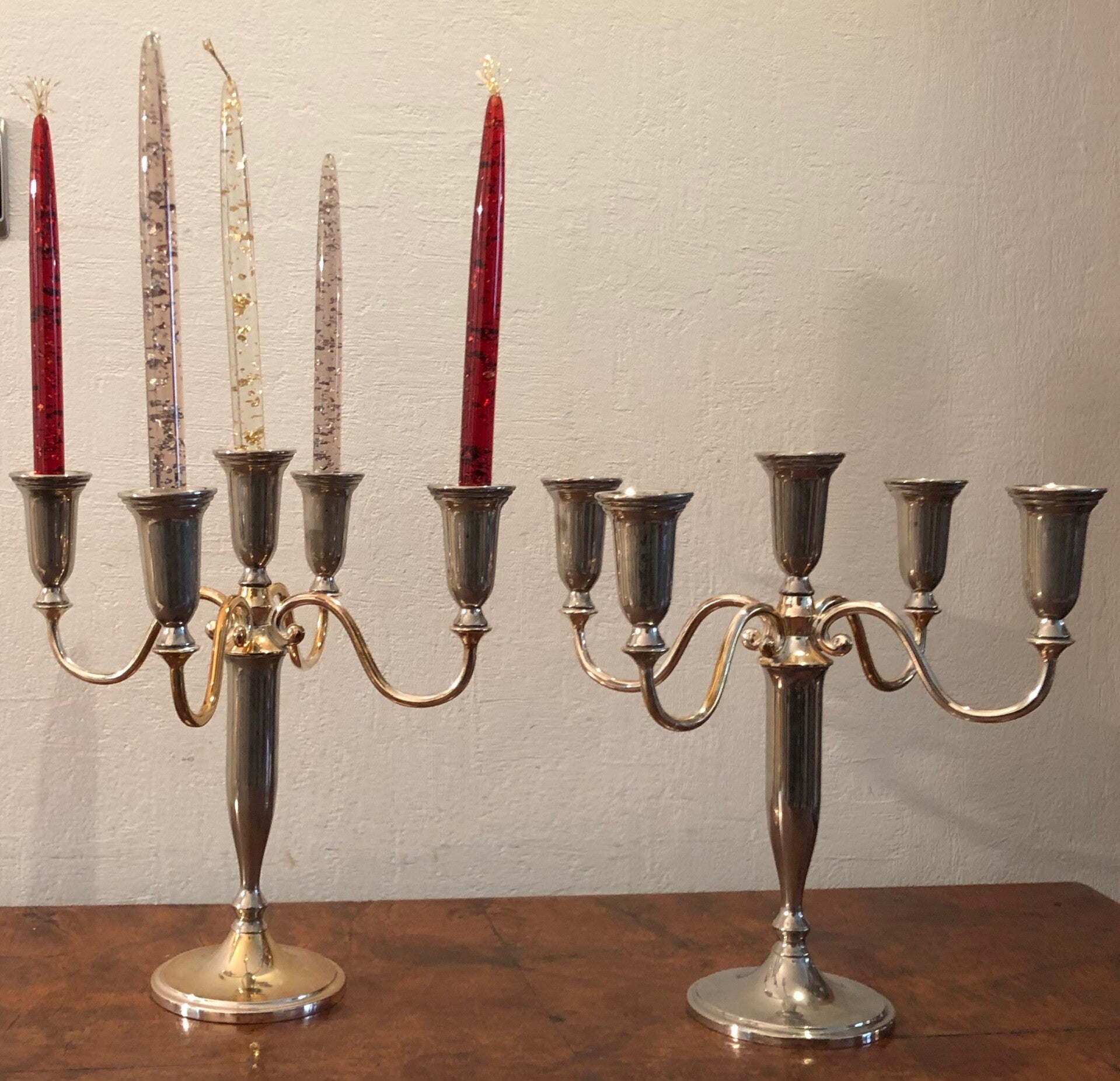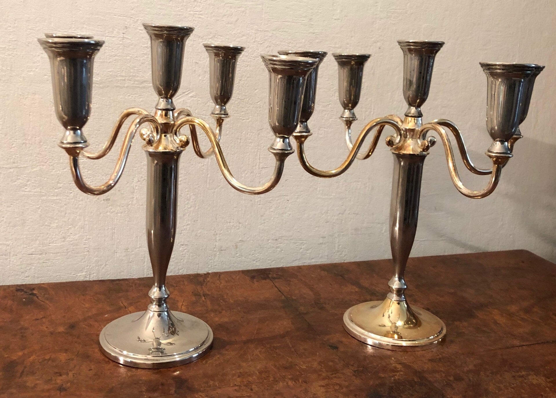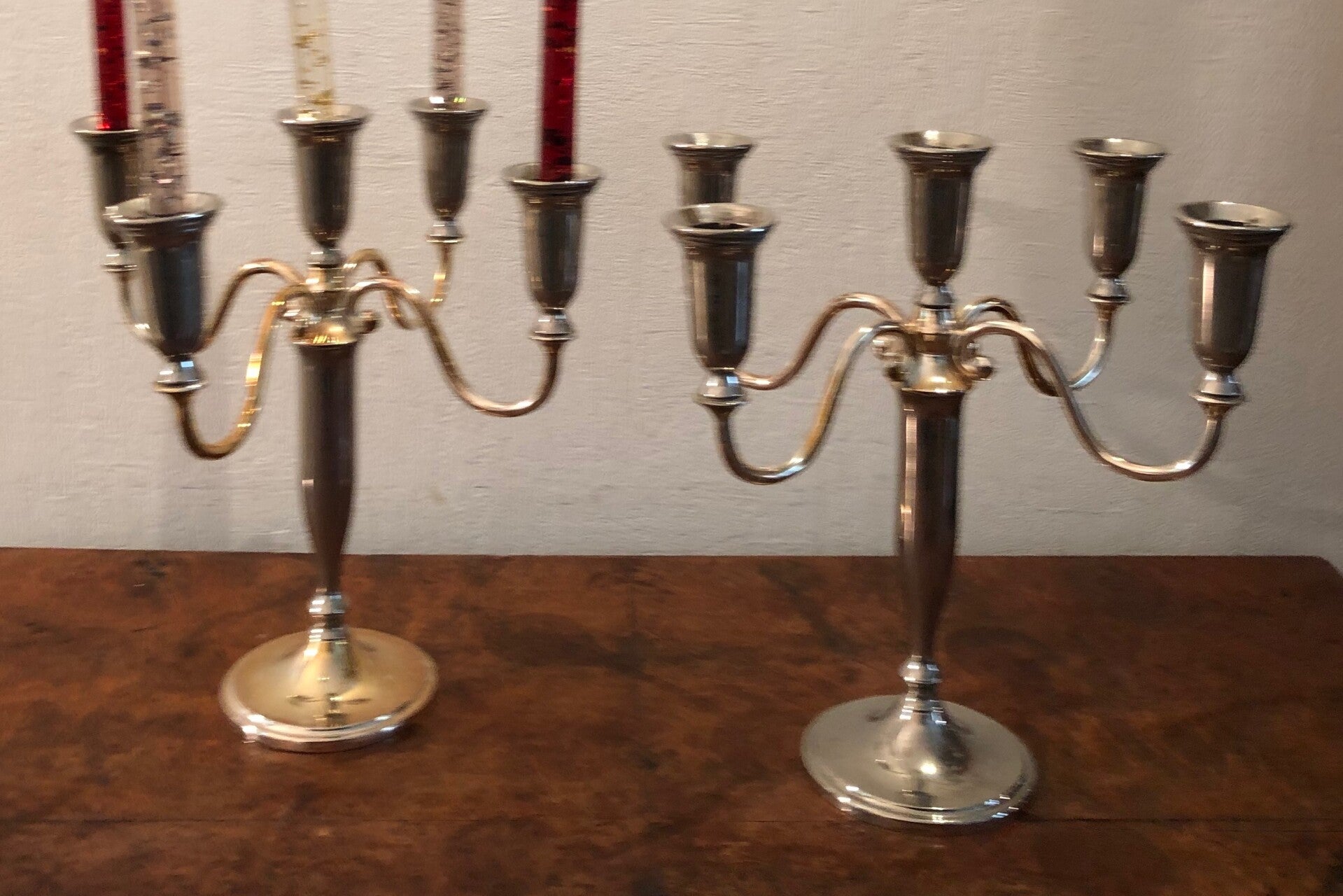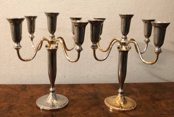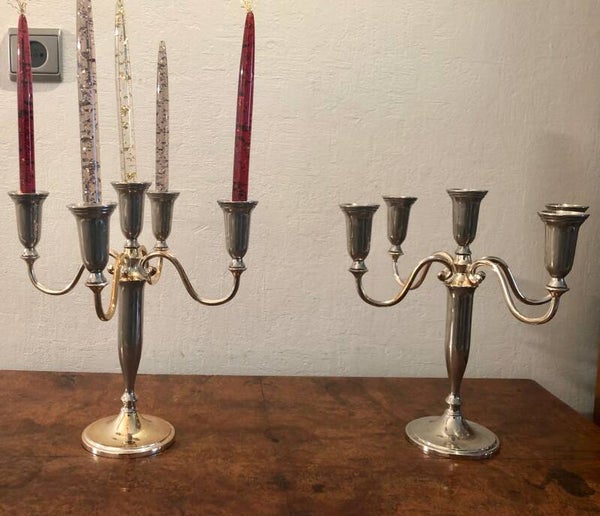 Paar bicolor verzilverde vijf-arm kandelaars.