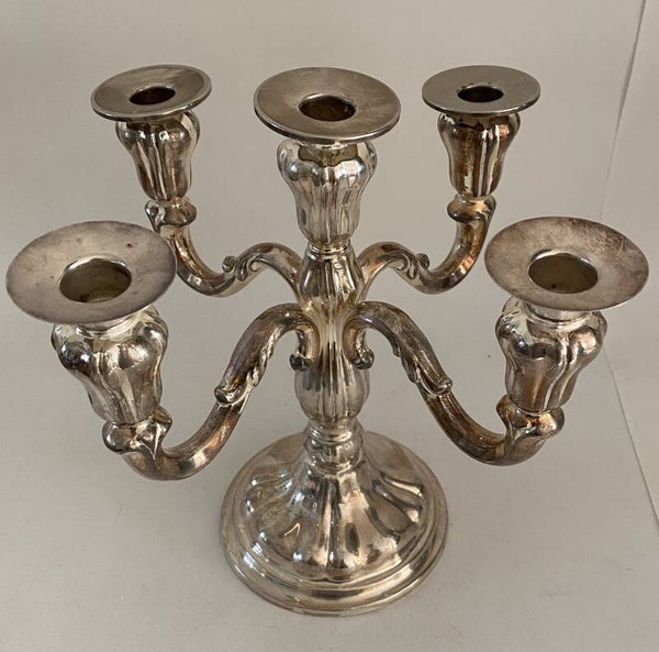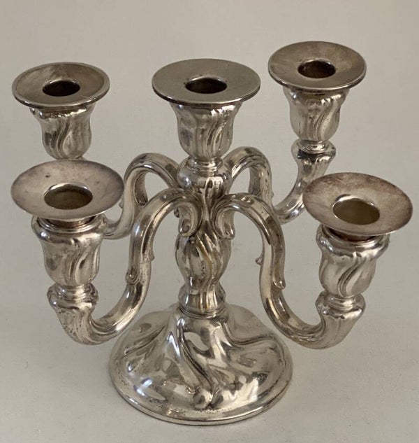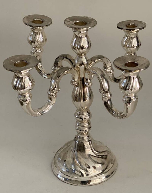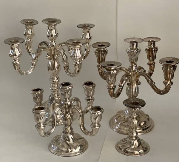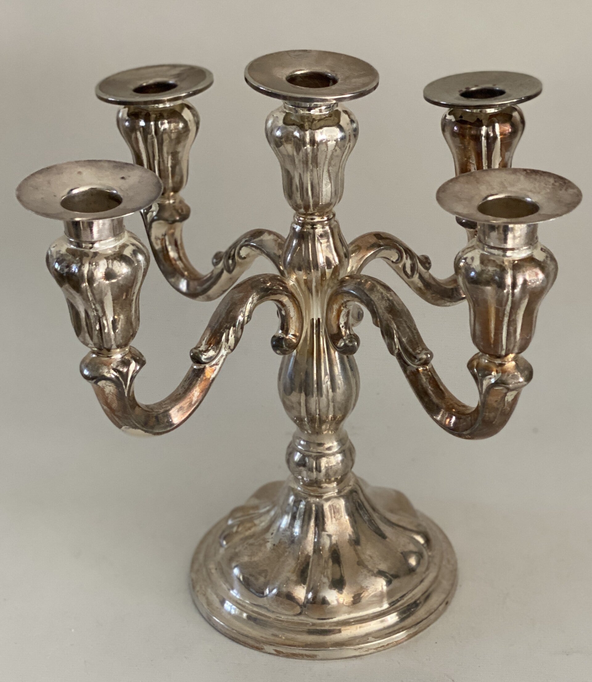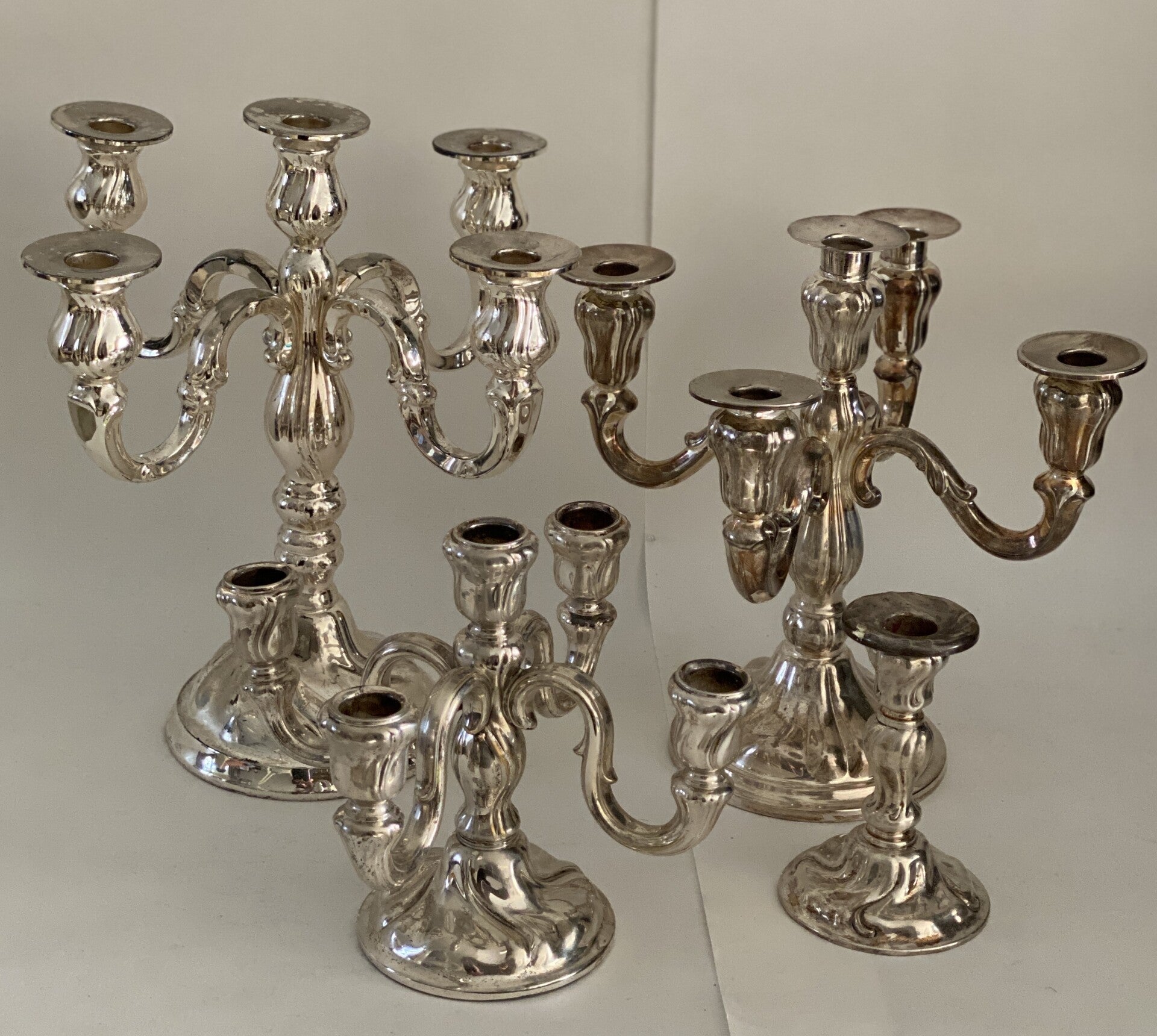 3 verzilverde vijf-armige kandelaars en een enkele kaars kandelaar.