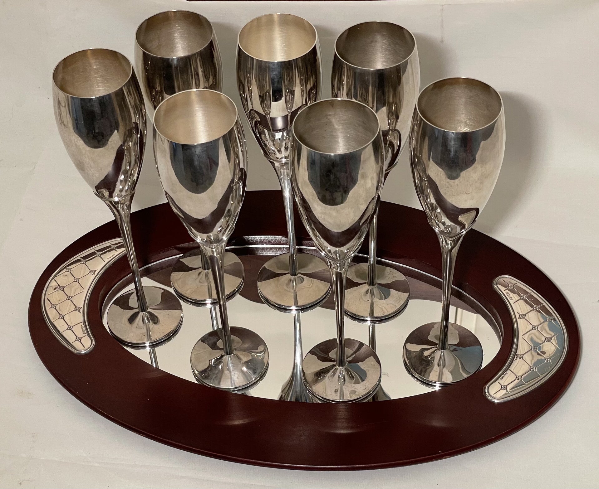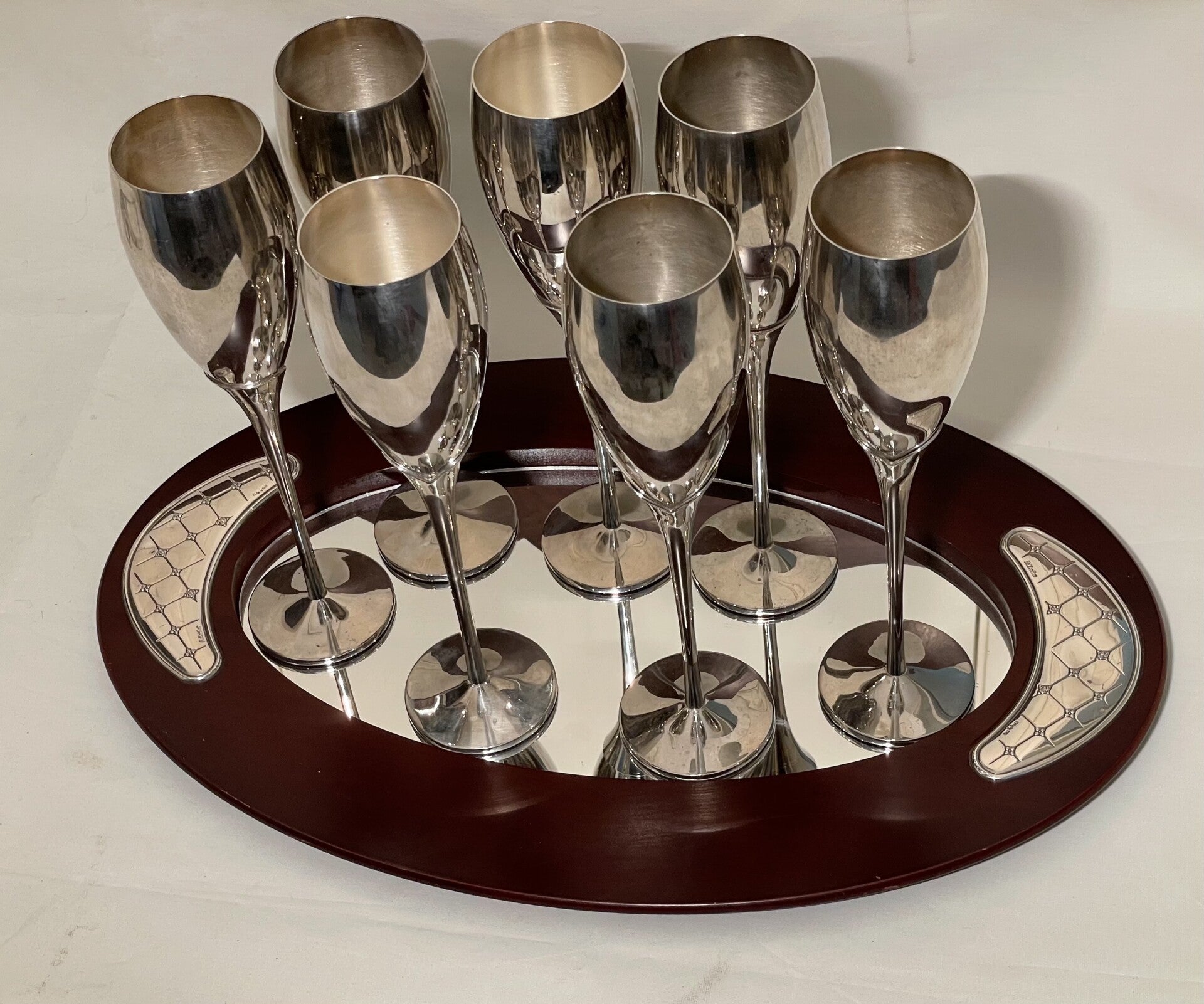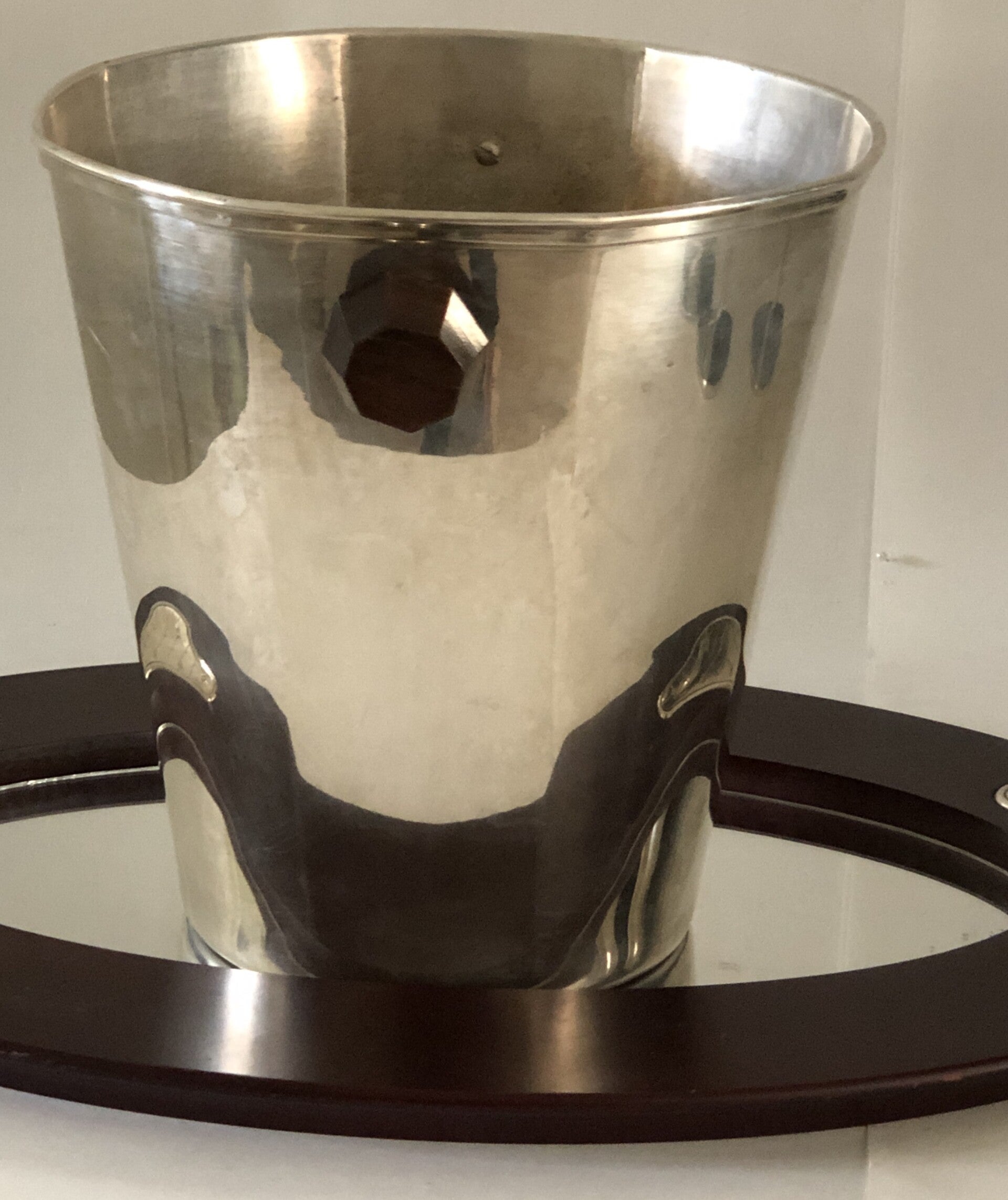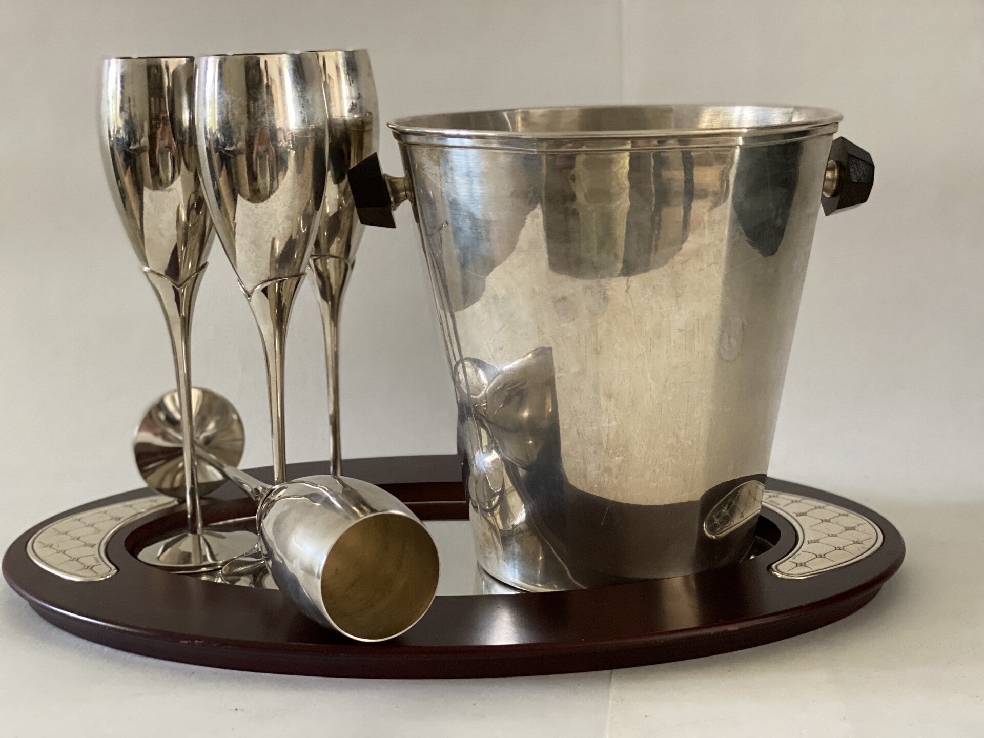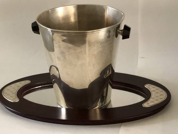 Verzilverde Art deco champagne set, bestaande uit 6 verzilverde champagne coupes, verzilverde champagne koeler met houten handvaten en houten en verzilverde spiegeldienblad.