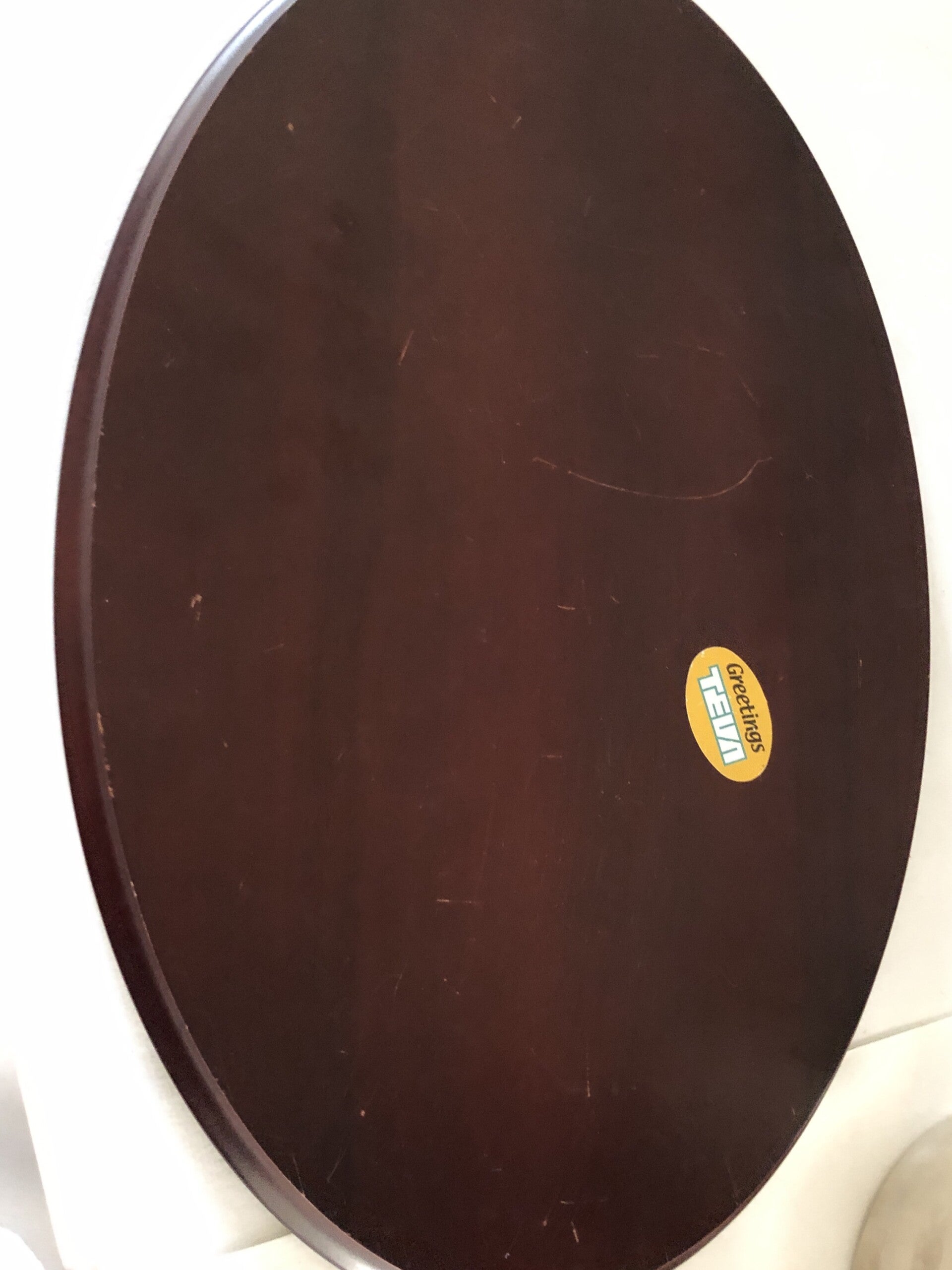 Dienblad: bestempeld: HaZorfim, en sticker met Greetings Teva.