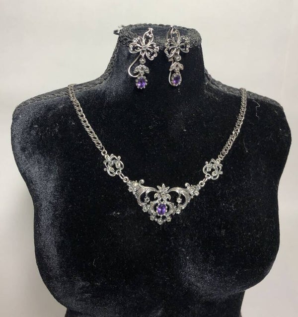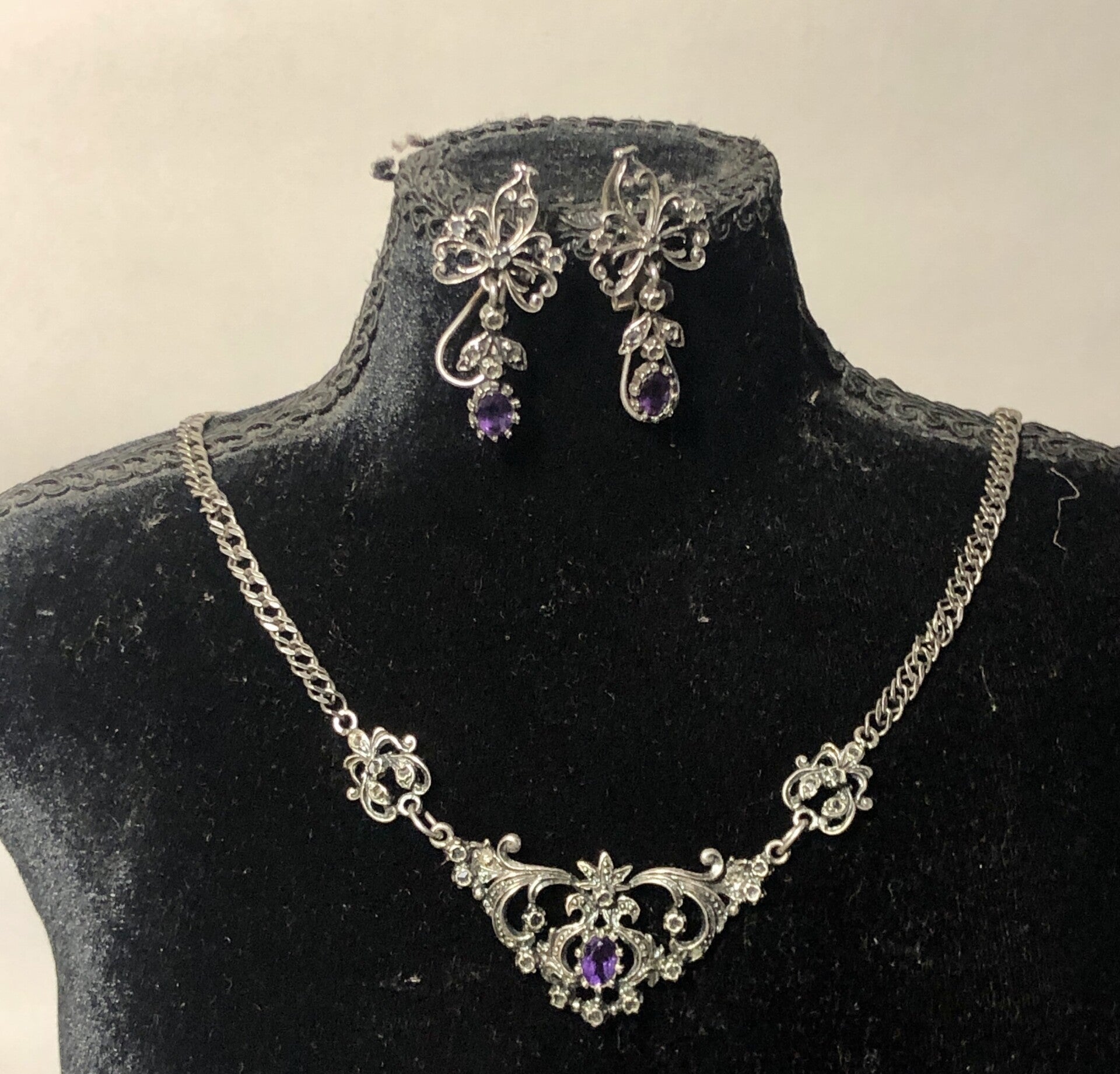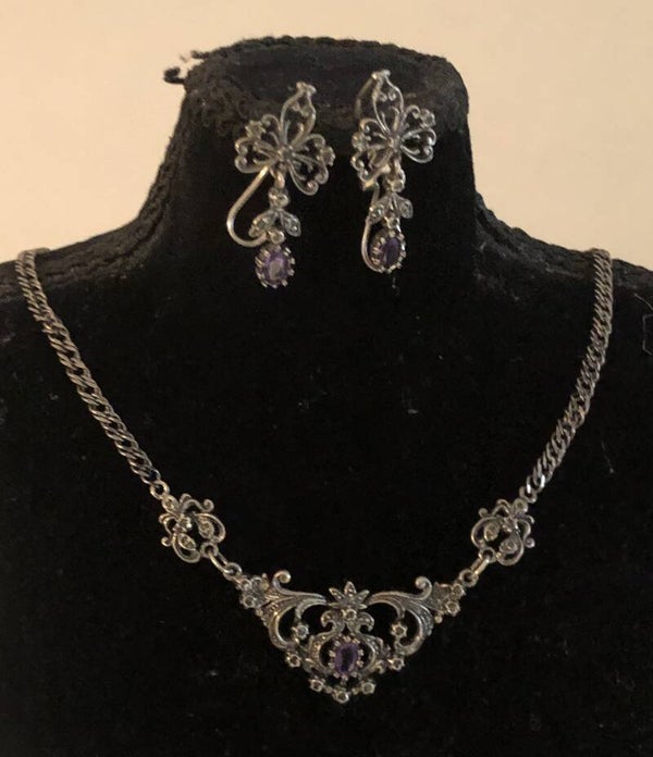 Antieke .925 zilveren collier en bijbehorende oorbellen met Amethist.