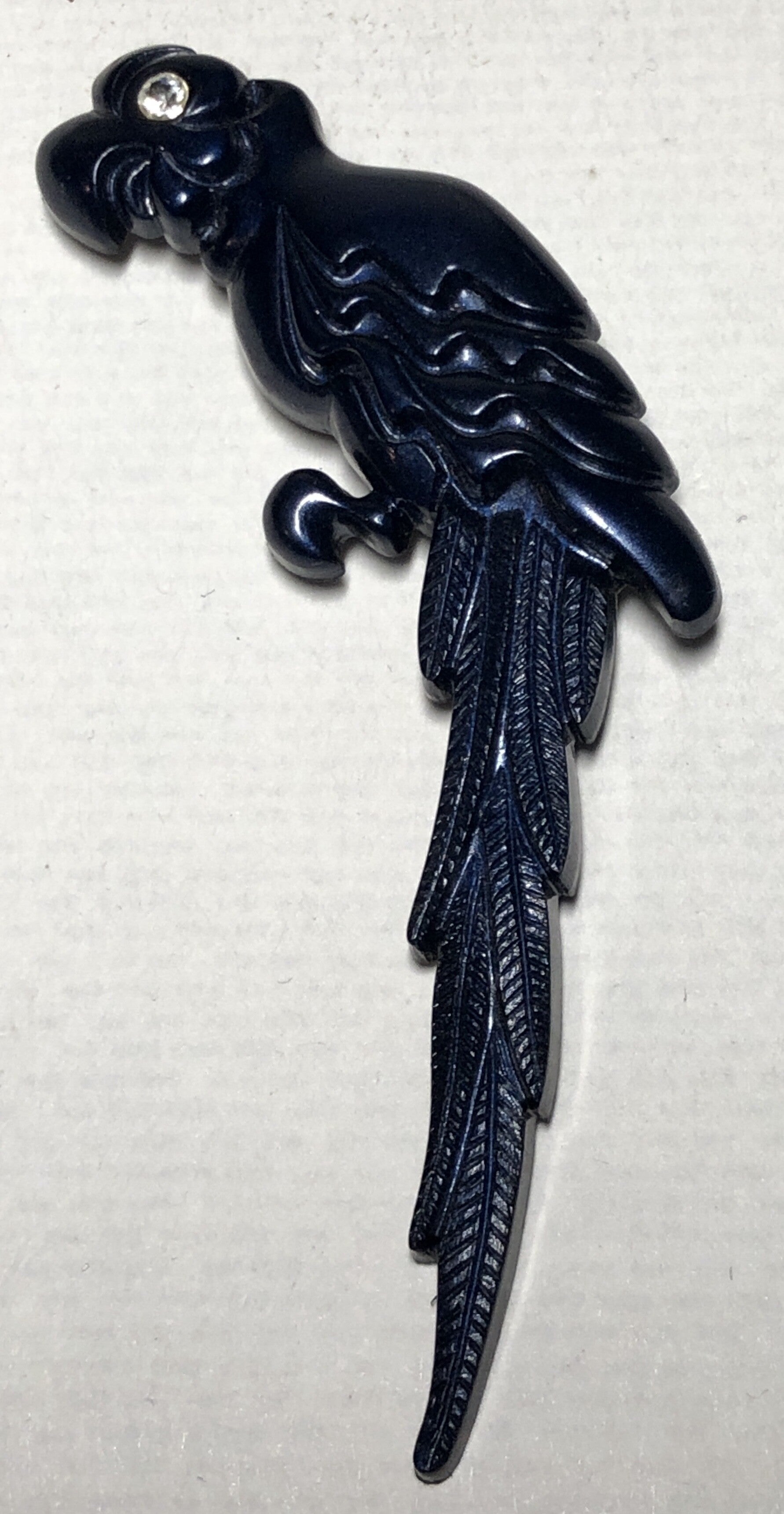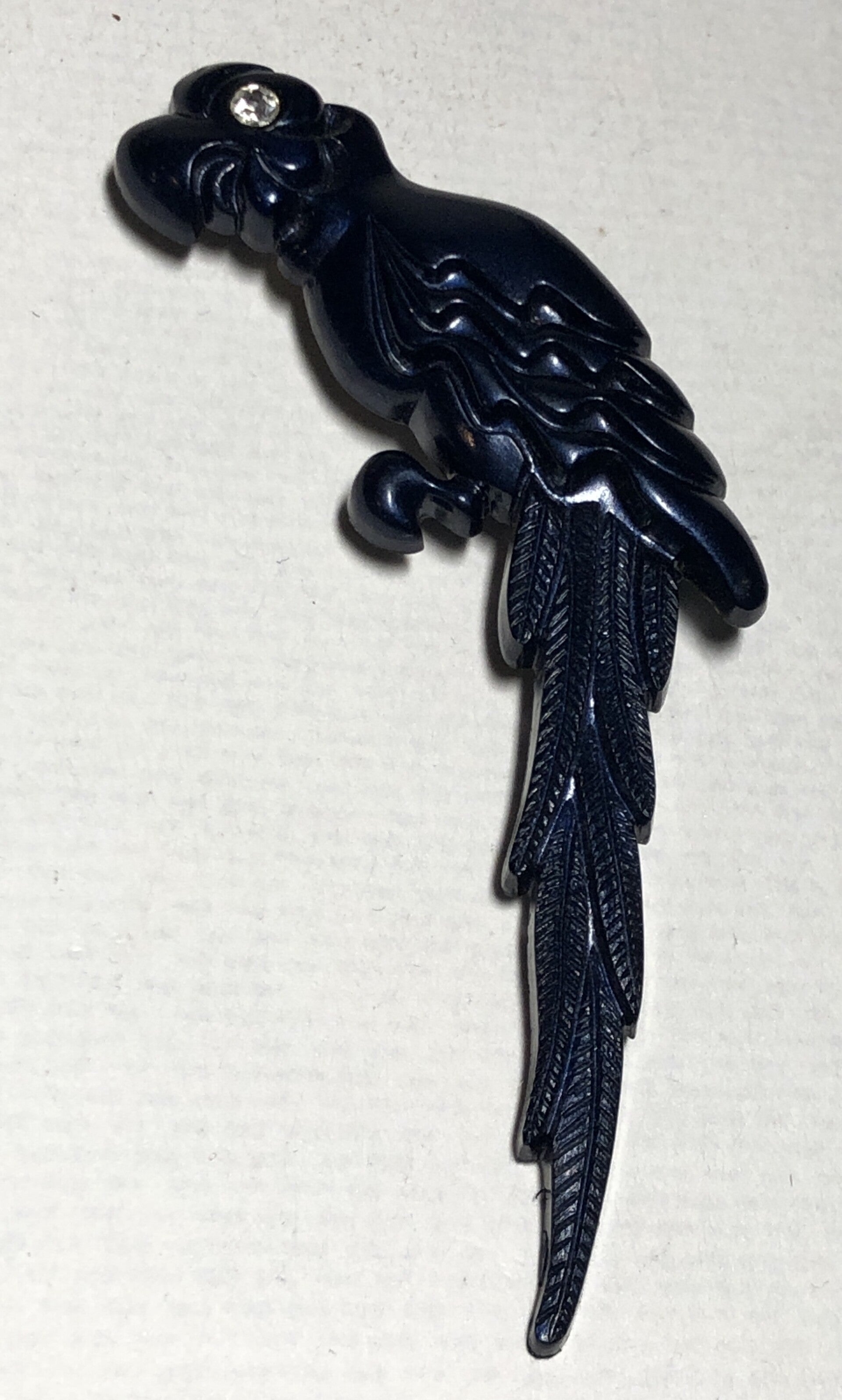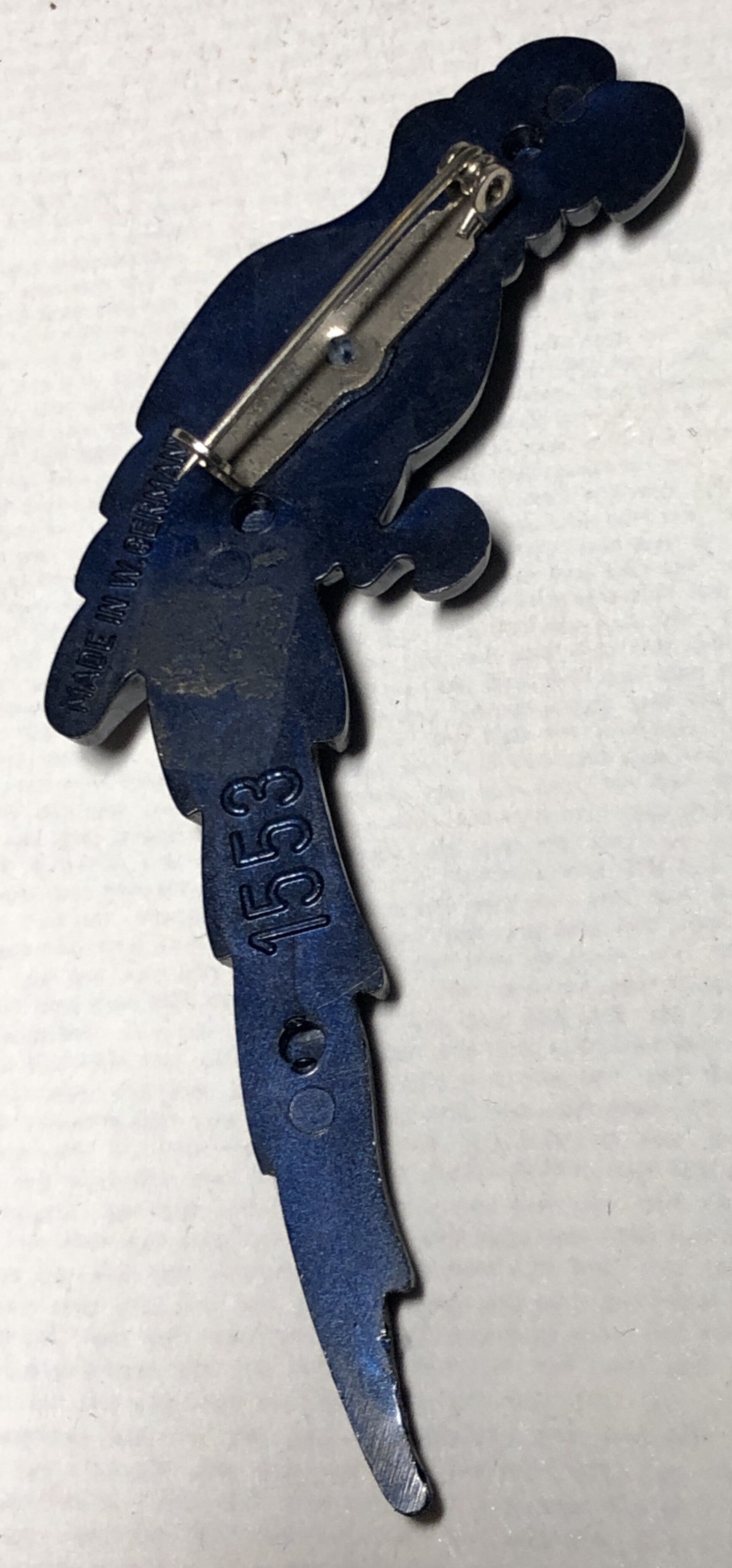 Vintage Duitse plastic Buch & Deichmann blauwe papegaai broche.
