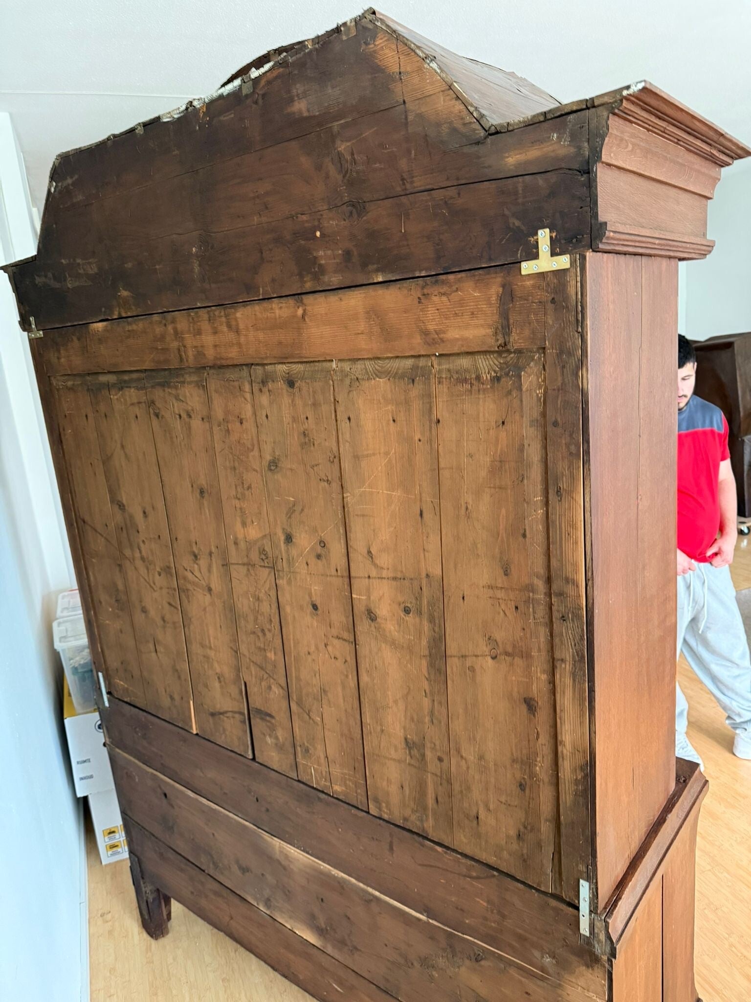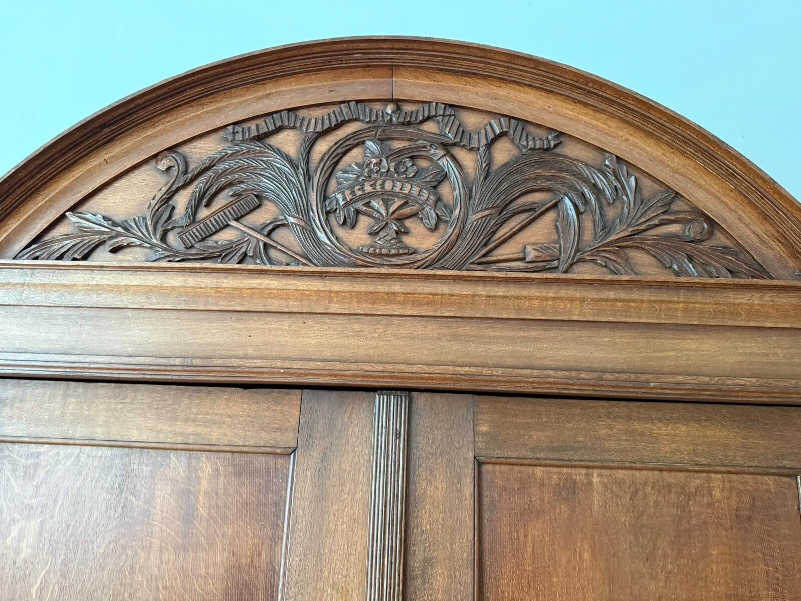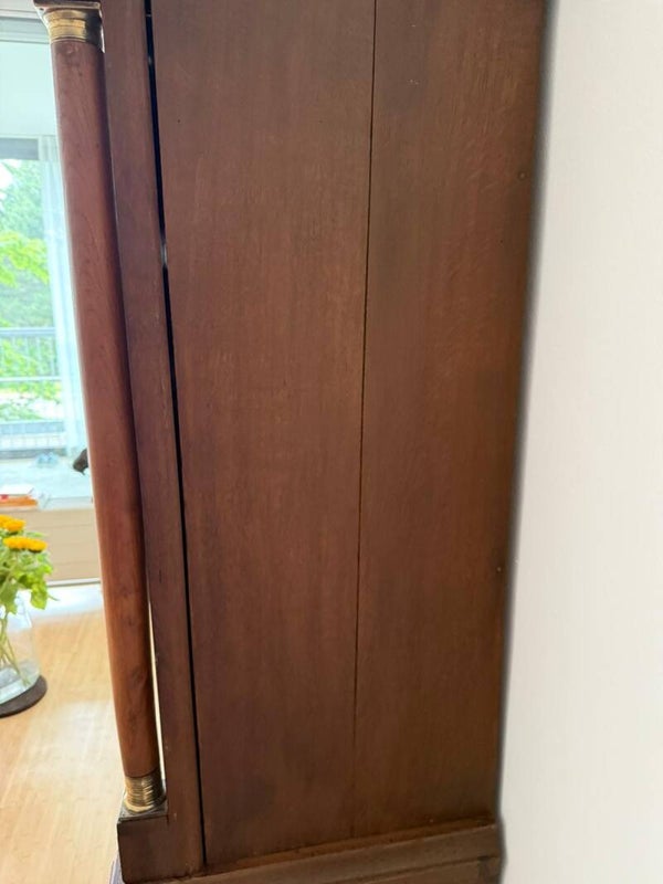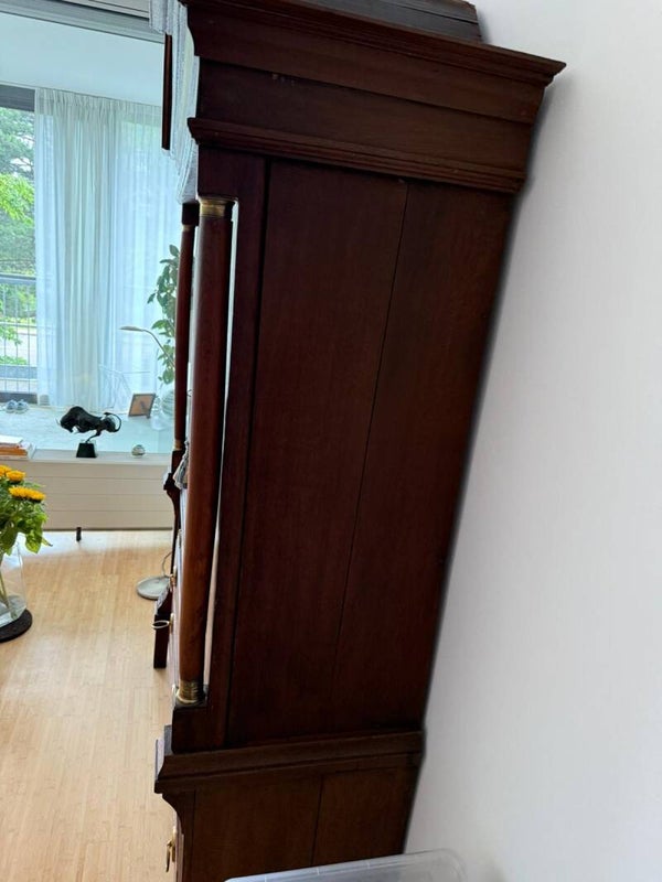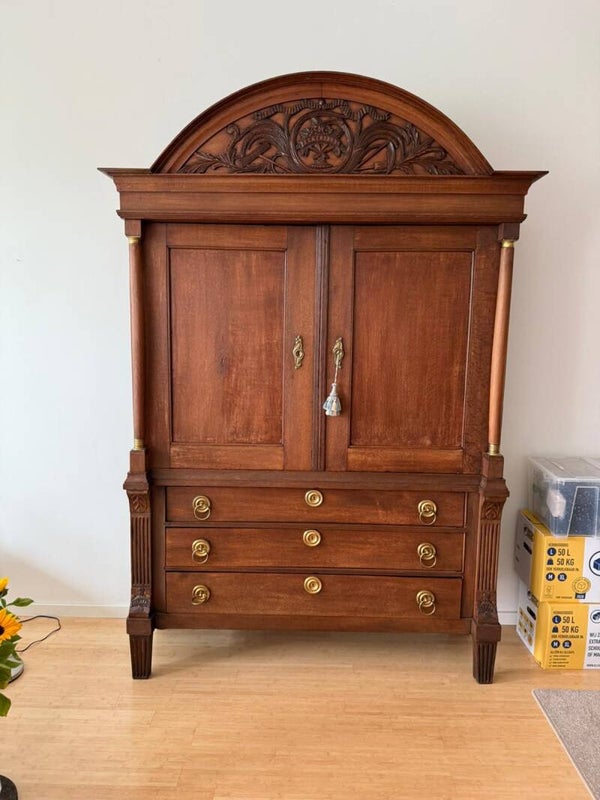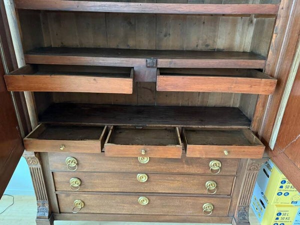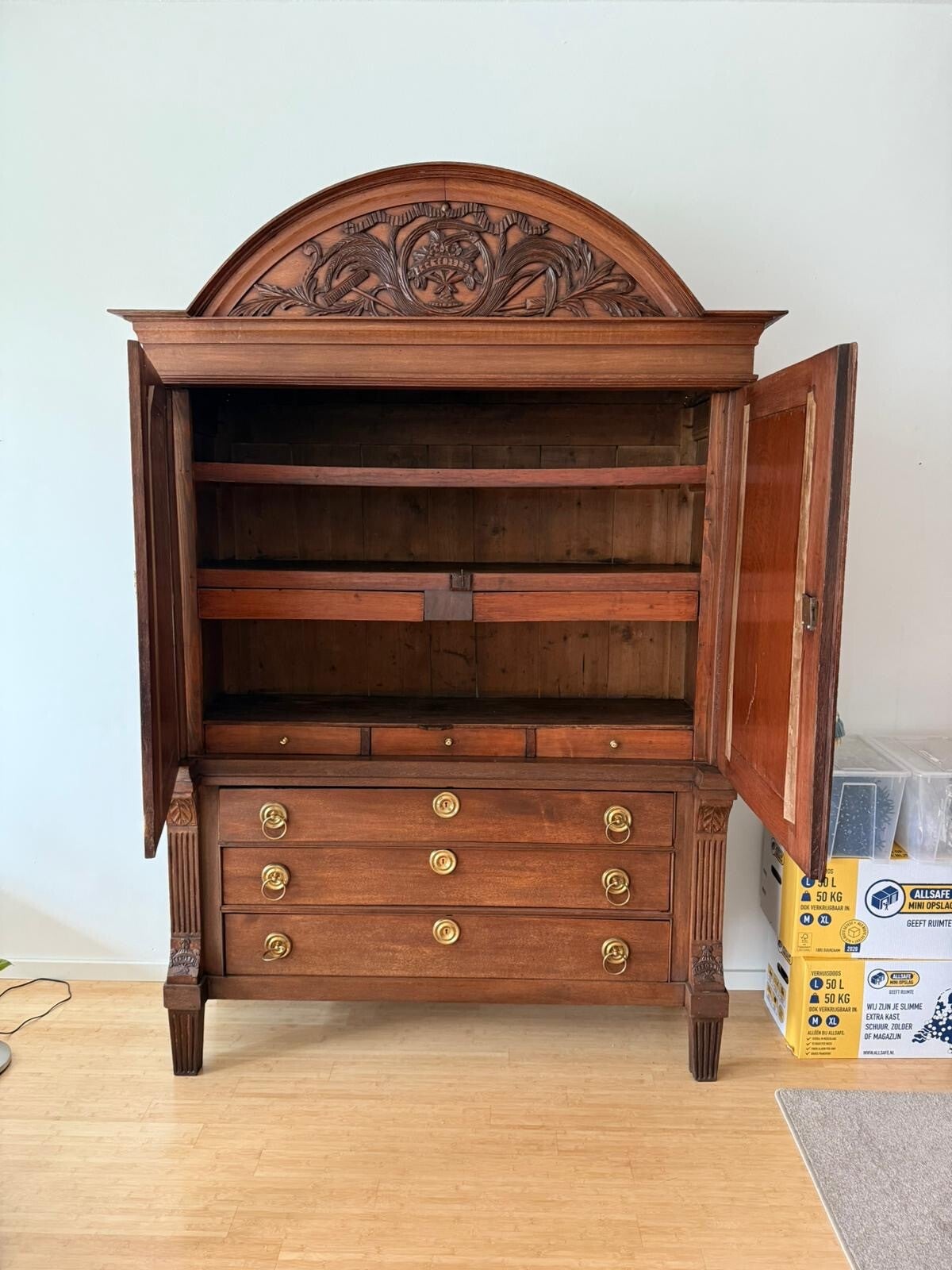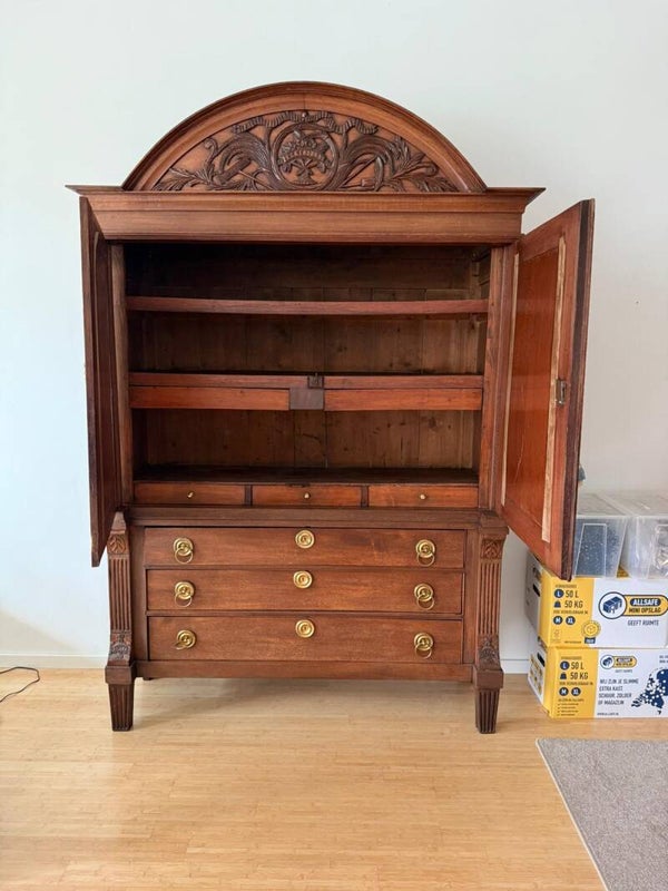 Eikenhout, gebogen geprofileerde kap met snijwerk in het fries van hoornen des overvloeds en bladmotieven, gecanneleerde stijlen, de onderkast drie laden met latoenkoperen ringbeslag, gecanneleerde stijlen met snijwerk van een vaas op voet, rustend op gecanneleerde conische poten, h 270 x b 60 cm