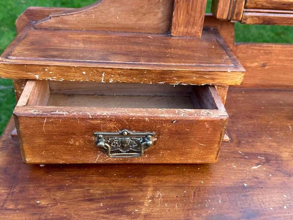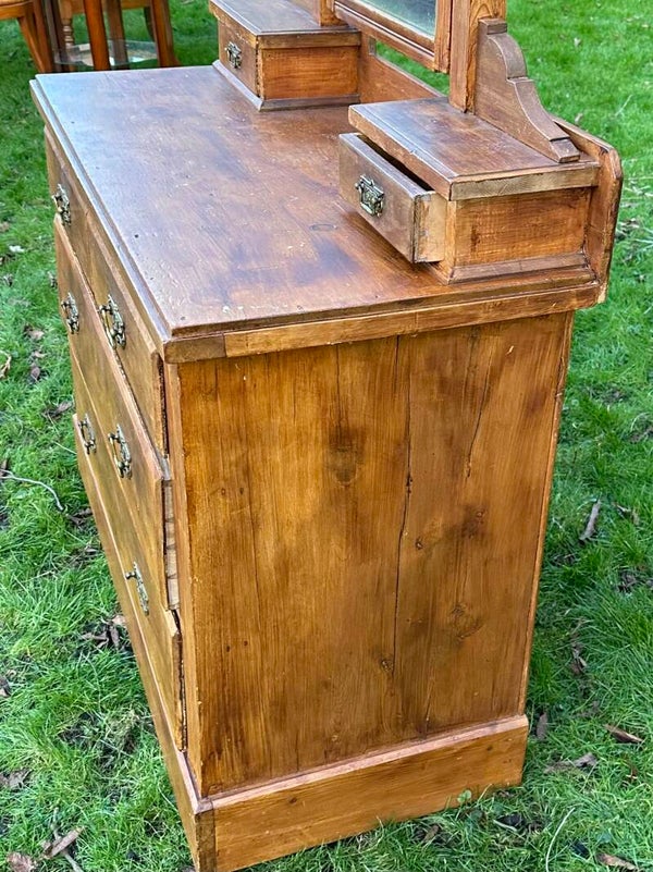 Antieke Tasmaanse Huon grenen kaptafel, voorzien van twee frisladen en vier snuisterijen.
