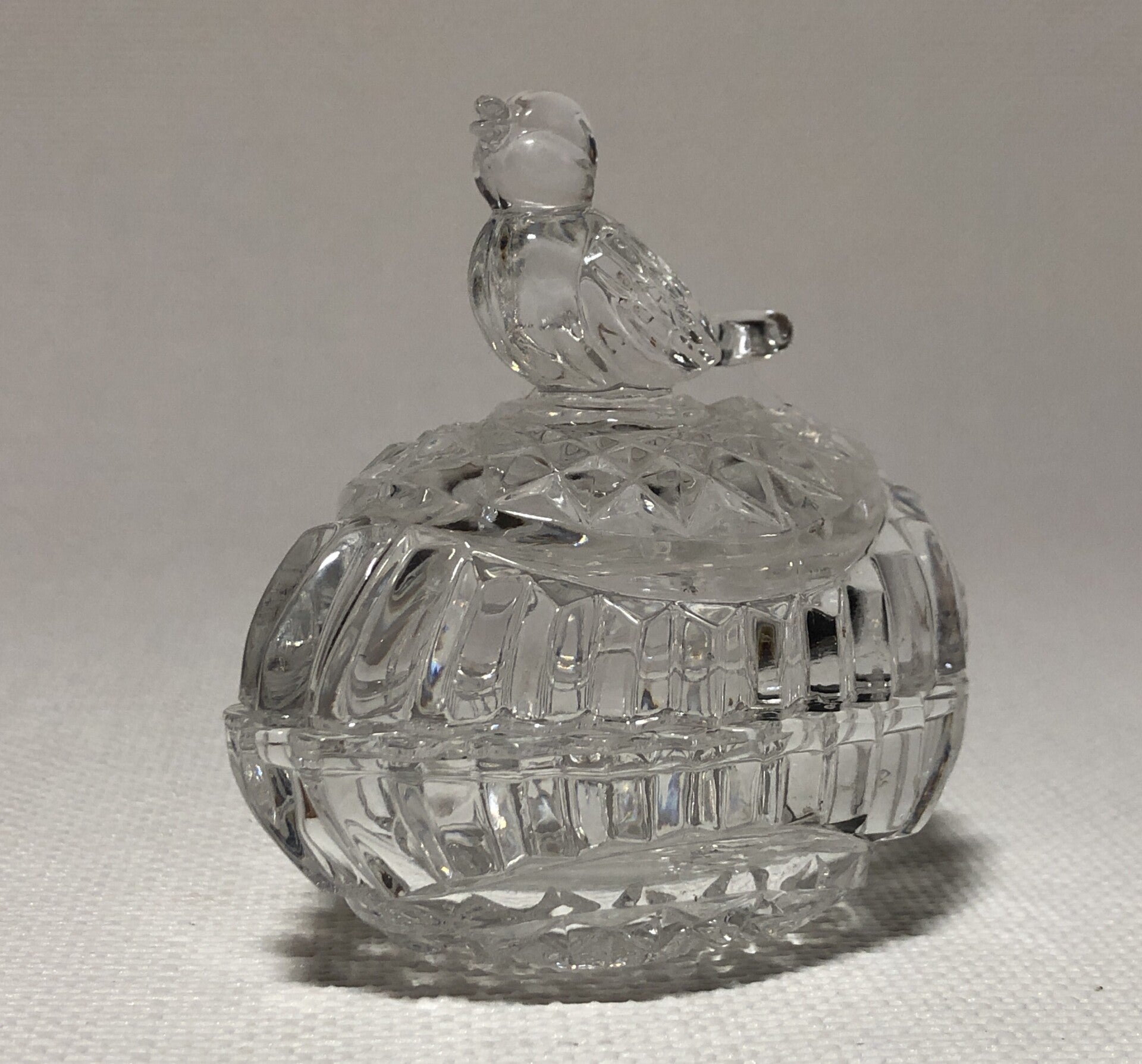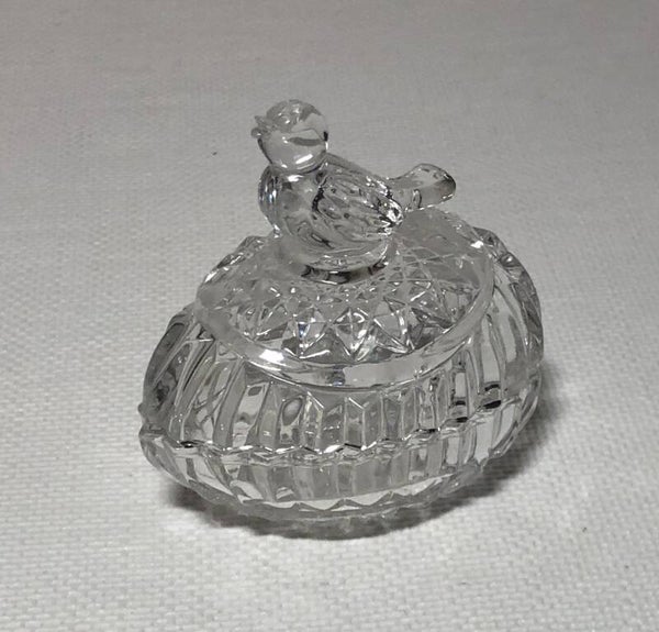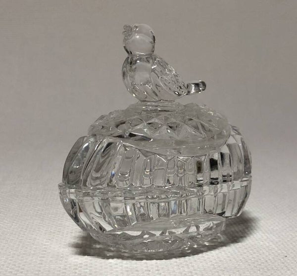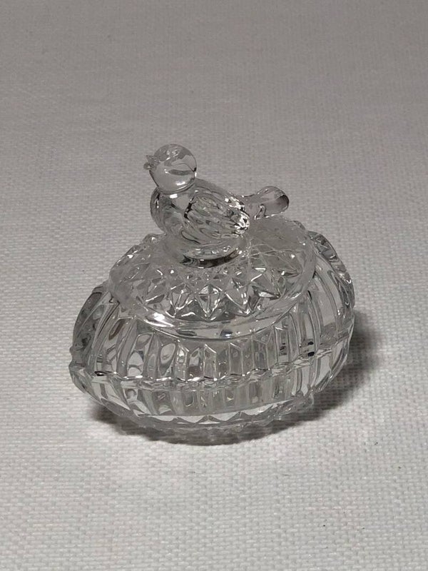 Kristallen ei-vormige juwelenkistje met vogeldecoratie.
