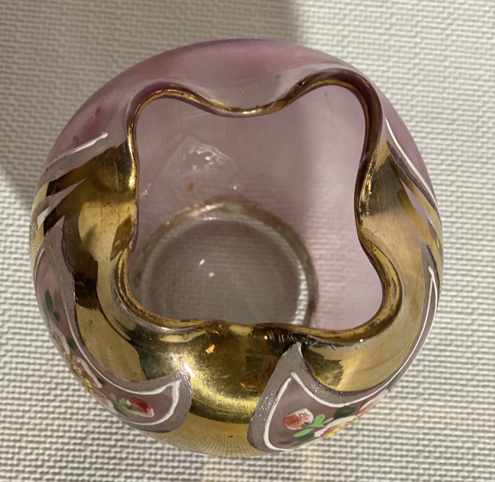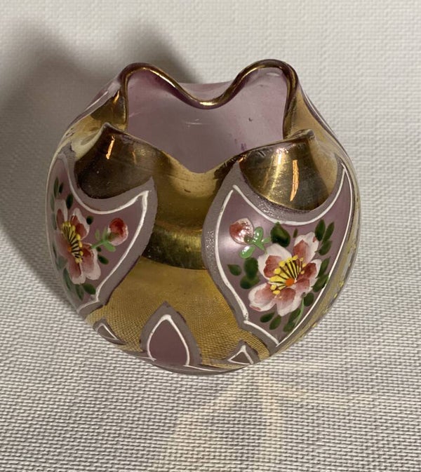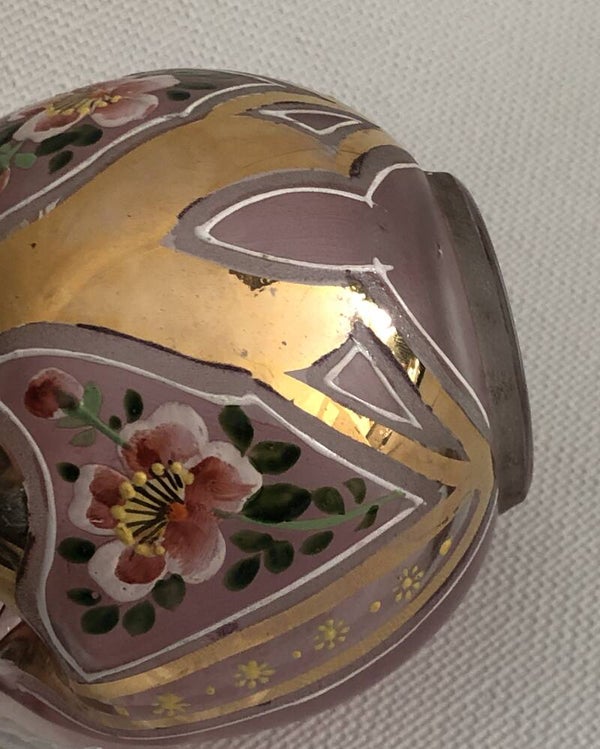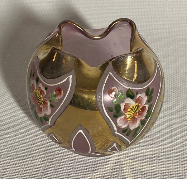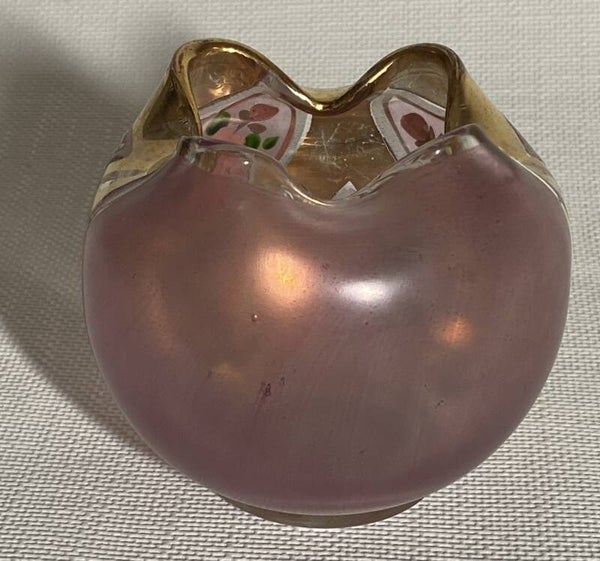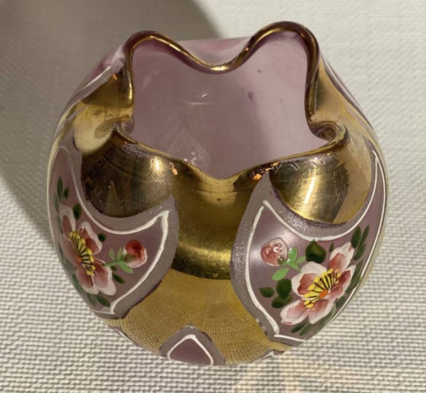 Franse Art Nouveau gematteerd meerlagige glazen "Iris" Bolvaas met geëmailleerde bloemdecoratie en gelobde rand.