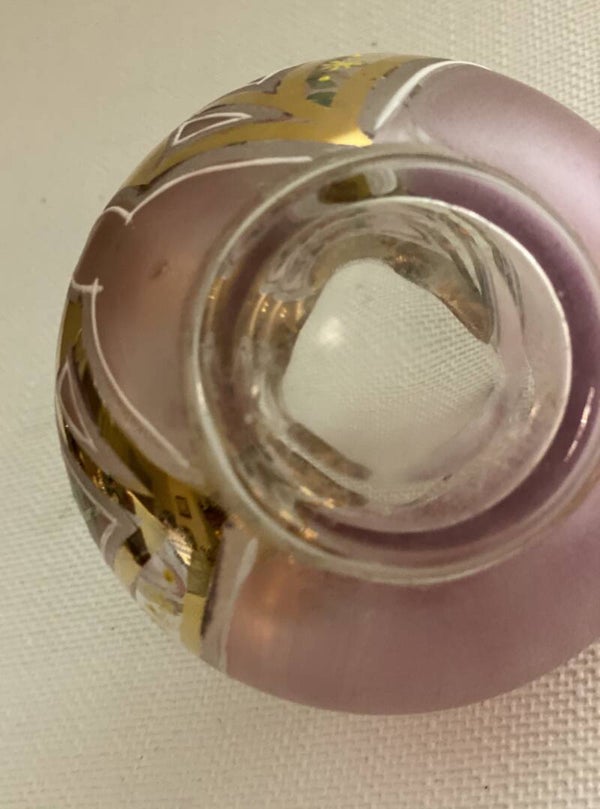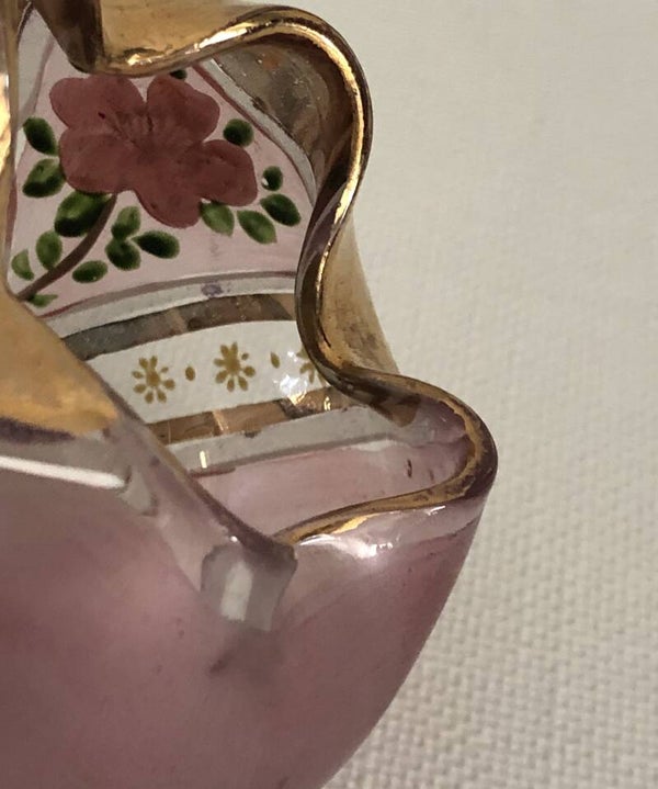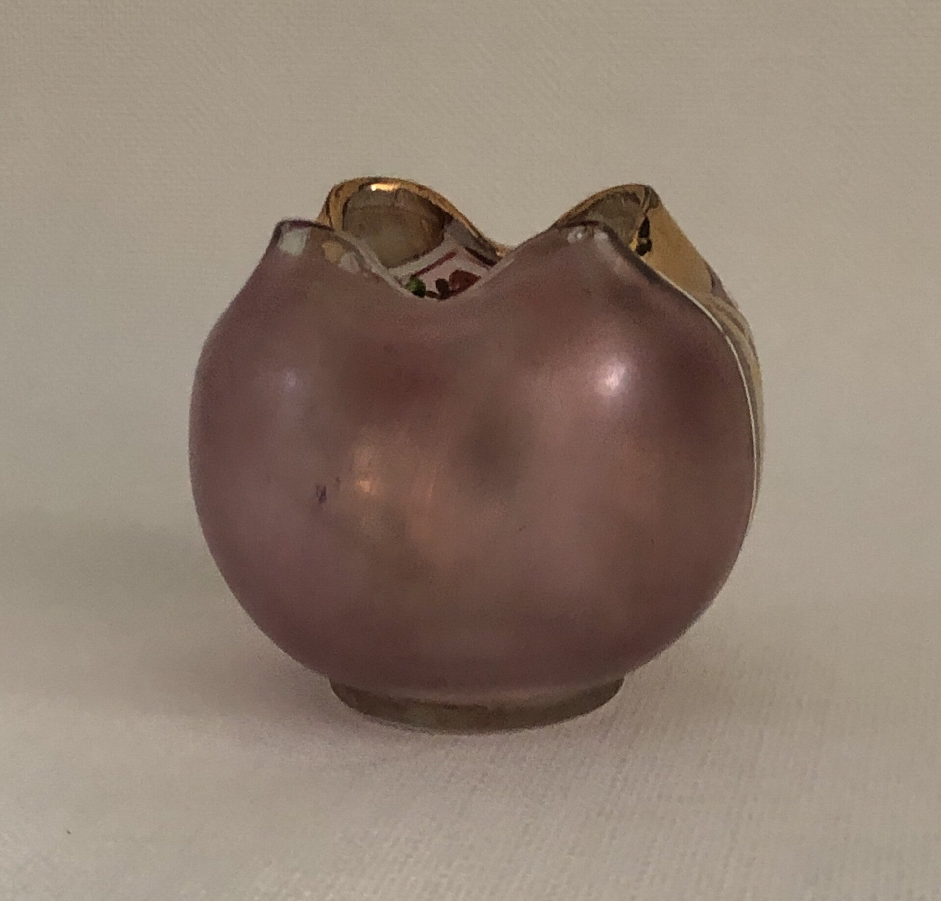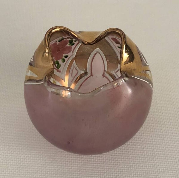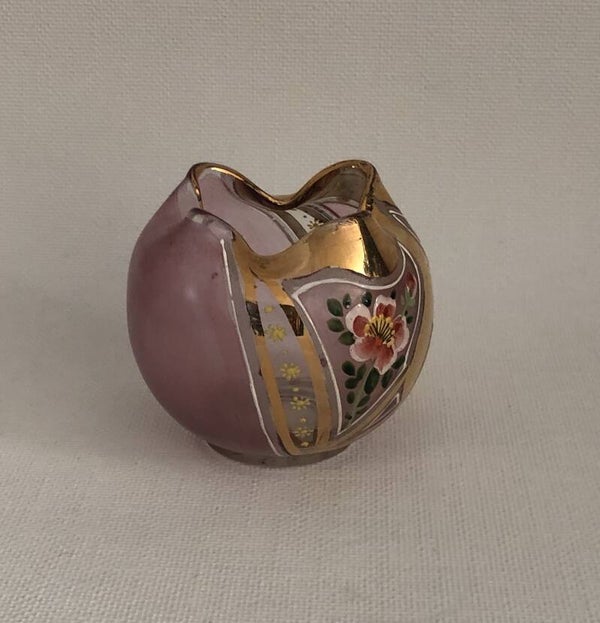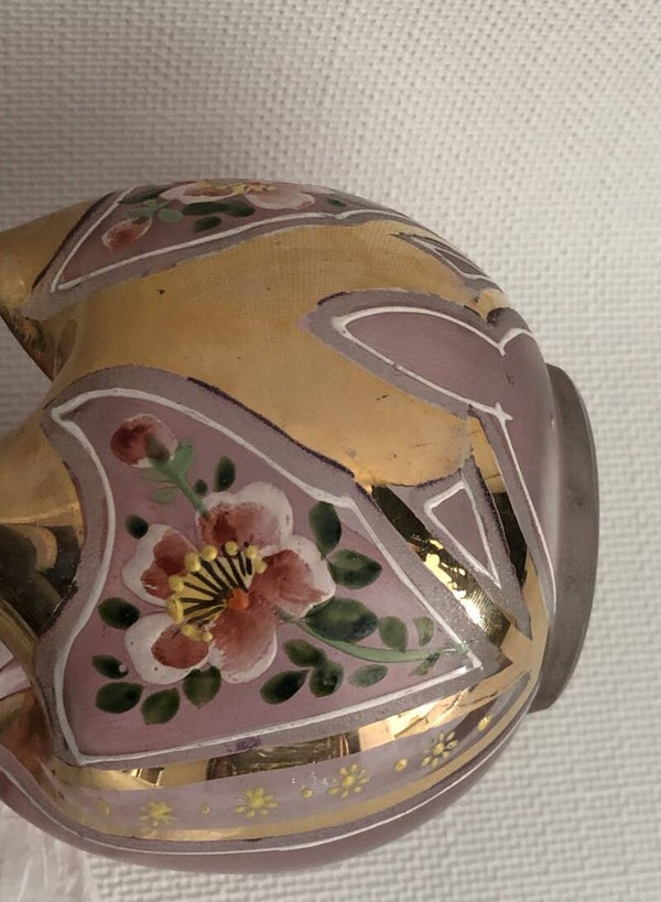 Franse Art Nouveau gematteerd meerlagige glazen "Iris" Bolvaas met geëmailleerde bloemdecoratie en gelobde rand.