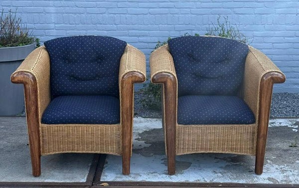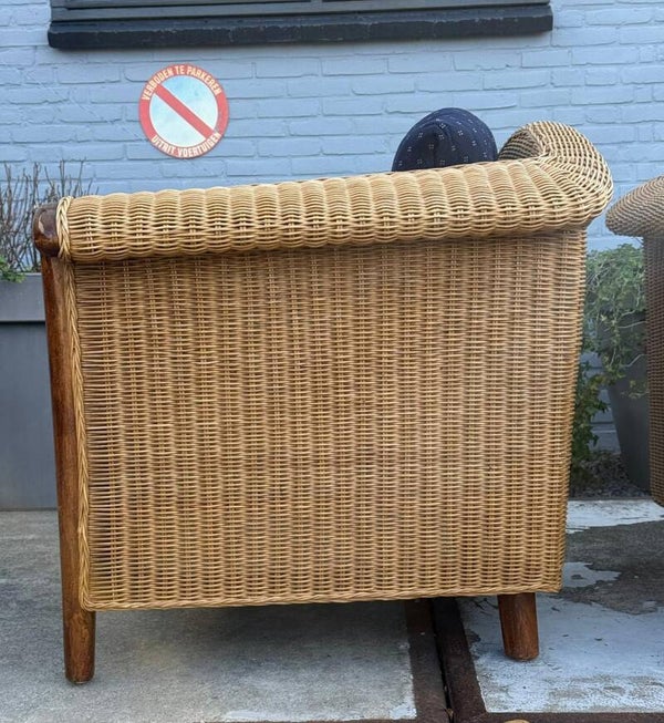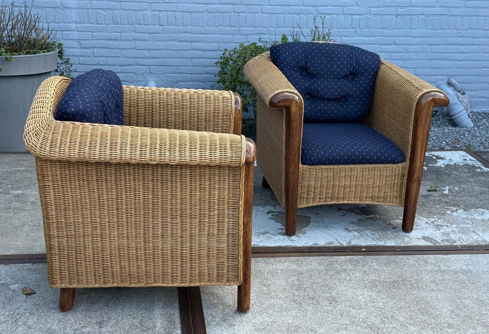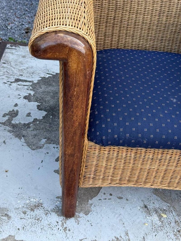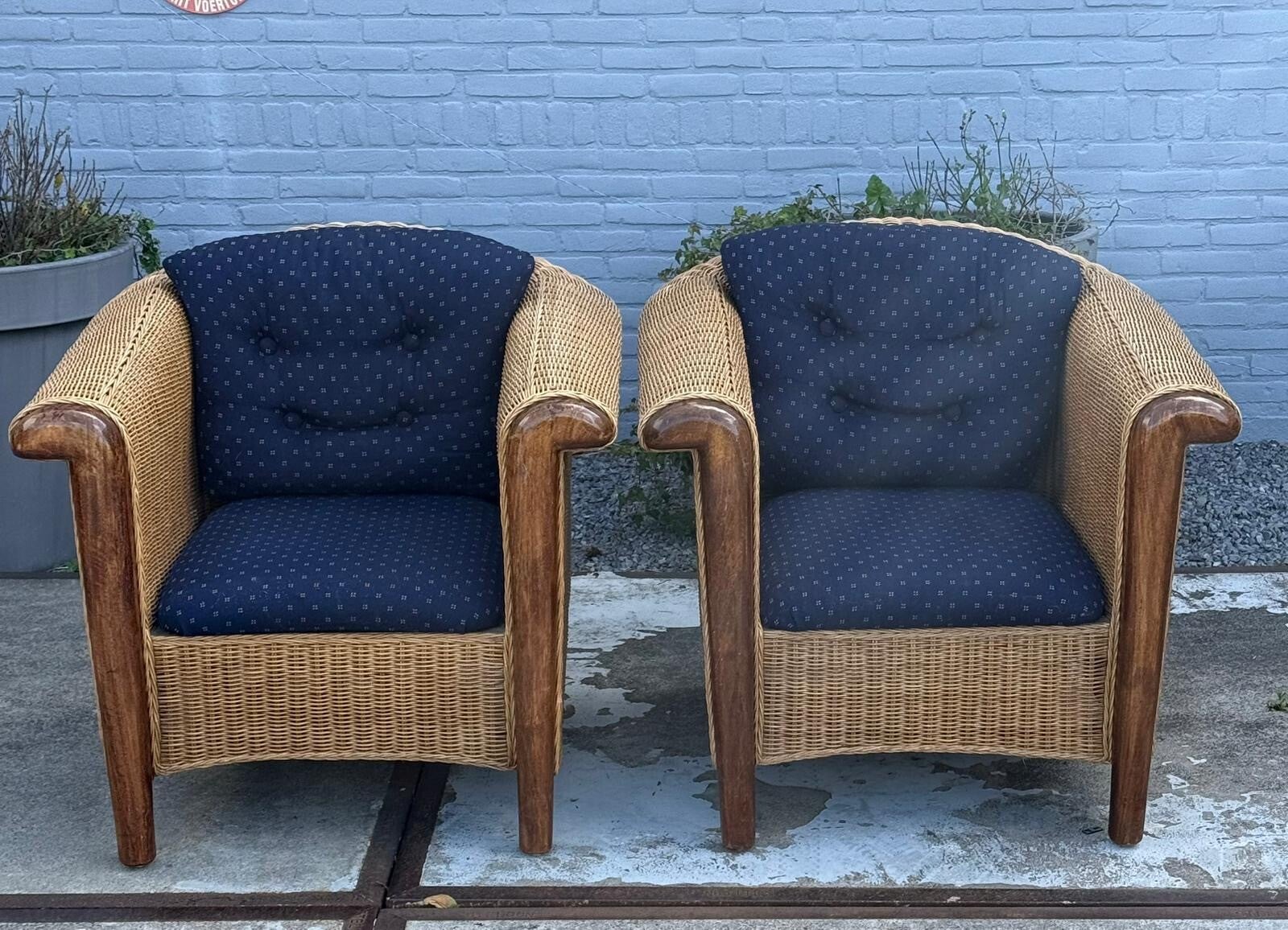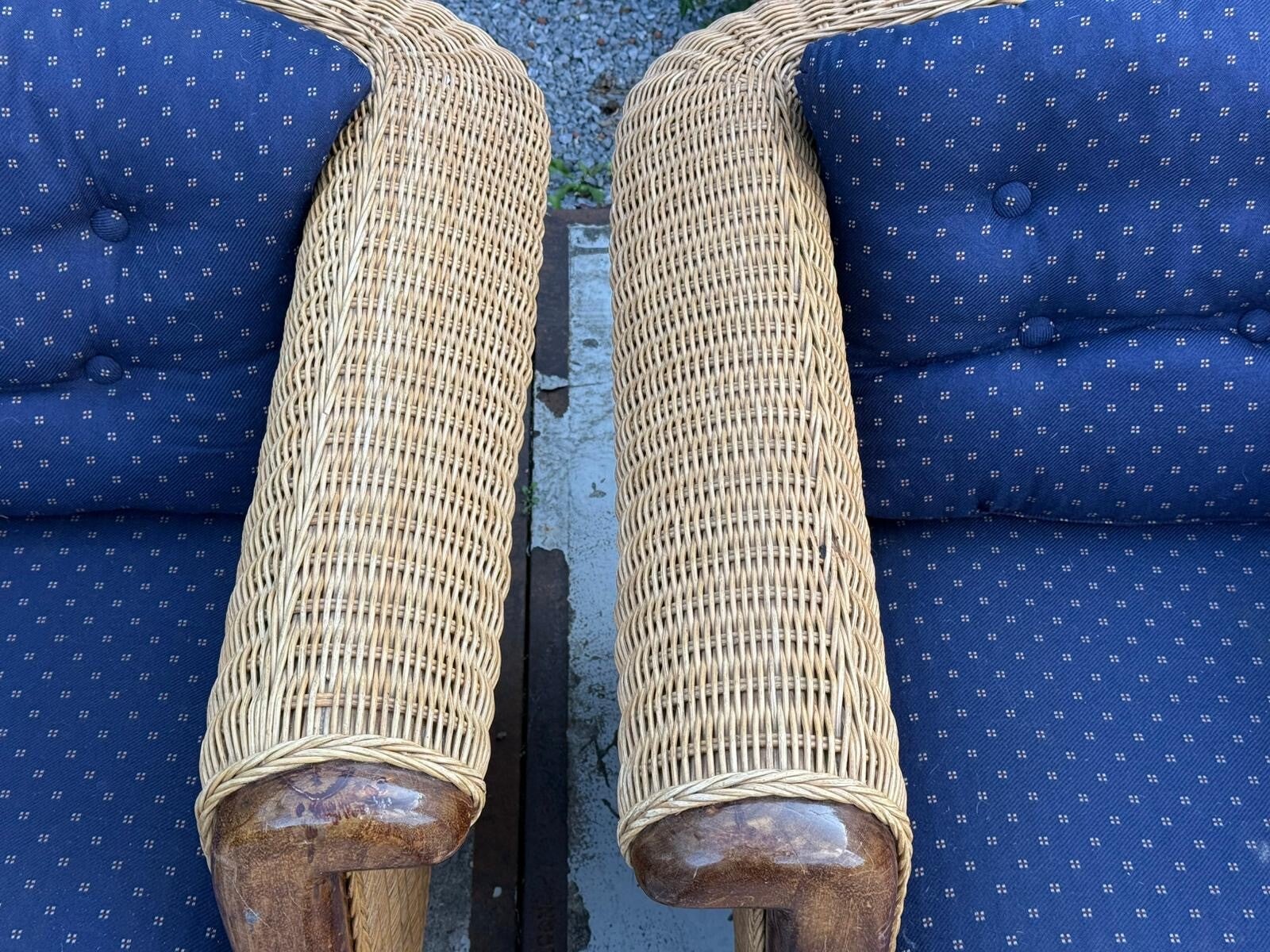 Pair of large wicker and bamboo with wood garden or patio chairs in excellent condition. Dimenstion:H 82x L 86 X63 cm.