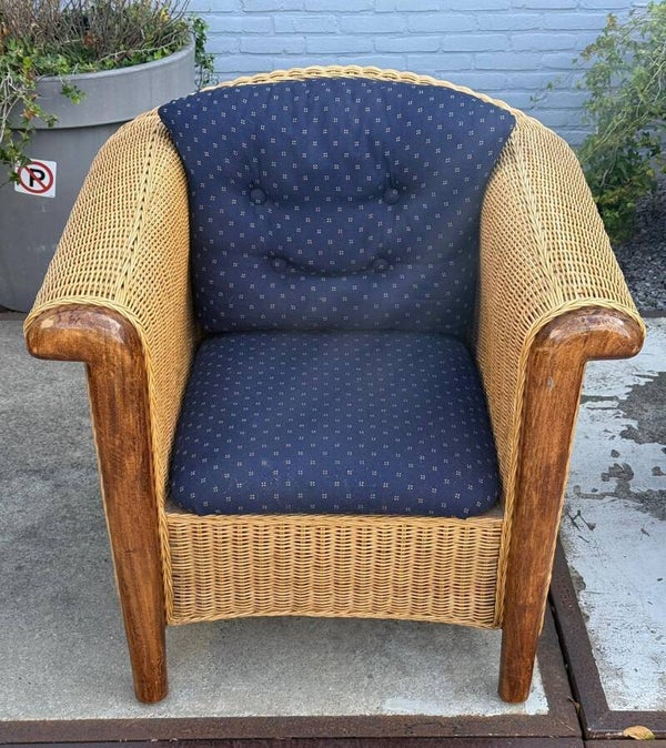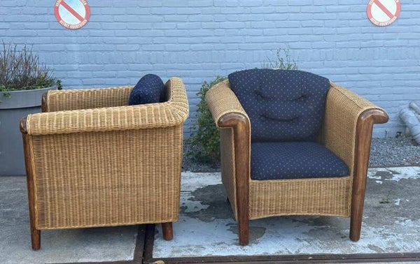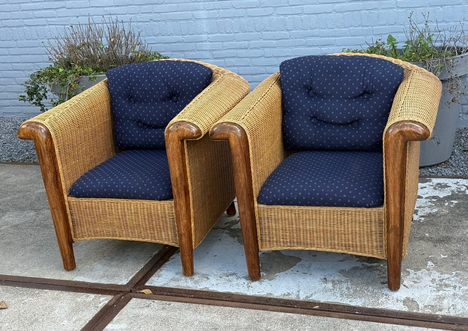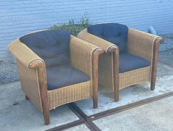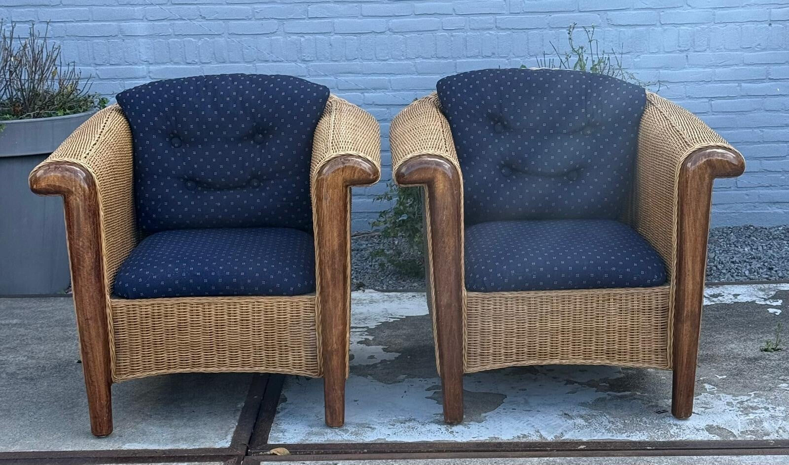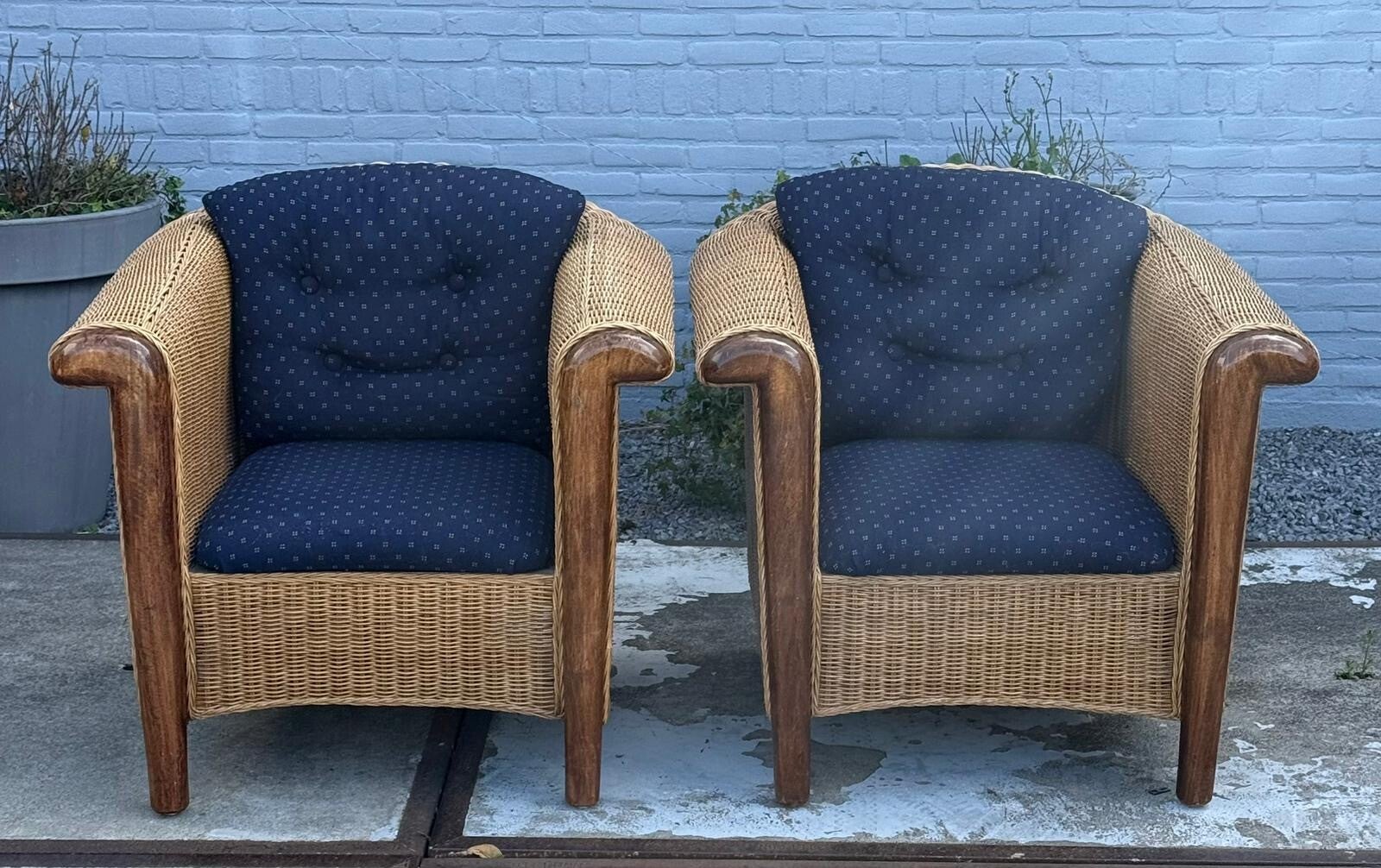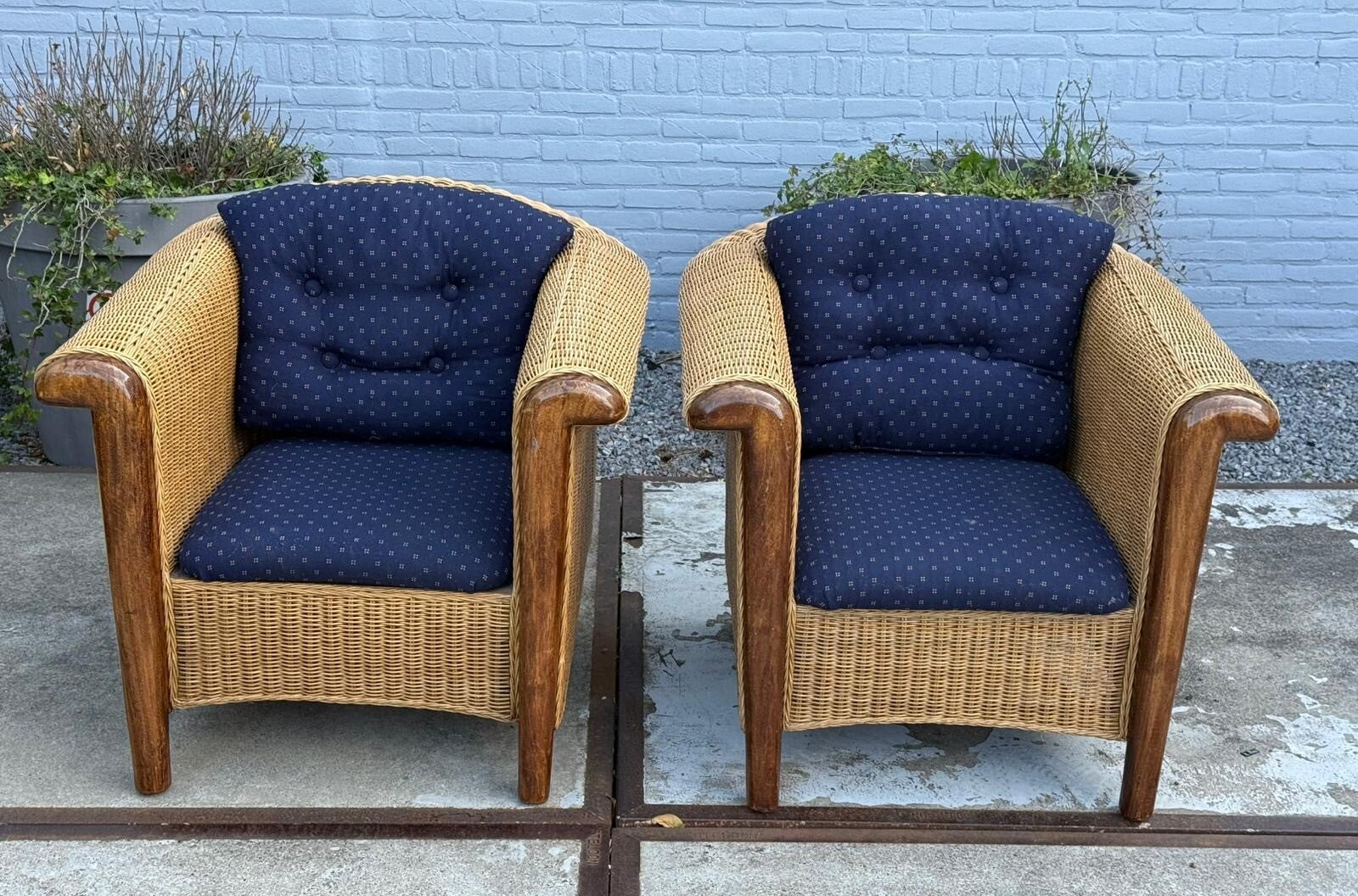 Pair of large wicker and bamboo with wood garden or patio chairs in excellent condition. Dimenstion:H 82x L 86 X63 cm.