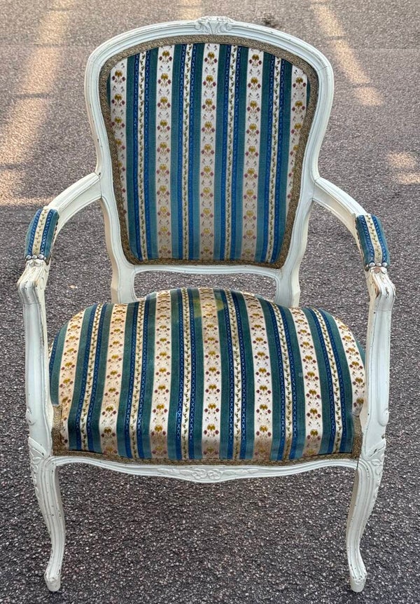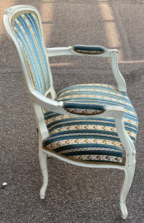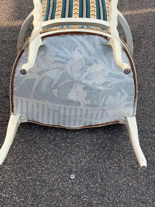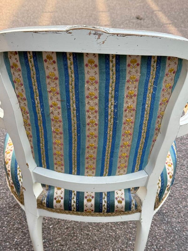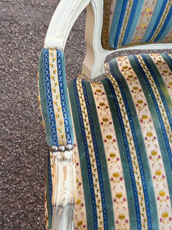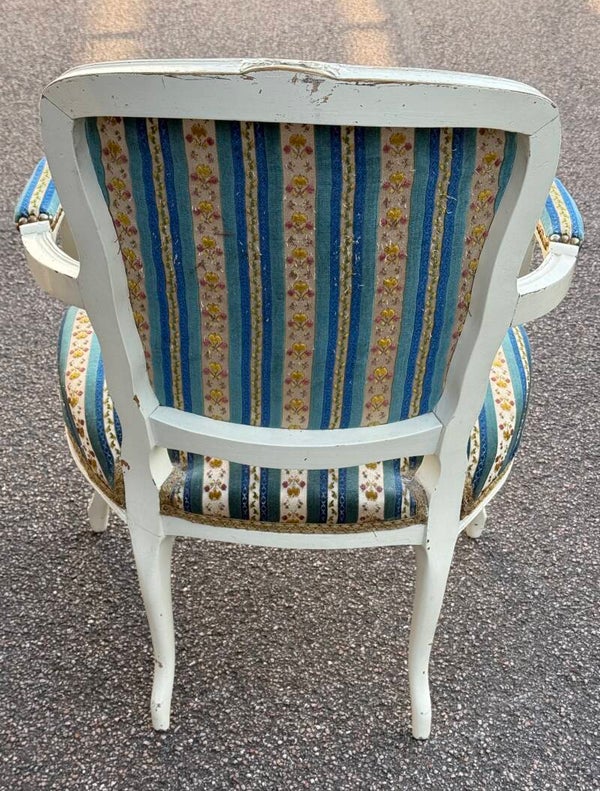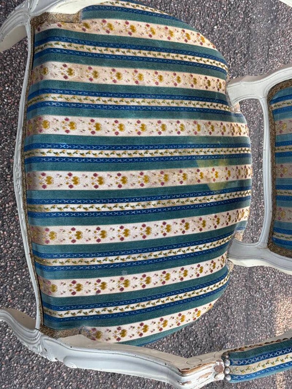 Bedroom armchair blue/ cream colored Patinated ivory lacquered DIMENSIONS: W56 D 46.5 H BACKREST 86.5 H SEAT 42