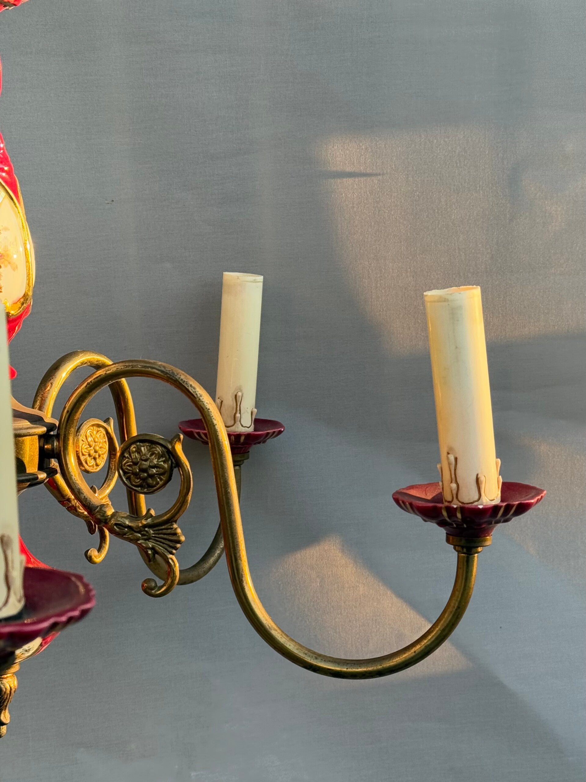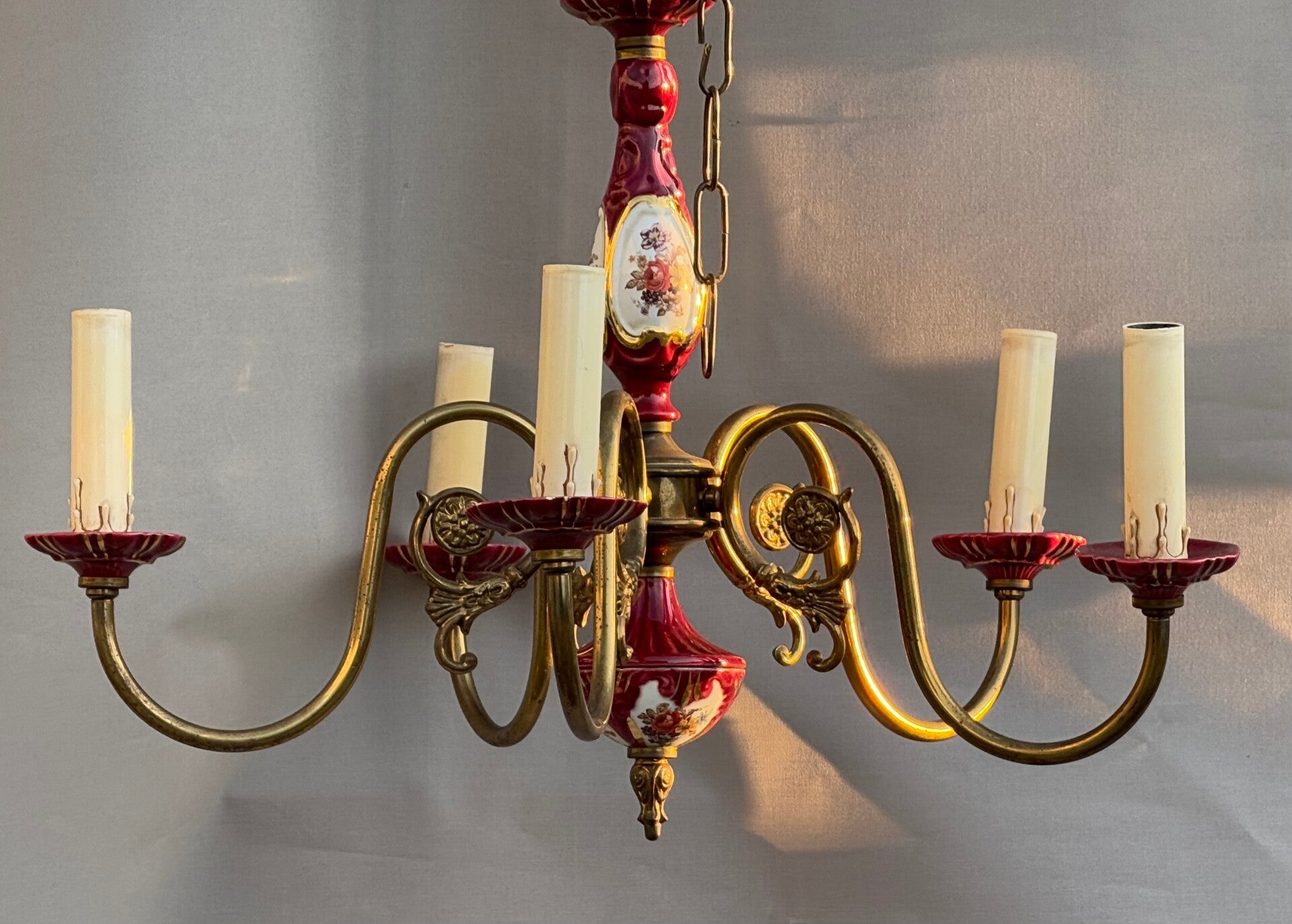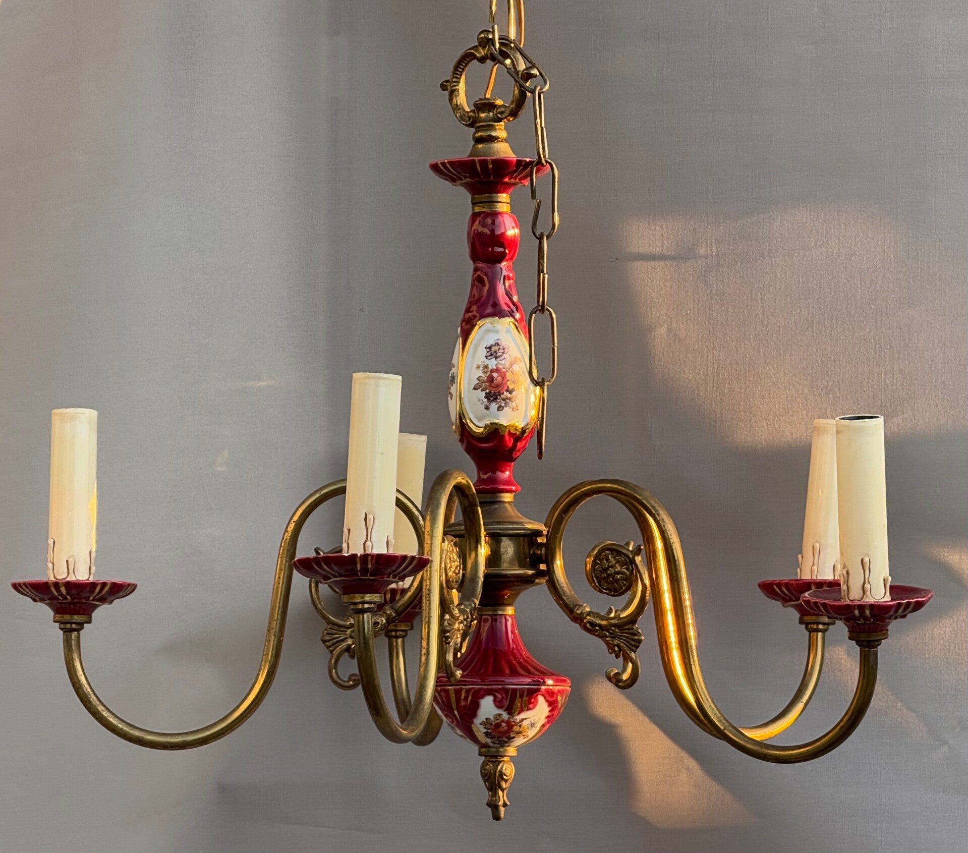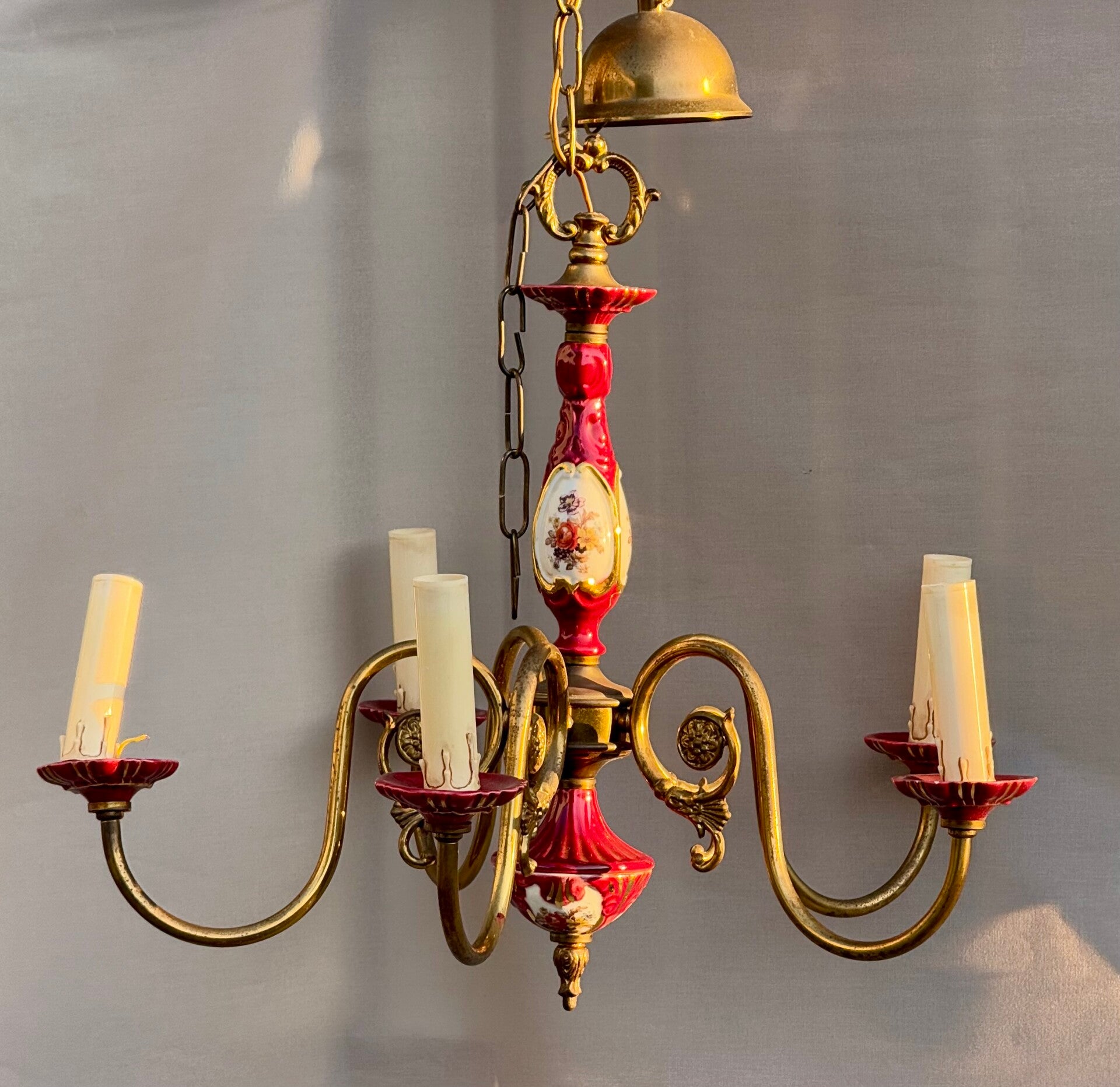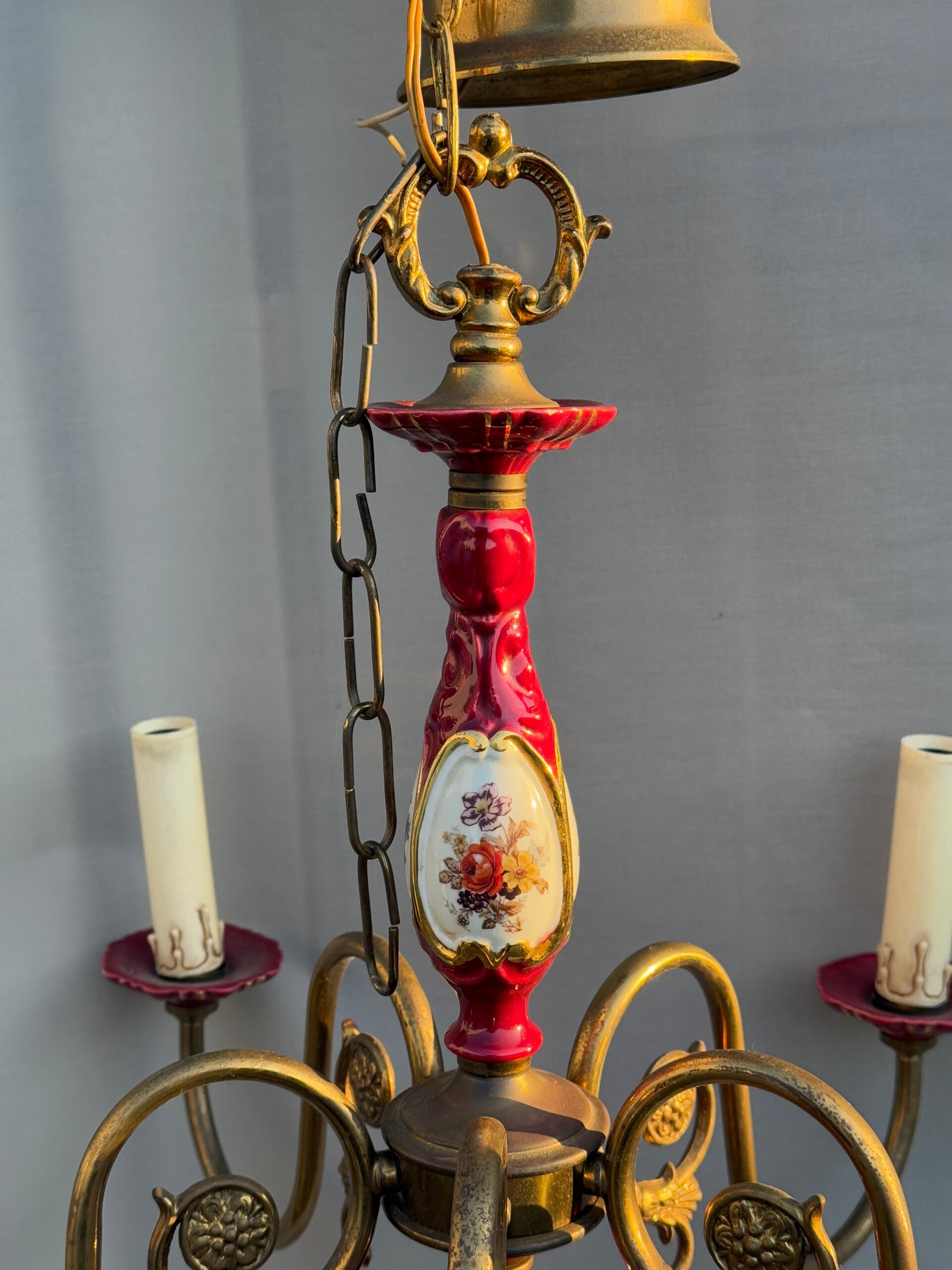 Chandelier Porcelain Brass Red cherry Bohemian Style 5 arms Lights, Vintage