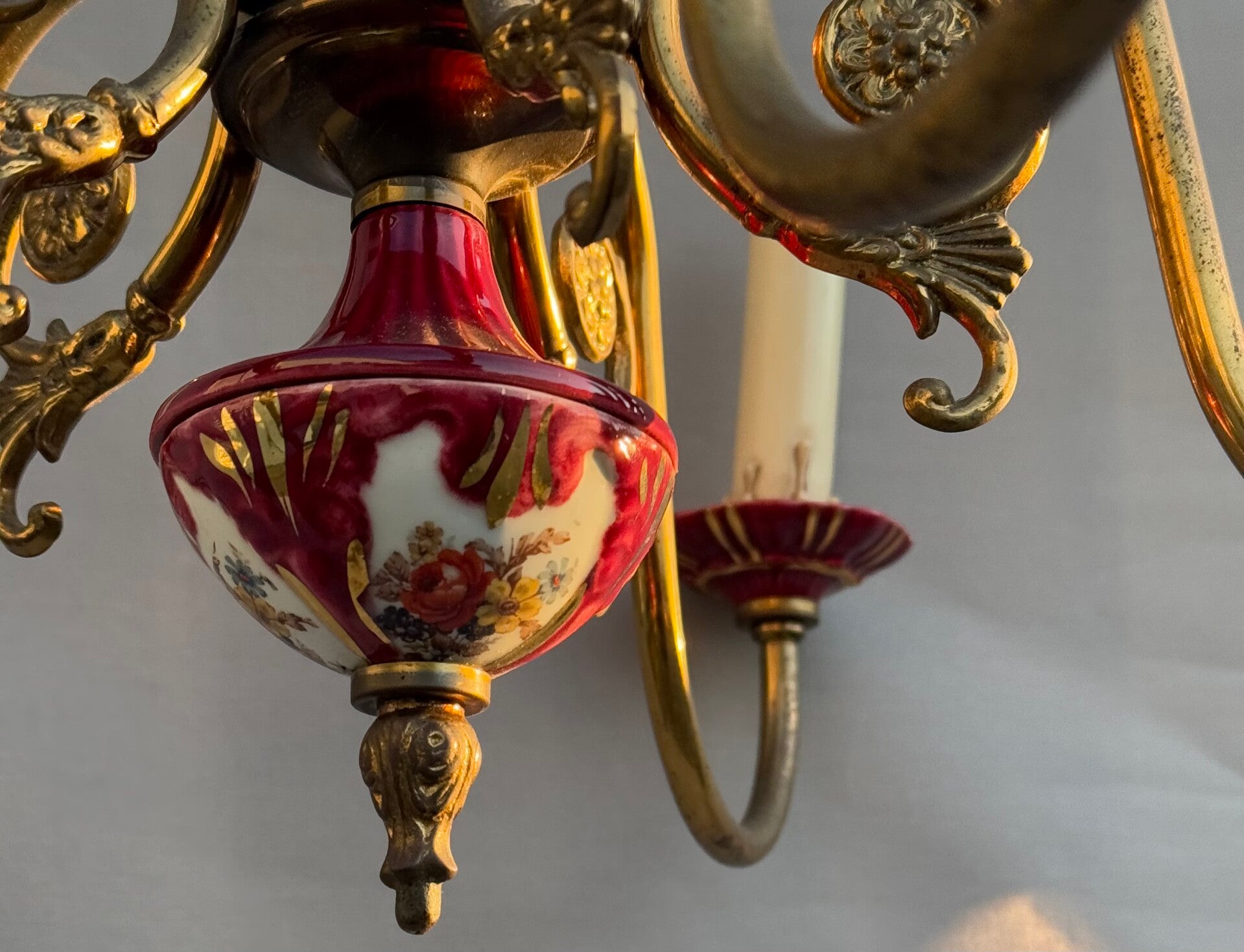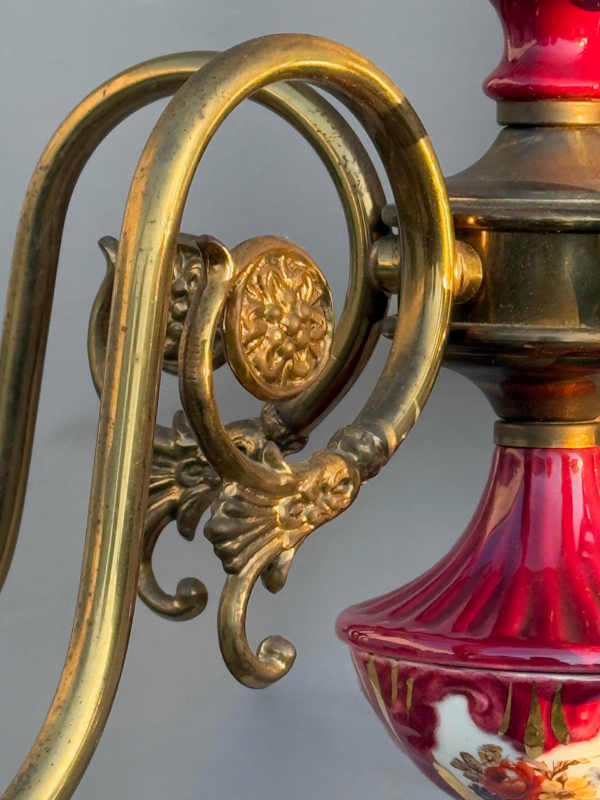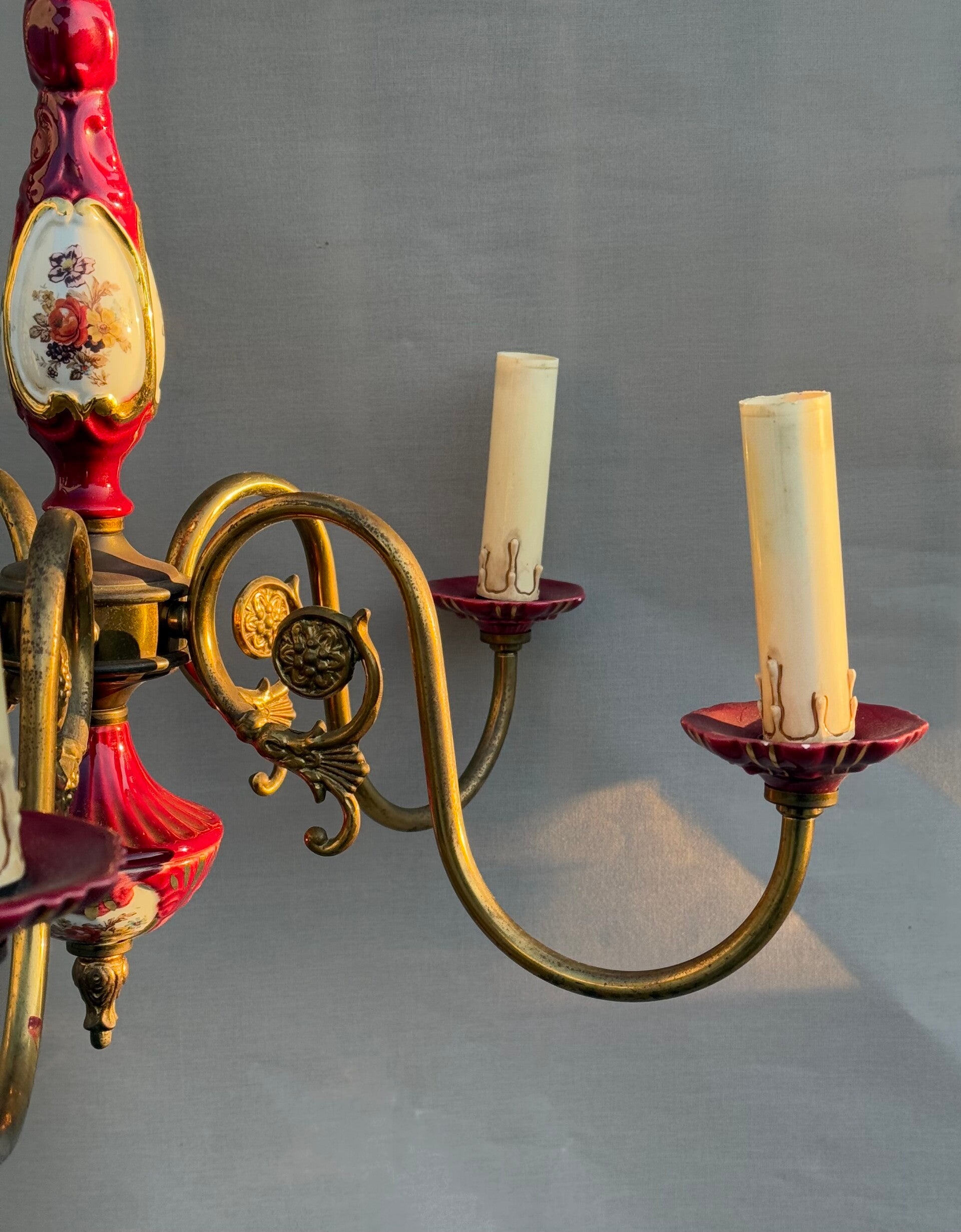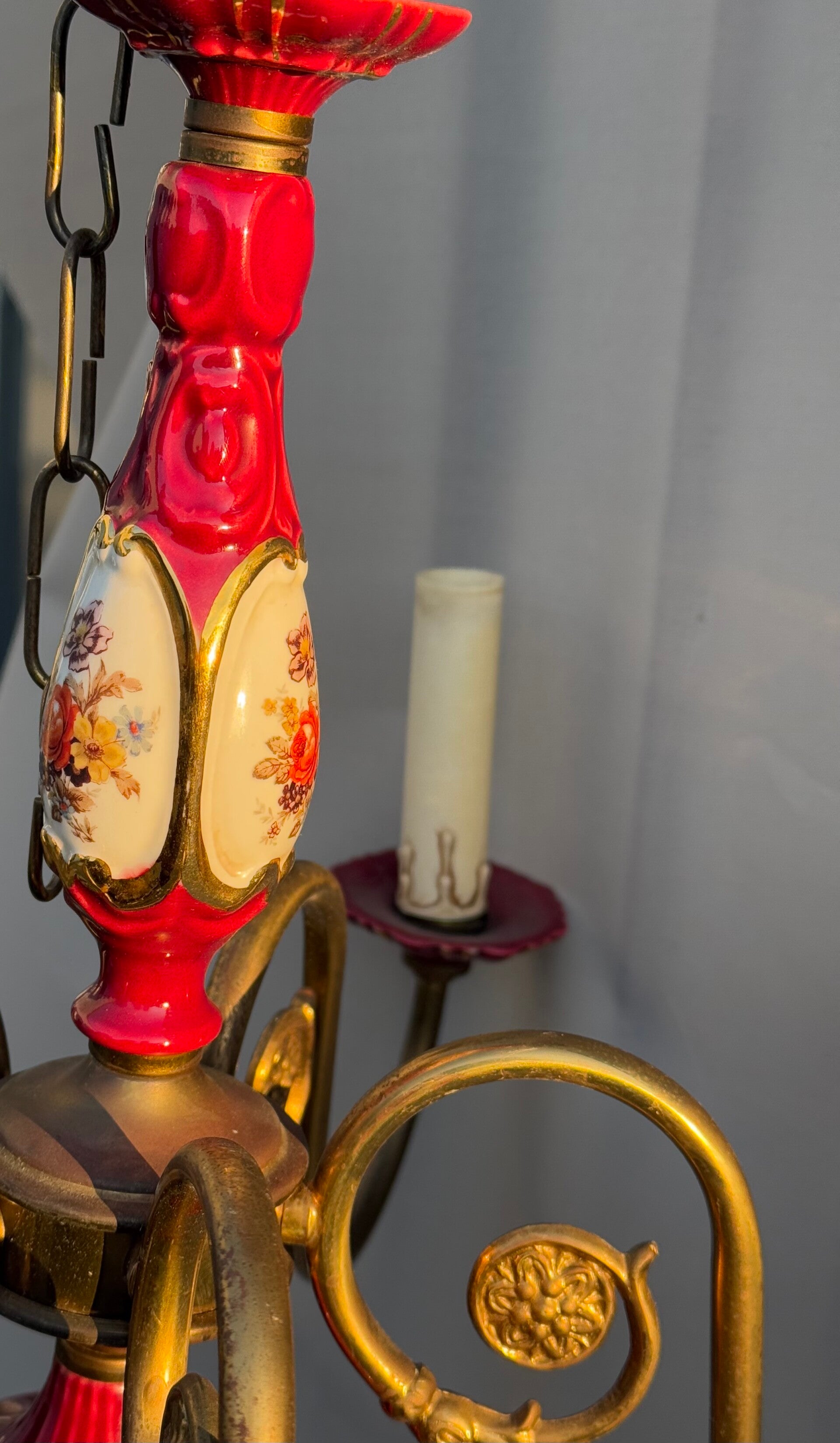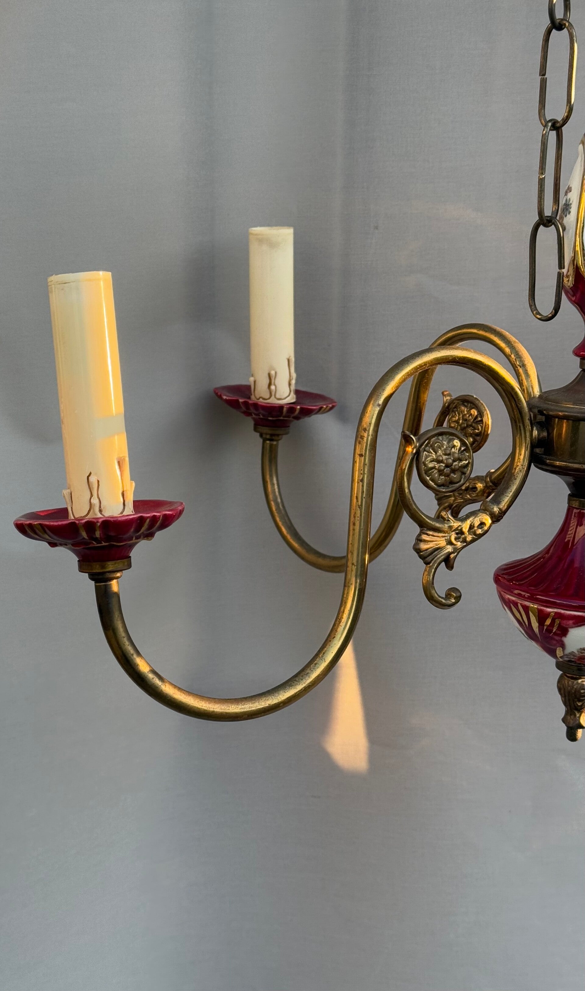 Chandelier Porcelain Brass Red cherry Bohemian Style 5 arms Lights, Vintage