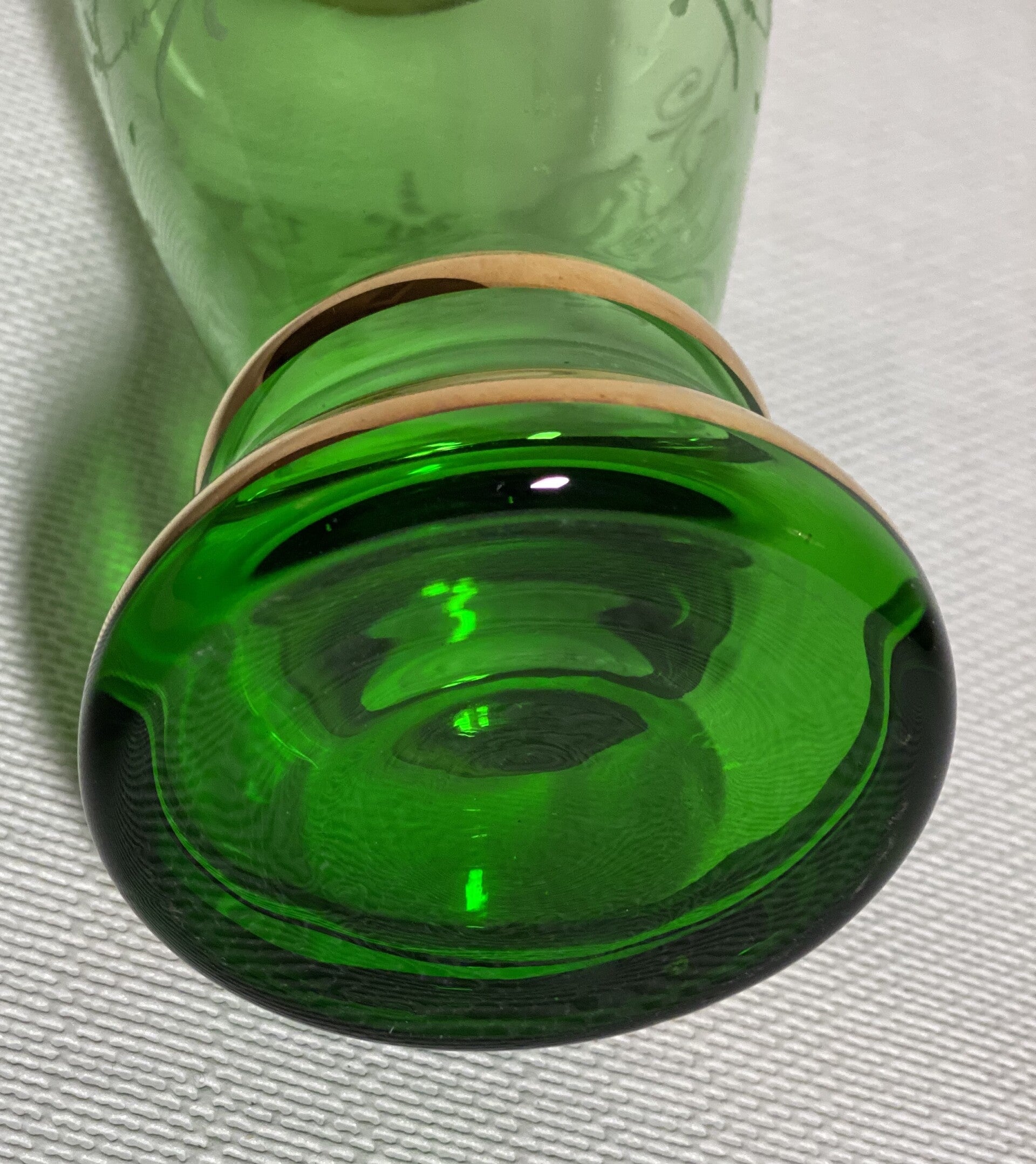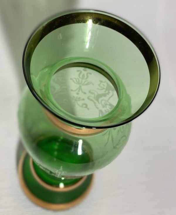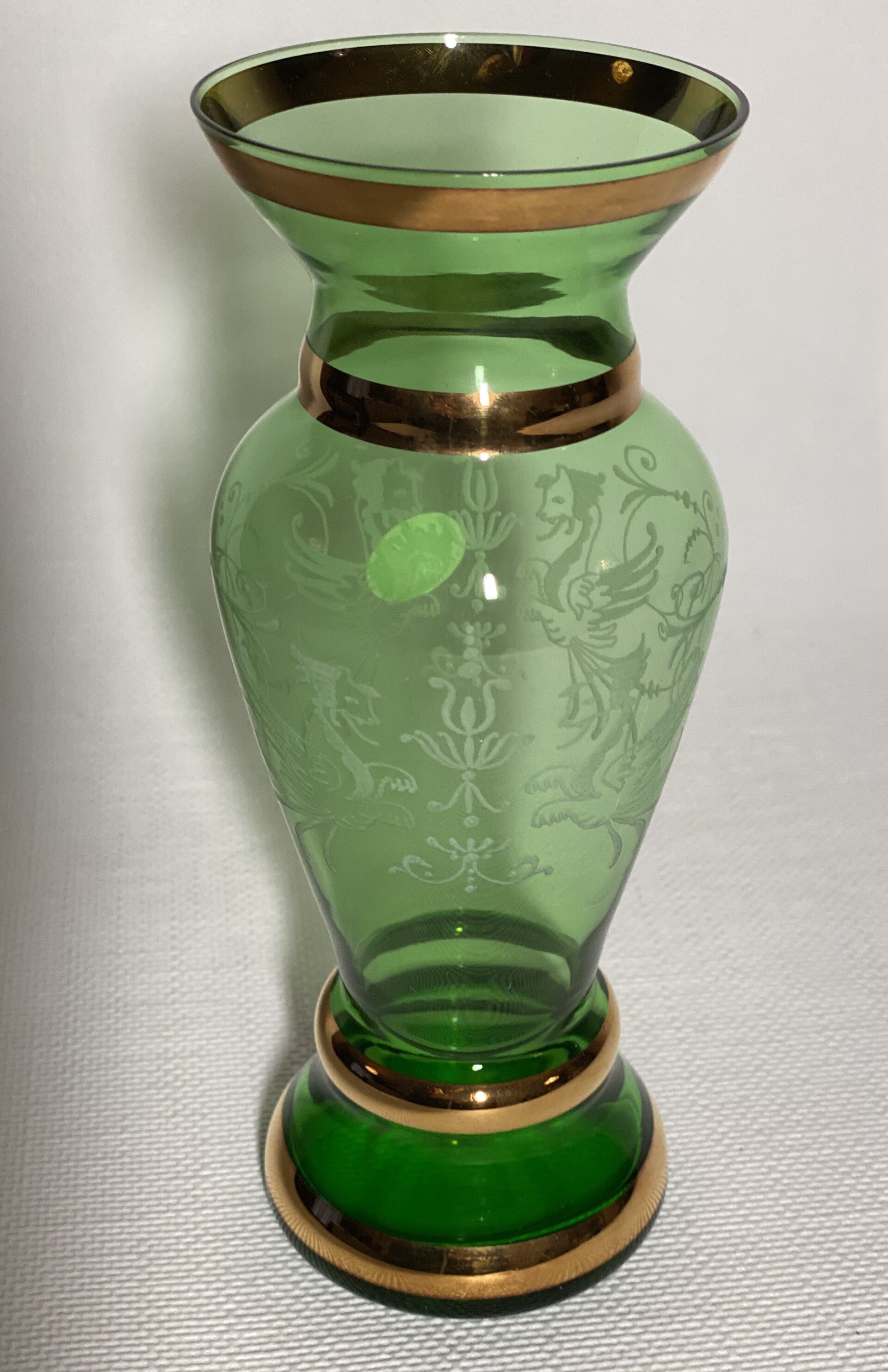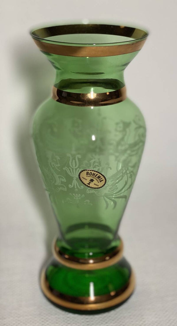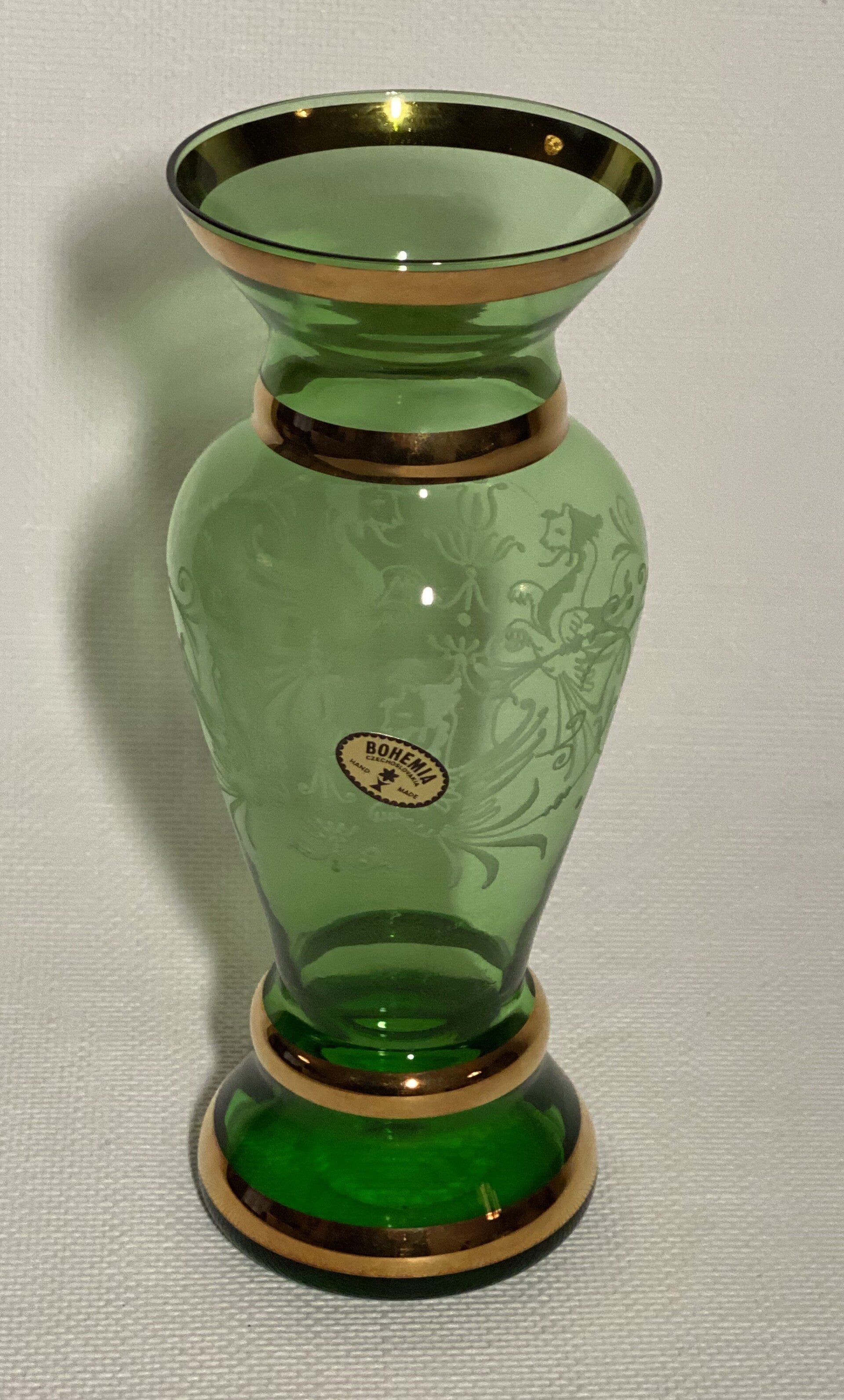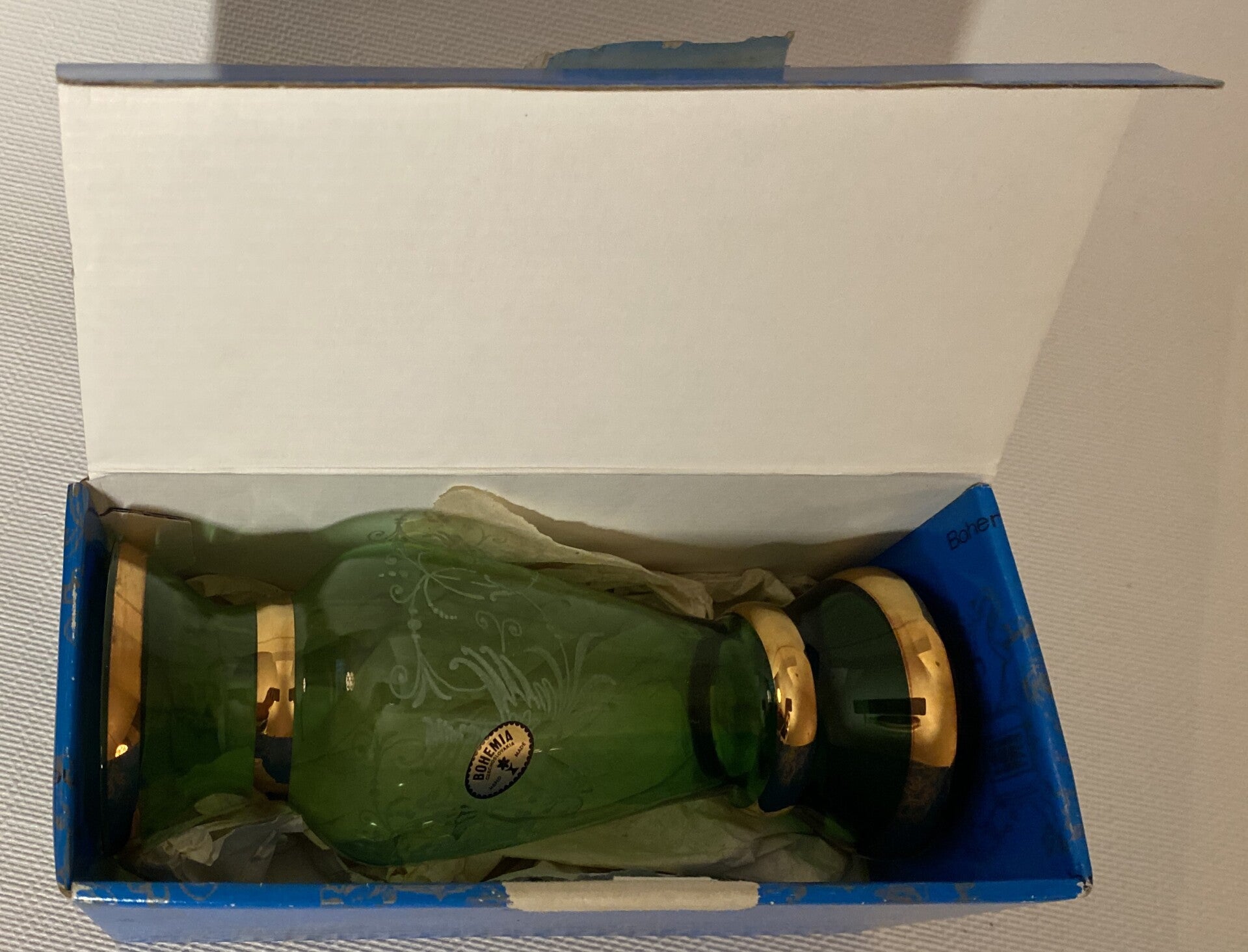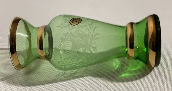 Emerald groene kristallen handgemaakte Bohemia Czechoslovakia vaas met goude decoratie.