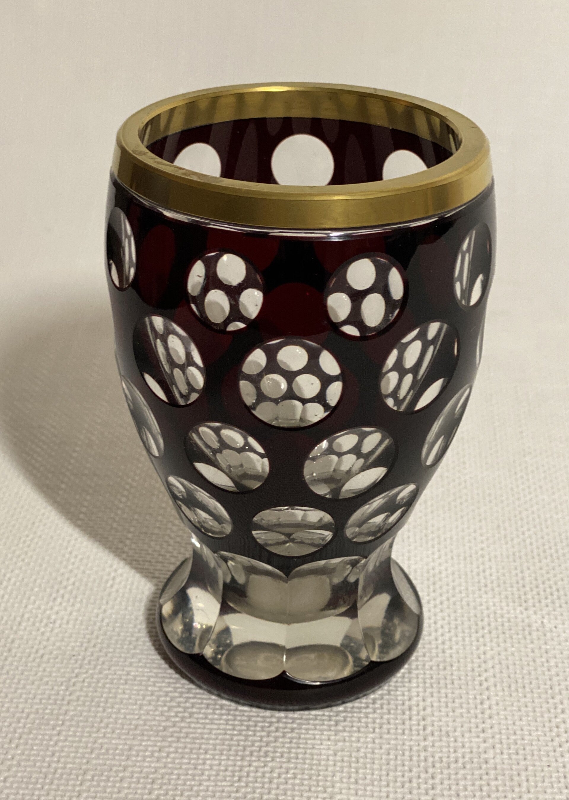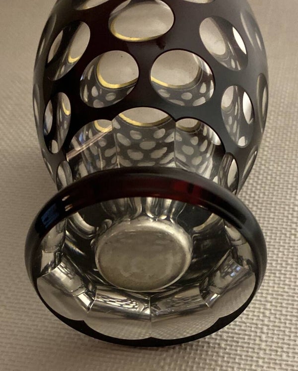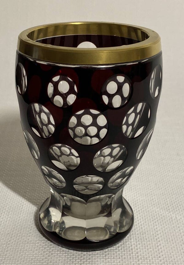 Bordeaux en transparante Bohemia vaas met goudgekleurde hals en geometrische patroon.