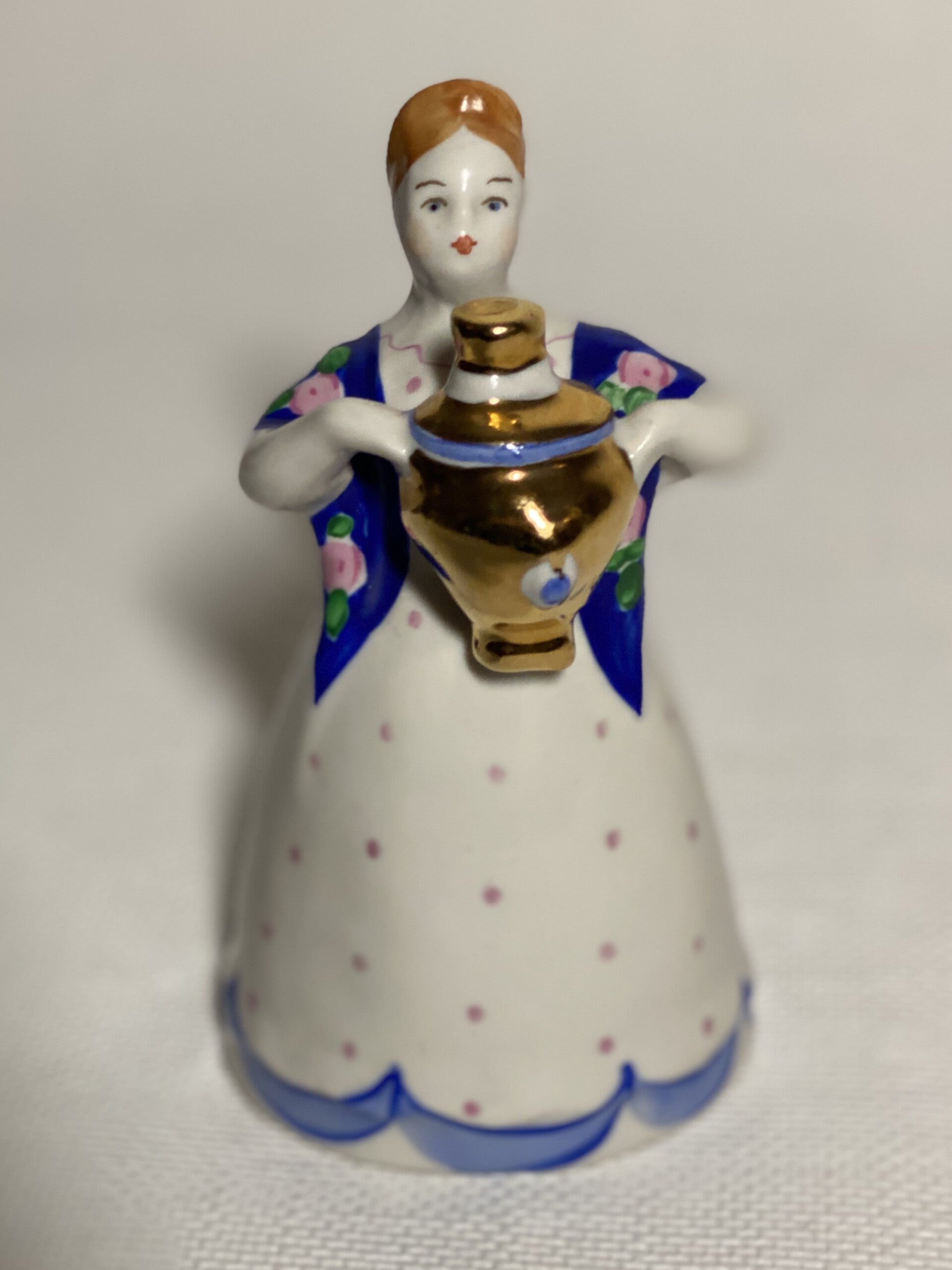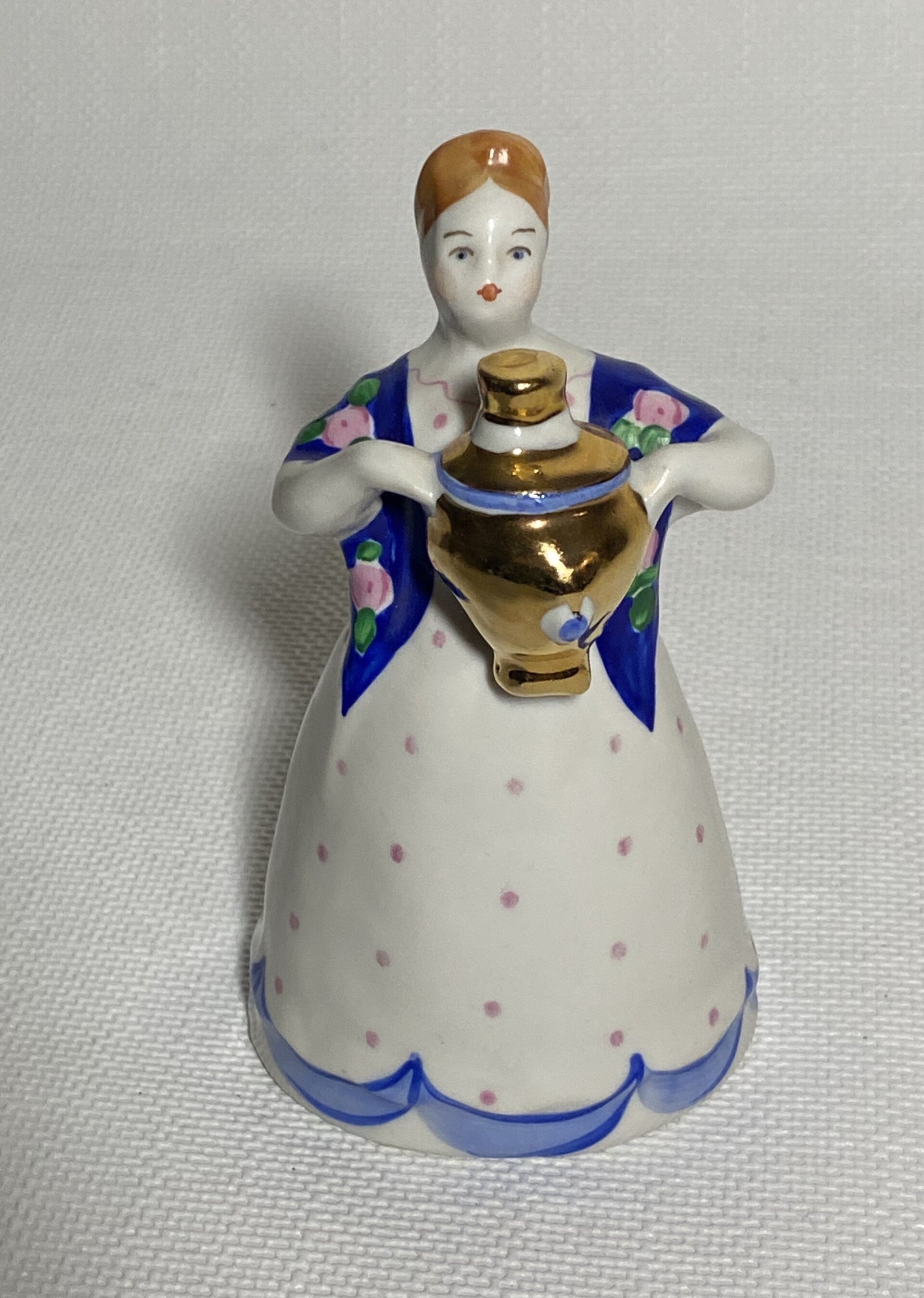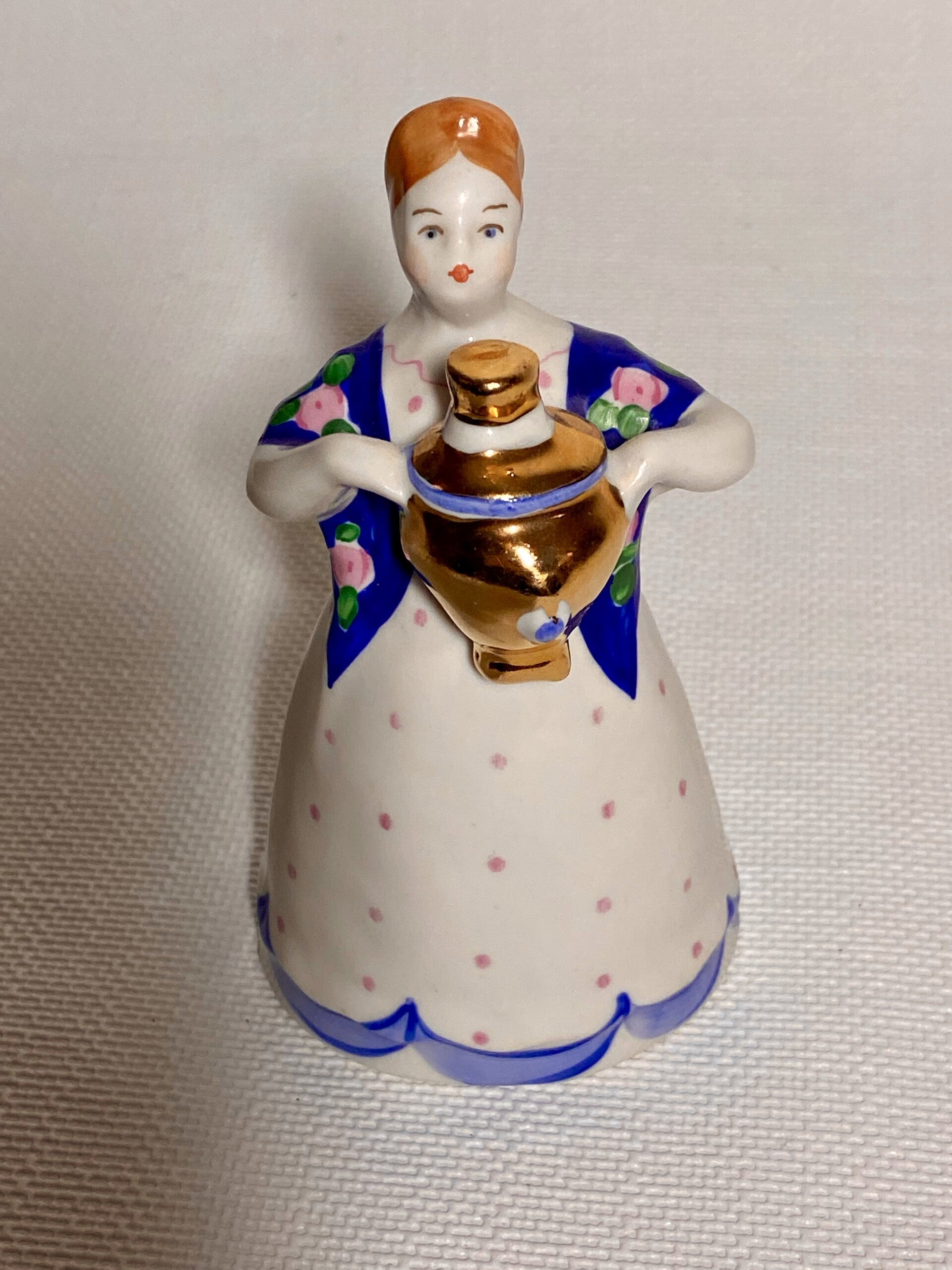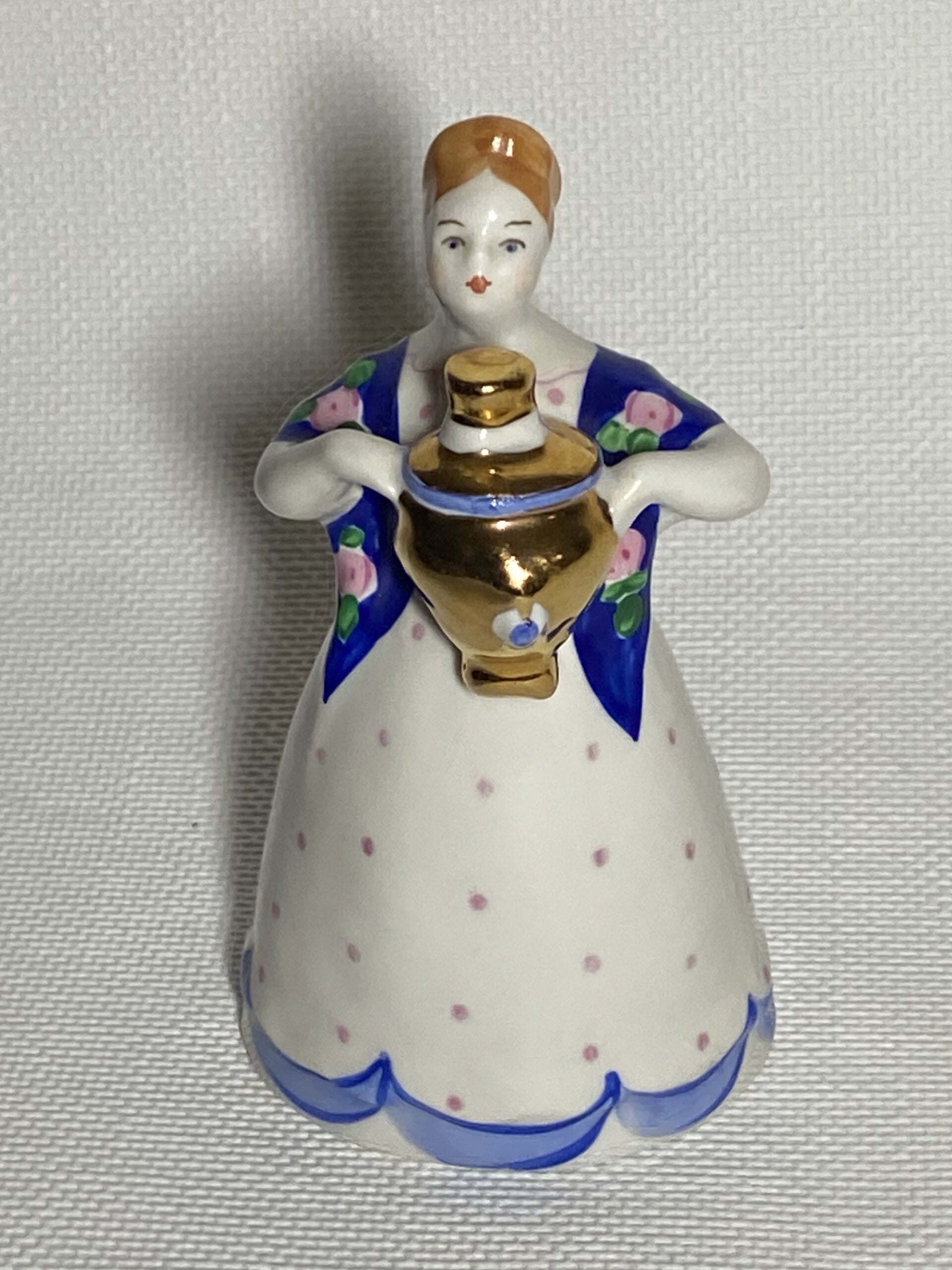 Vintage 1960 USSR Russische Dulevo porseleinen scultuurptje van vrouw met samovar.