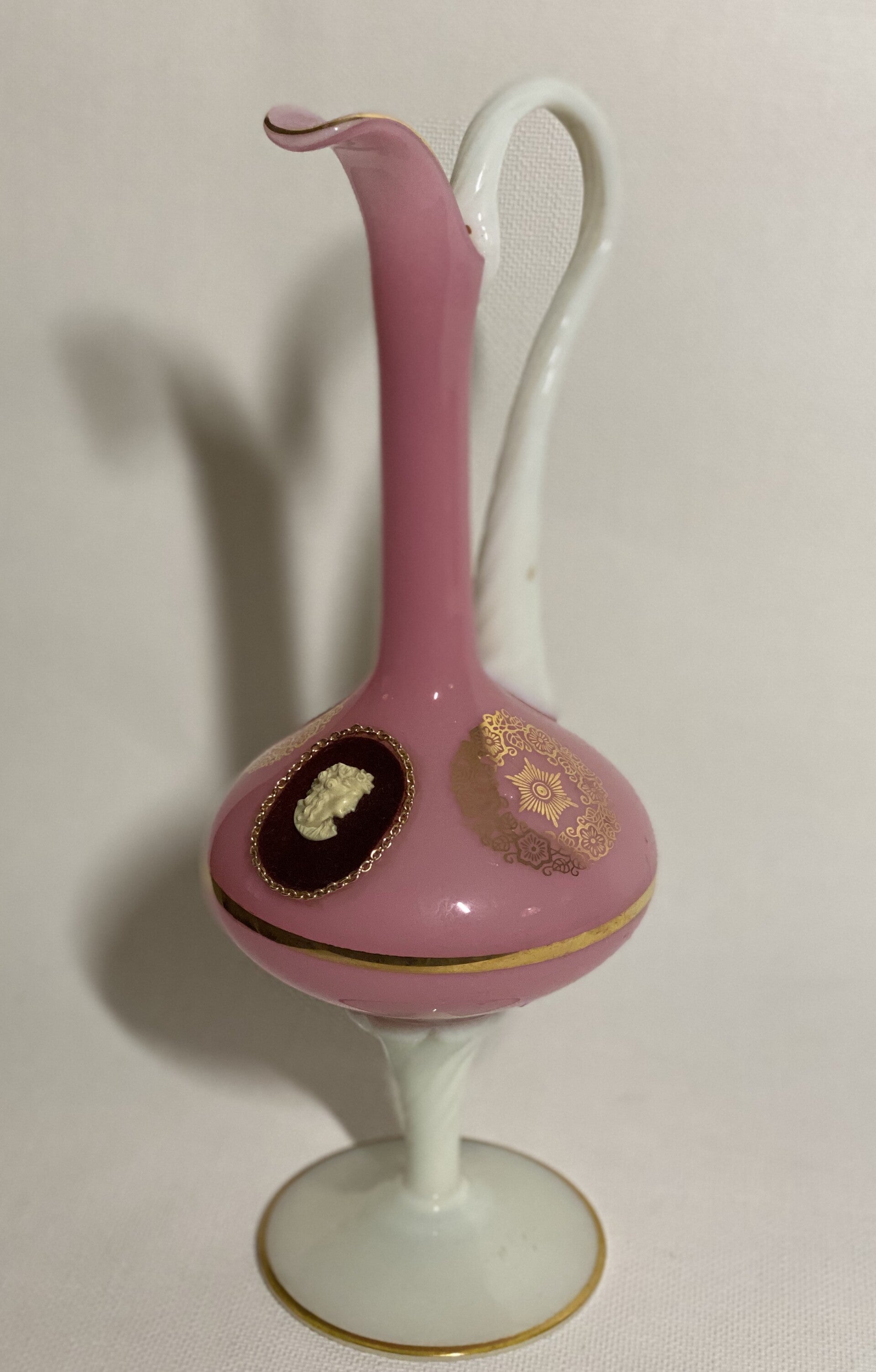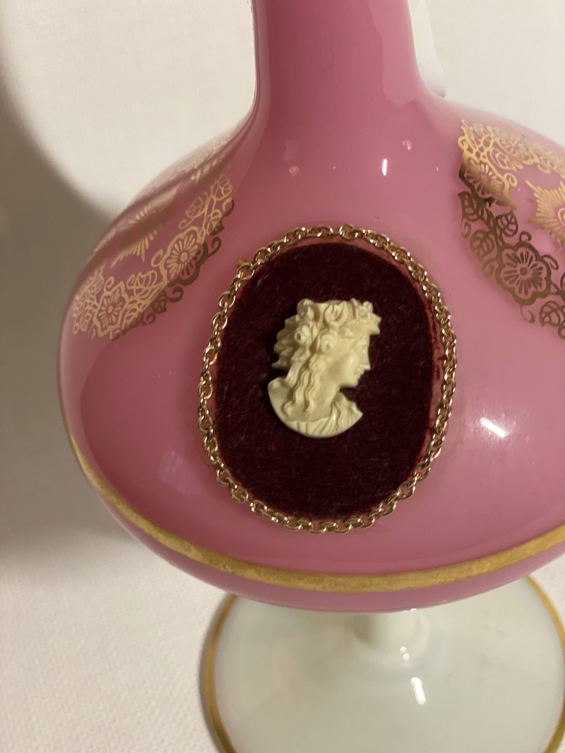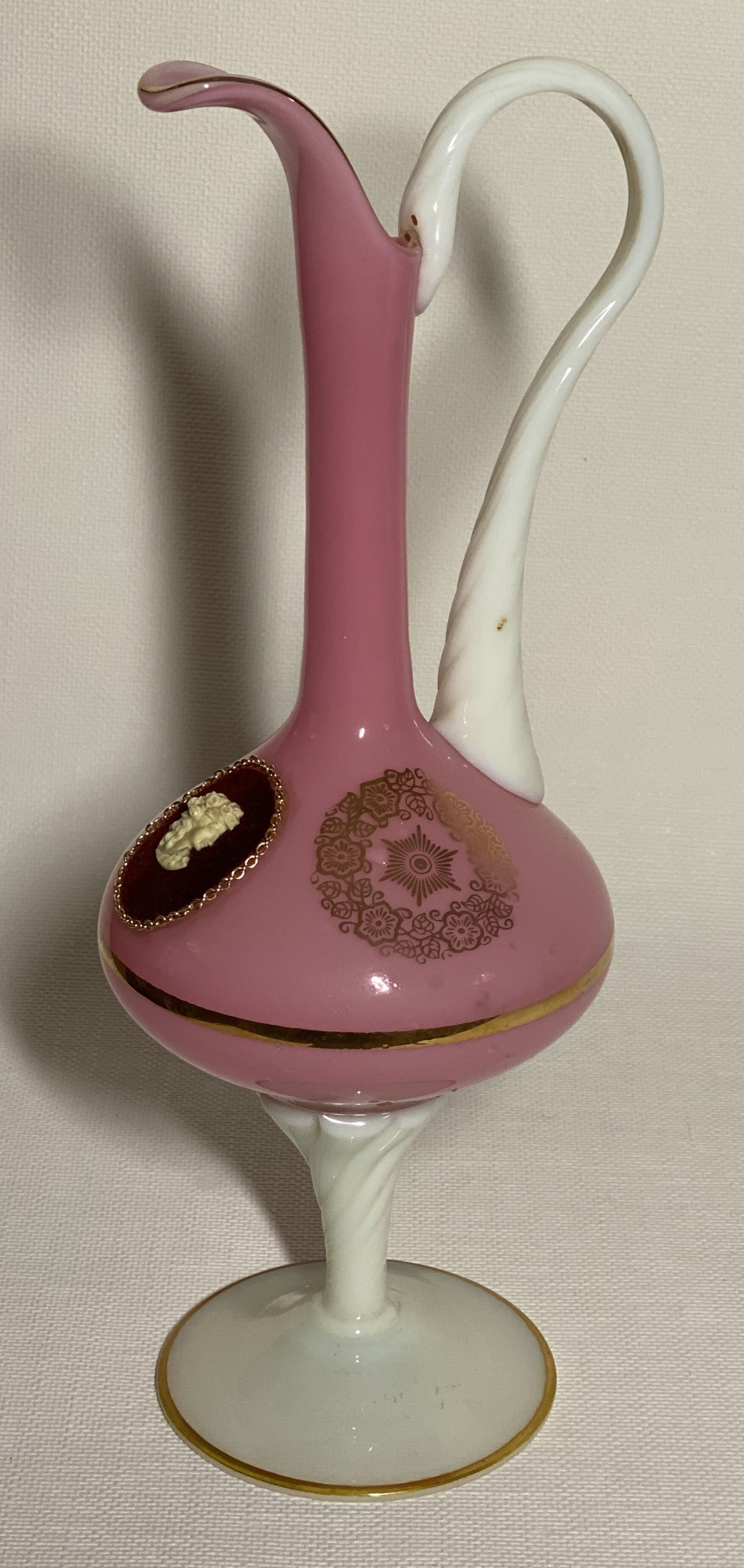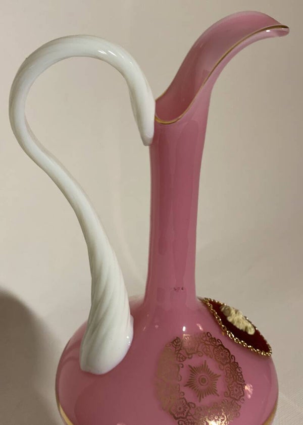 Een roze geëmailleerde opaline karaf met handvat, Frankrijk, mogelijk Baccarat, 1880.