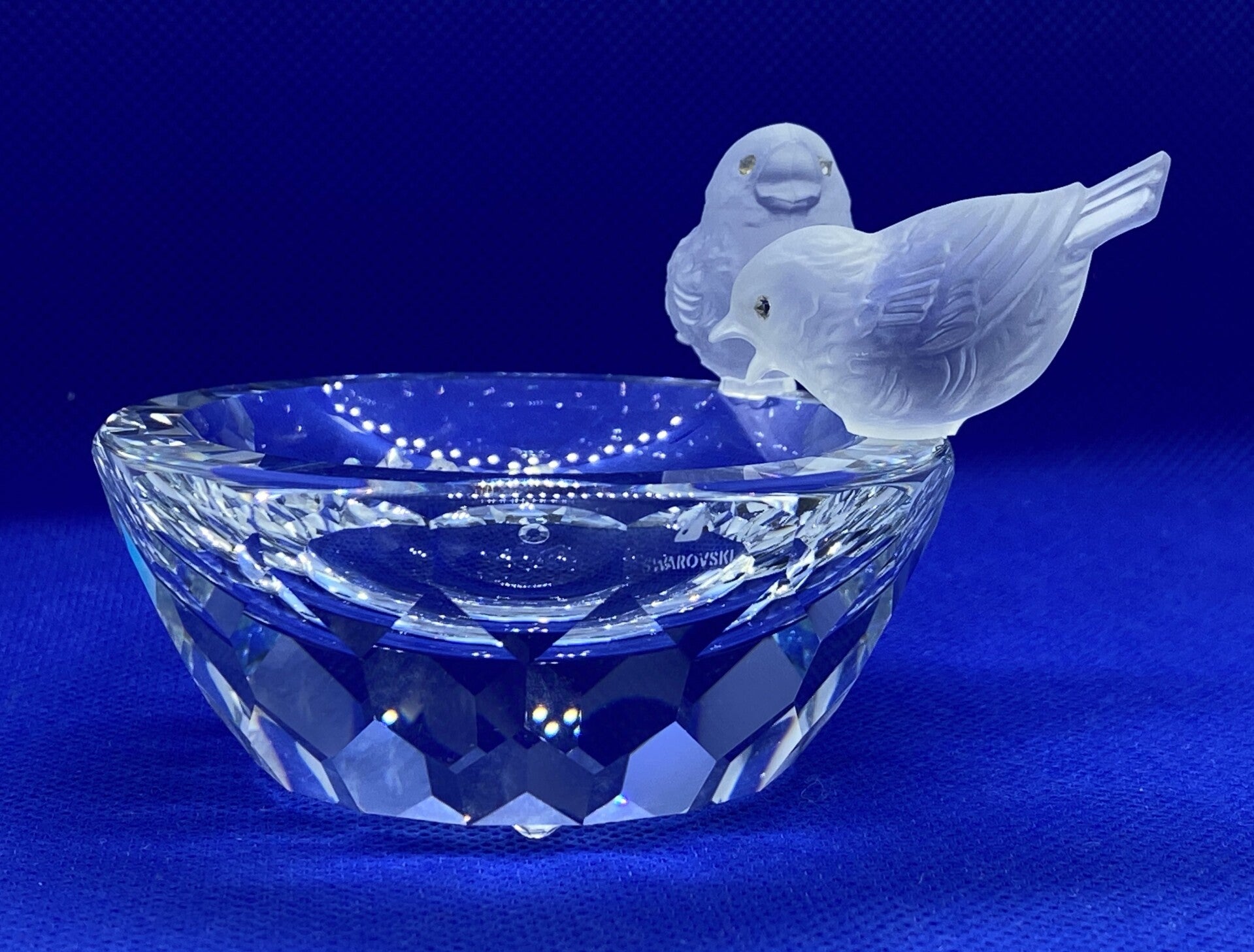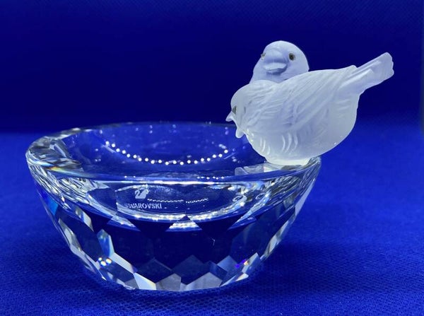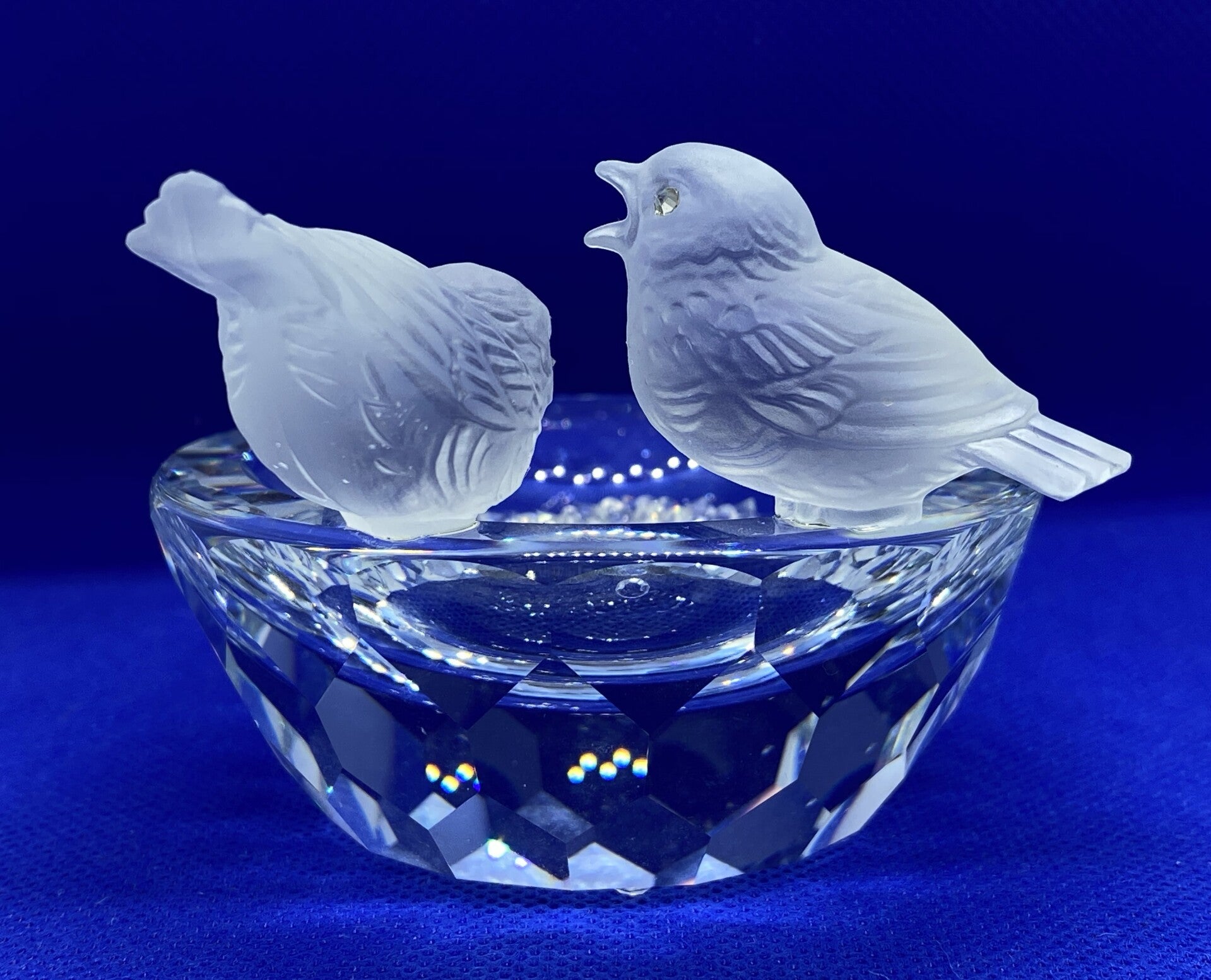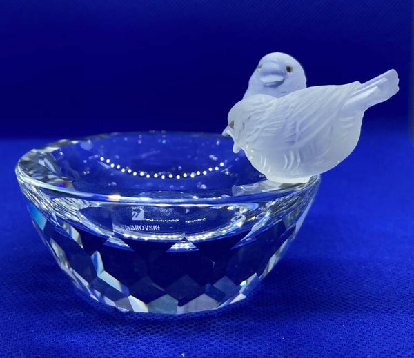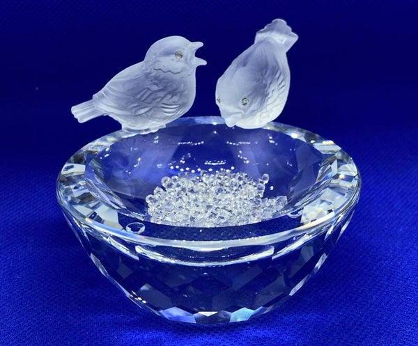 Swarovski kristal vogelbad. Twee gematteerde vogeltjes op de rand van een badje. Dit exemplaar komt uit de serie "Gevederde Schoonheden". Badje is facet geslepen en gemaakt van helder kristal. Ontwerper: Max Schreck. Jaar v. uitgave: 1980 tot 2007.