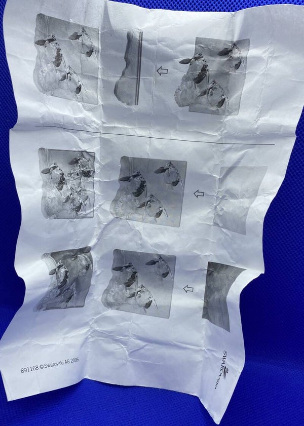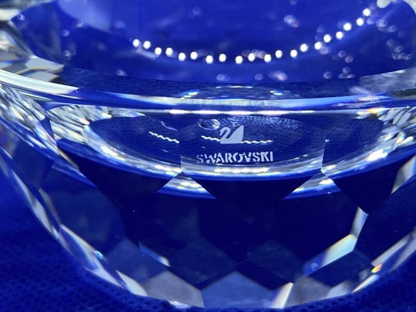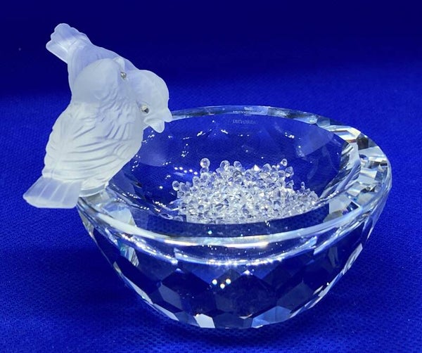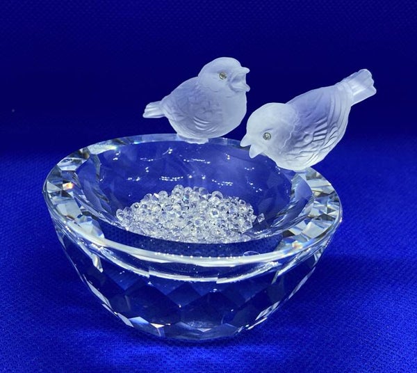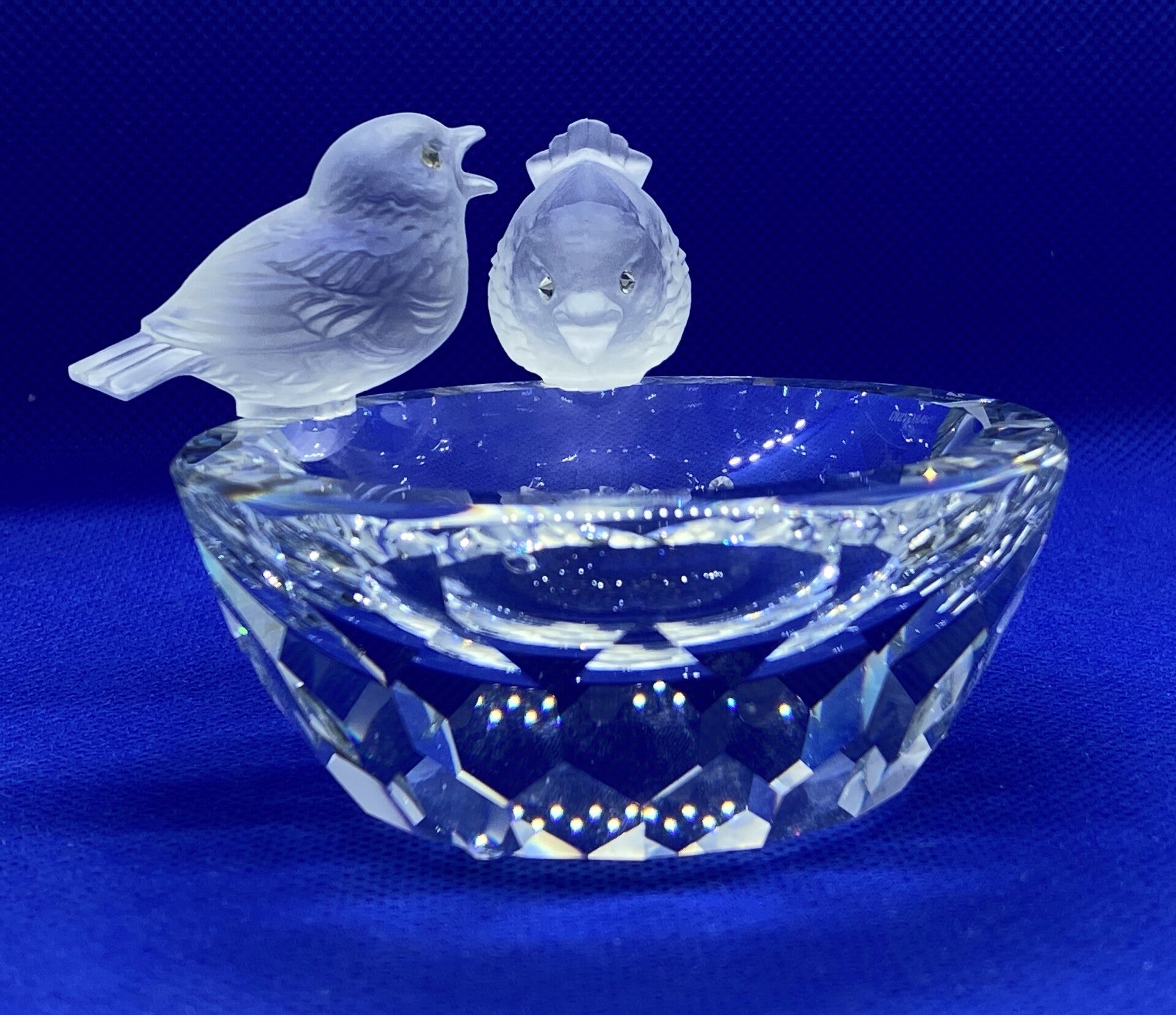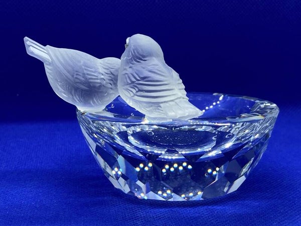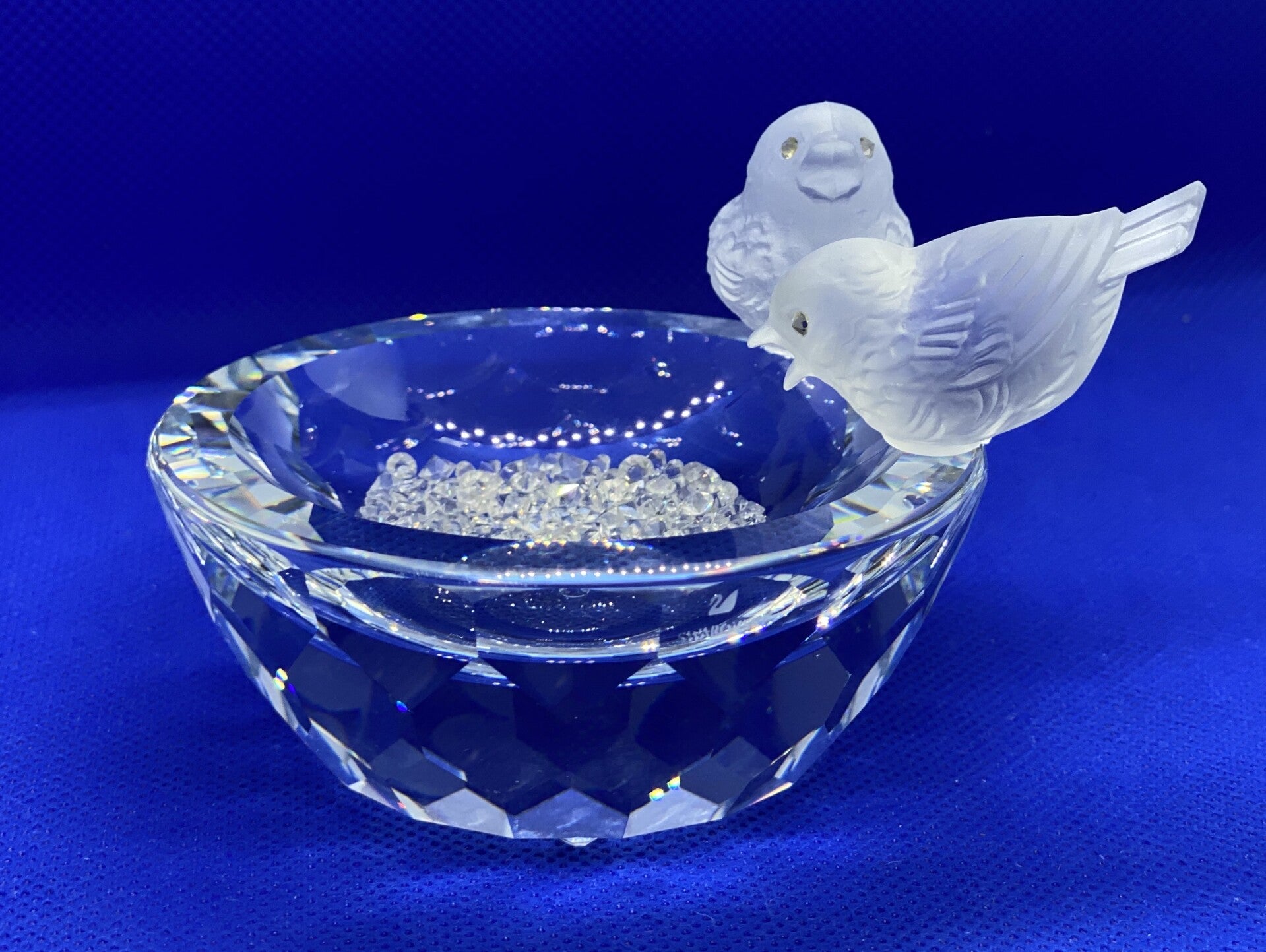 Swarovski kristal vogelbad. Twee gematteerde vogeltjes op de rand van een badje. Dit exemplaar komt uit de serie "Gevederde Schoonheden". Badje is facet geslepen en gemaakt van helder kristal. Ontwerper: Max Schreck. Jaar v. uitgave: 1980 tot 2007.