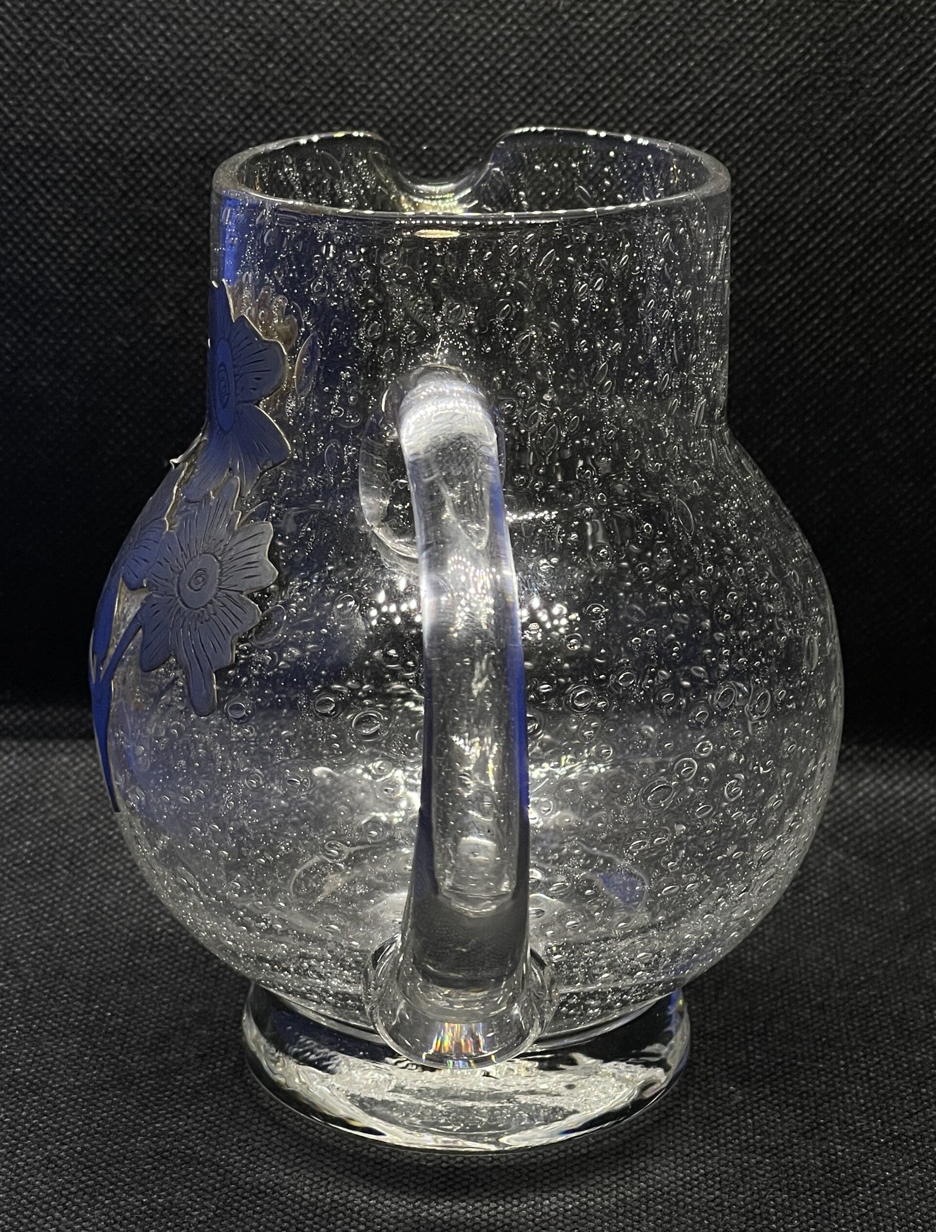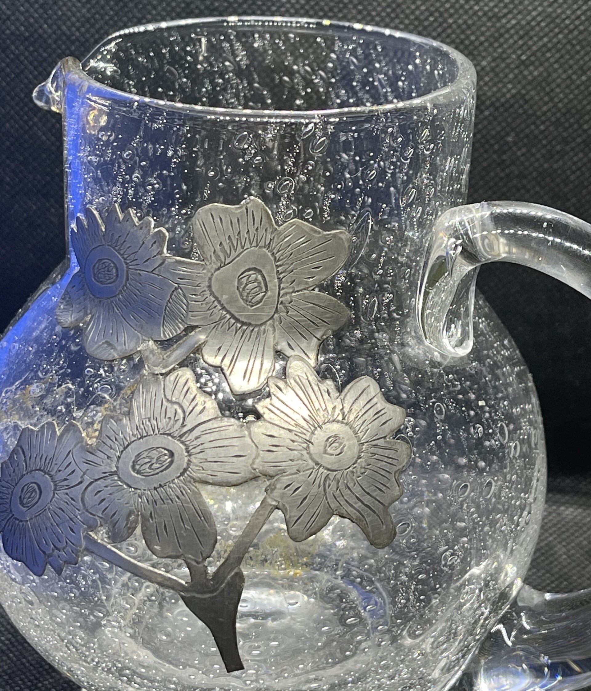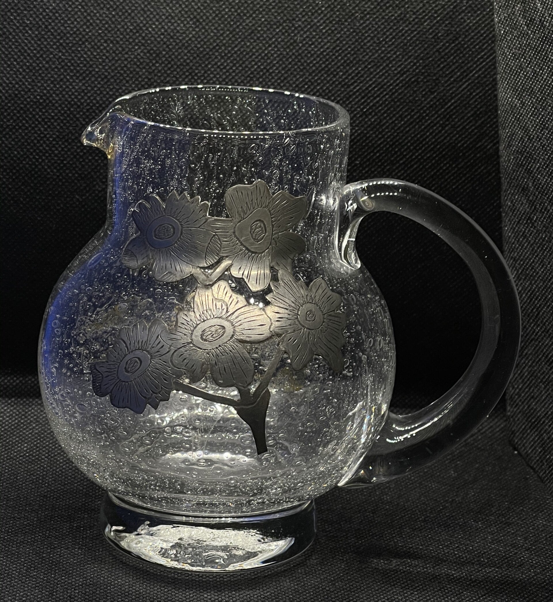 Kristallen bubbelglazen kan met verzilverde bladdecoratie.