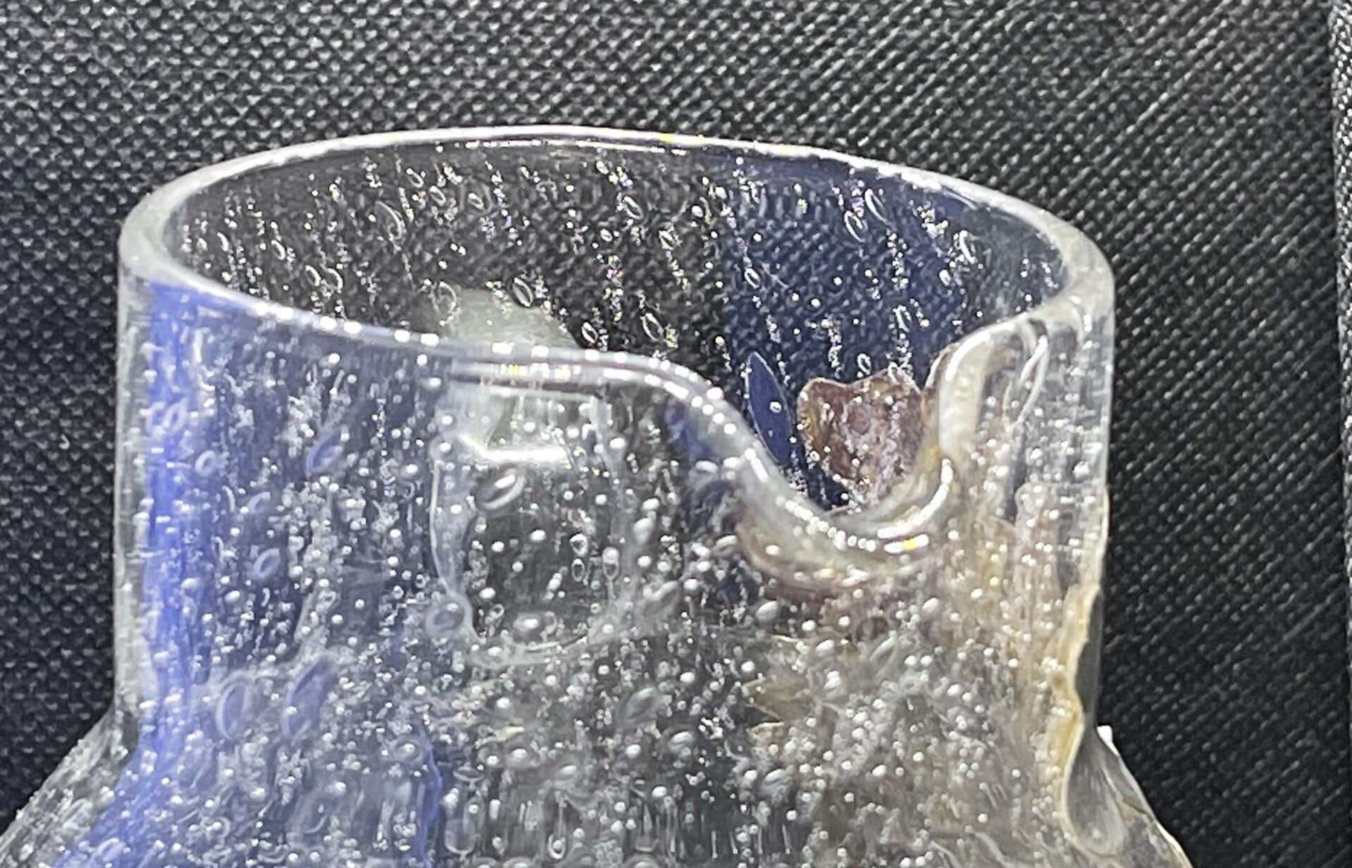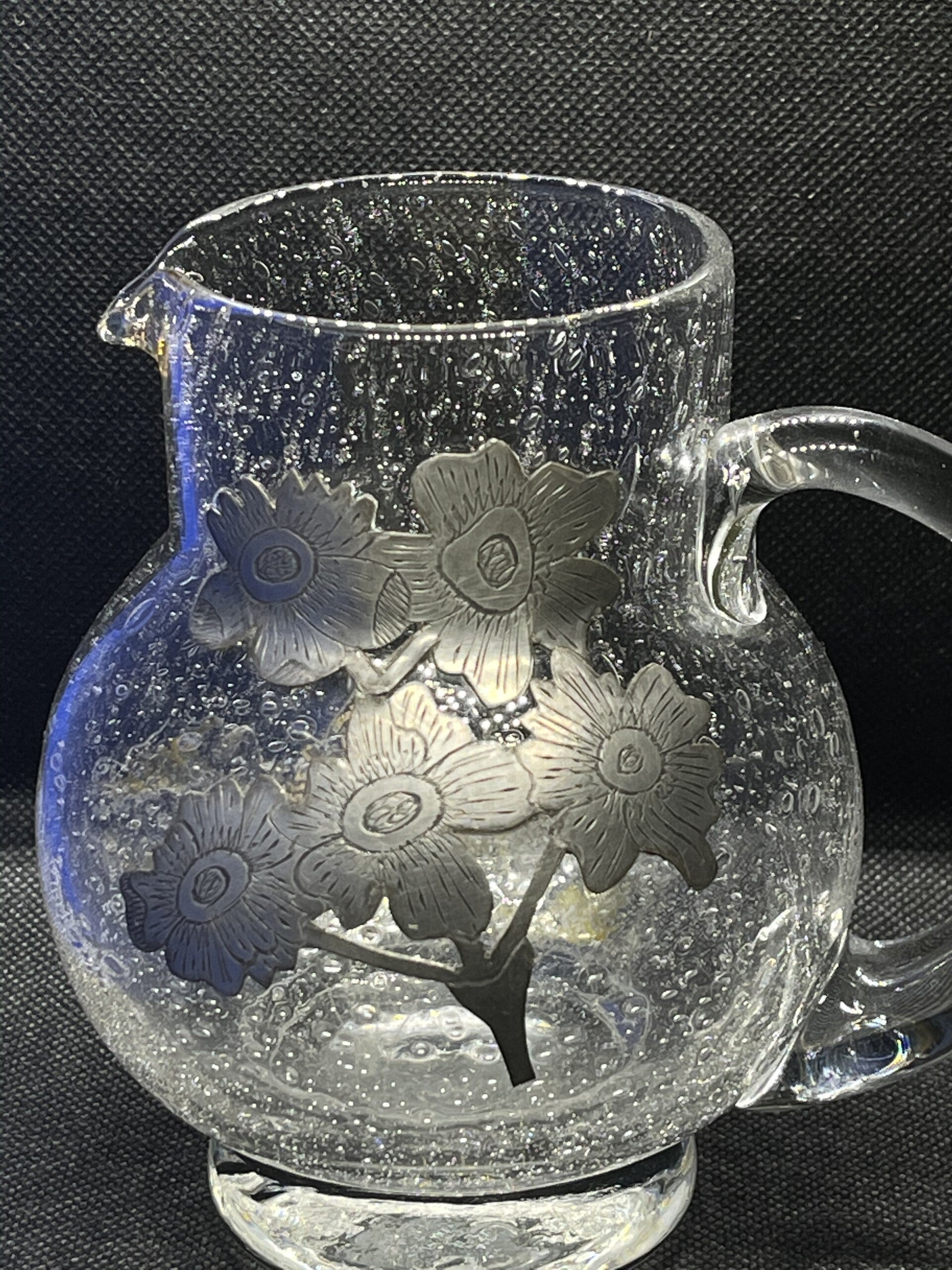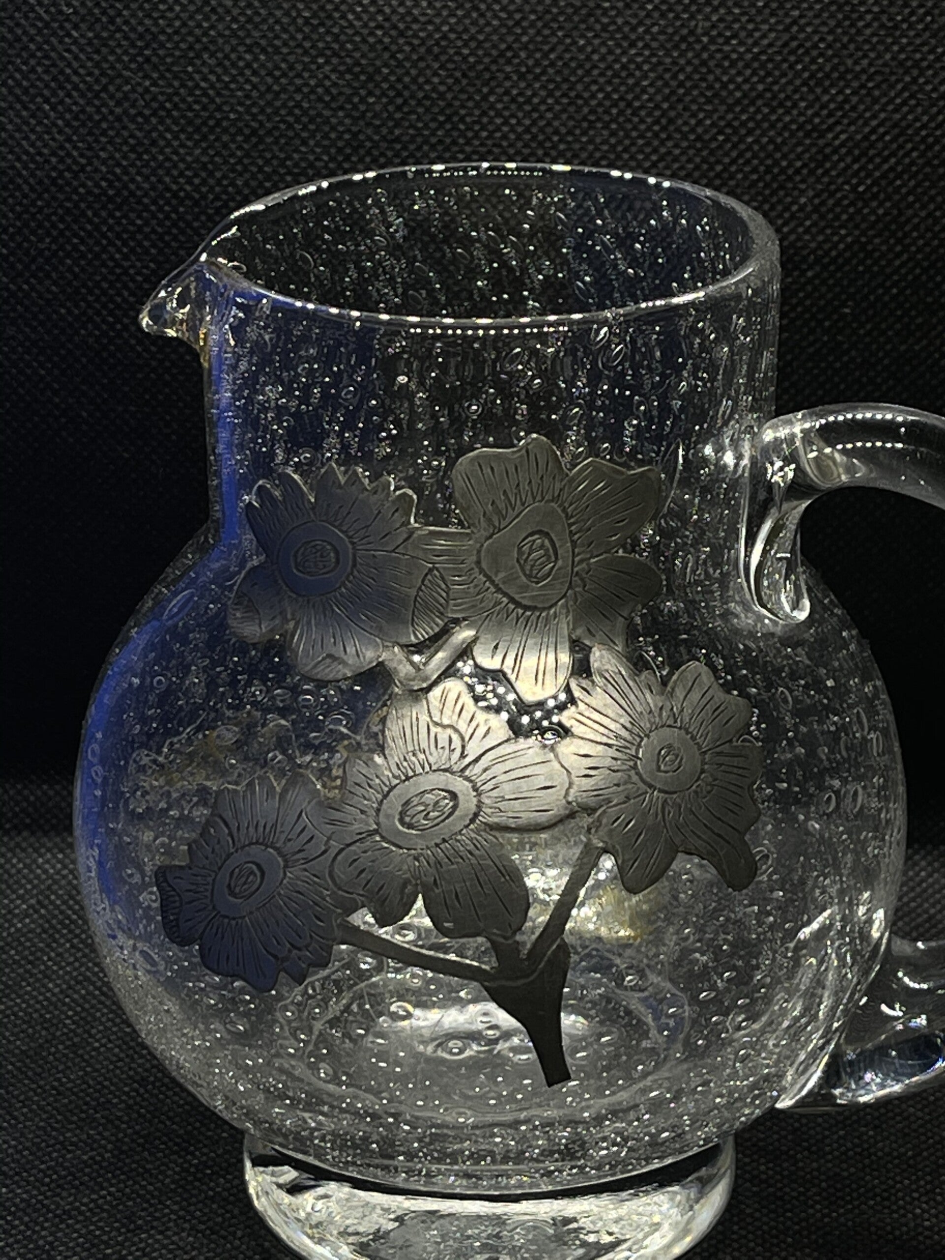 Kristallen bubbelglazen kan met verzilverde bladdecoratie.