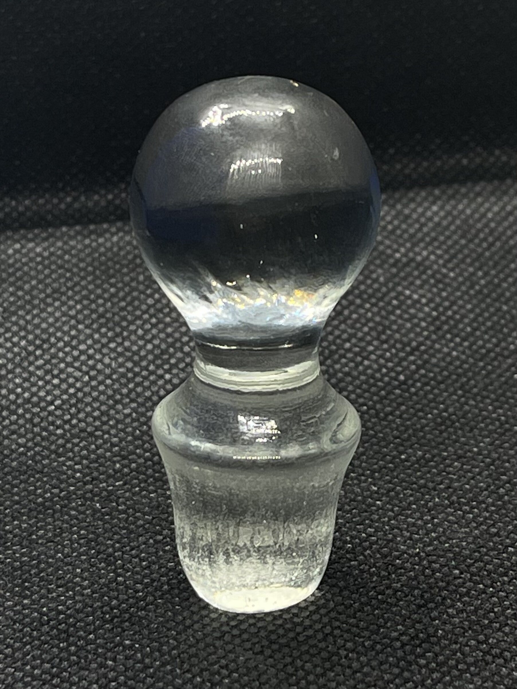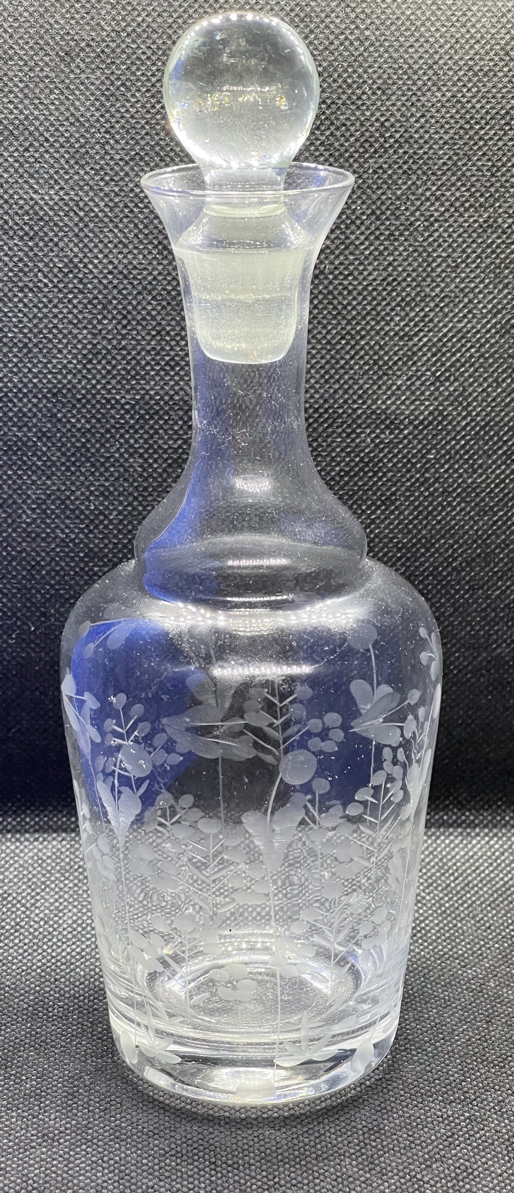 Kristallen karaf met gegraveerde bloemdecoratie.