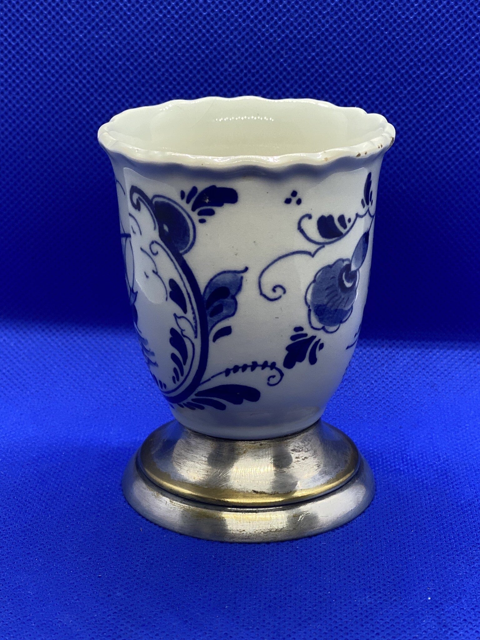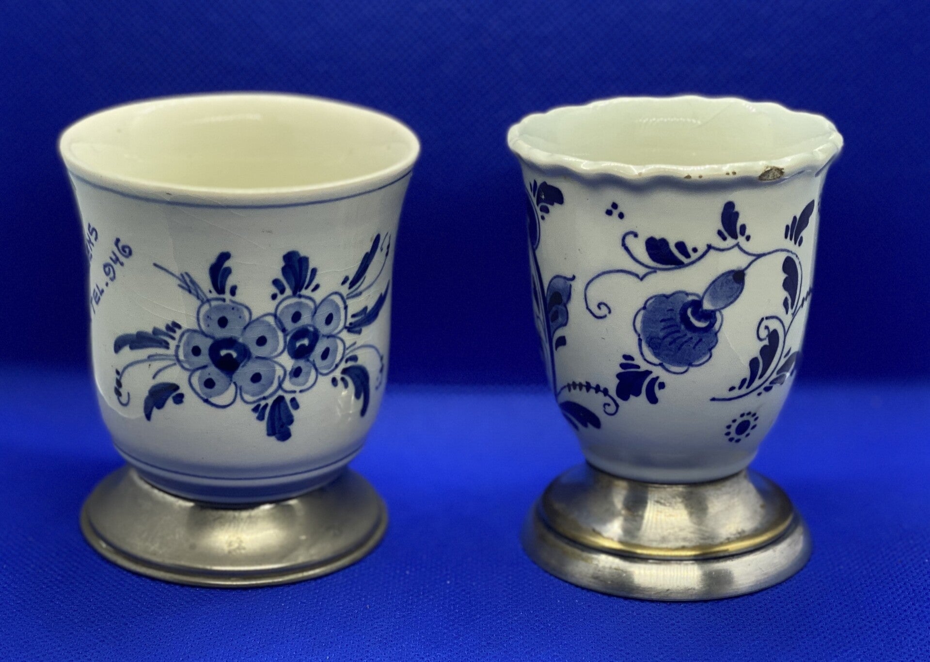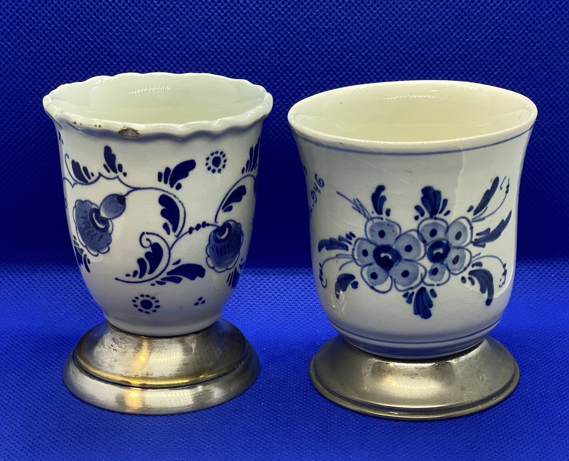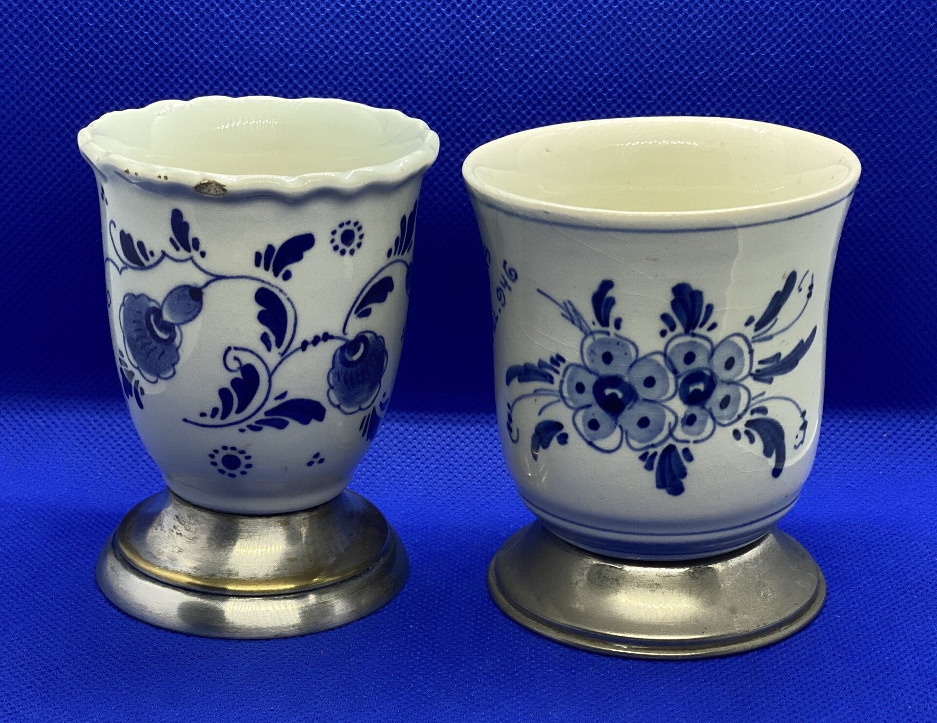Twee delfts blauwe bekervazen op (waarschijnlijk verzilverde) voet.