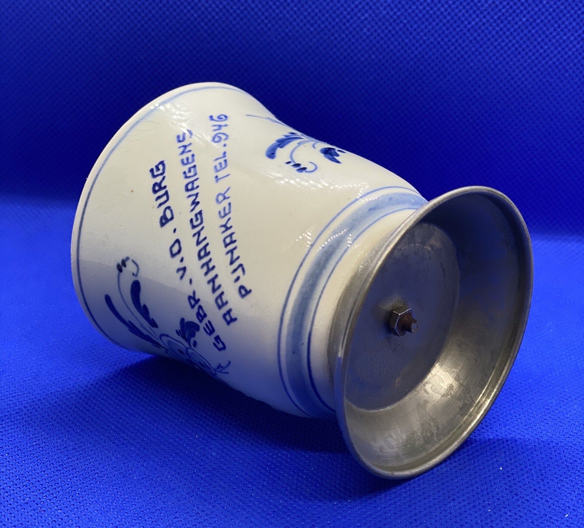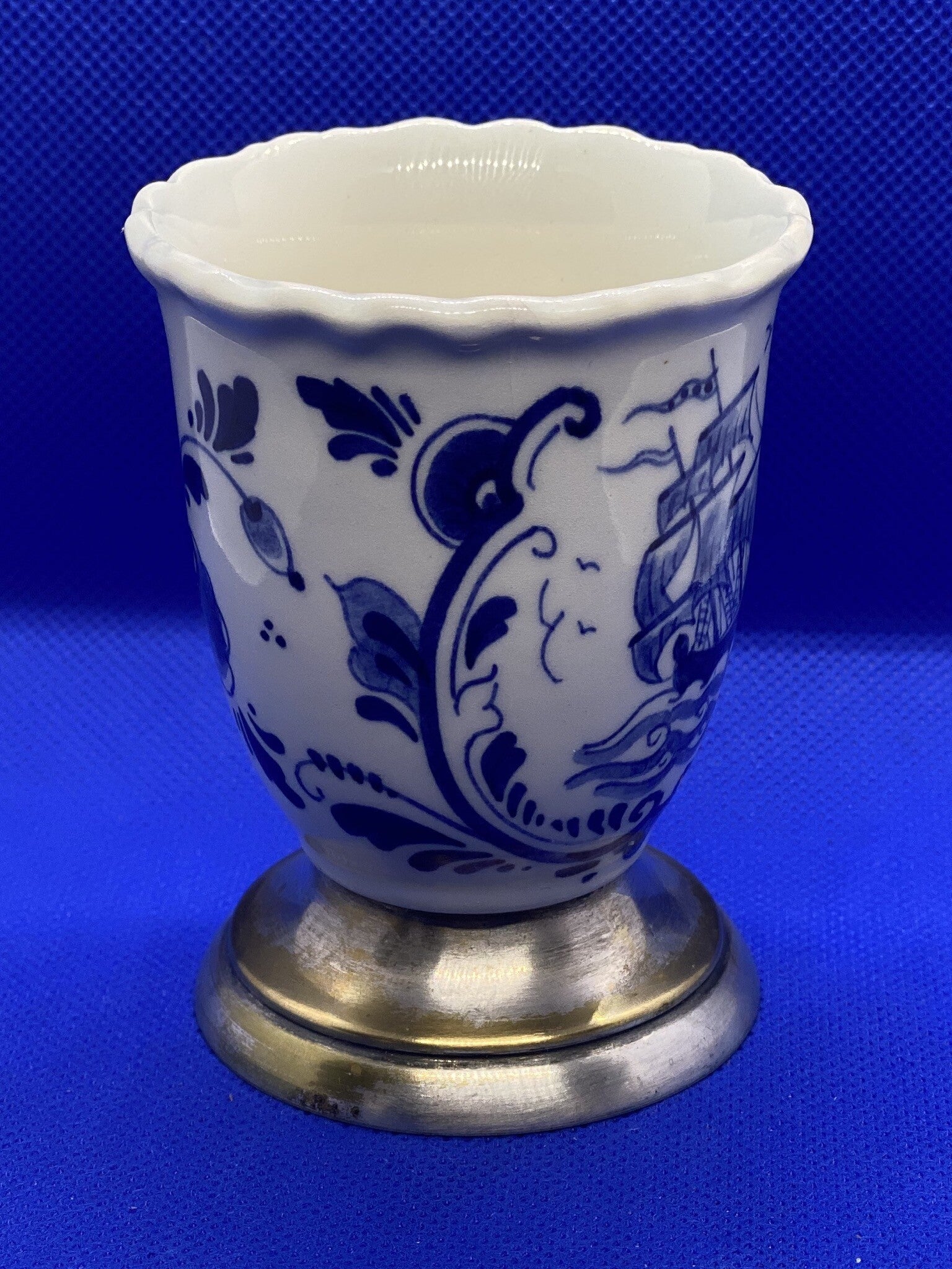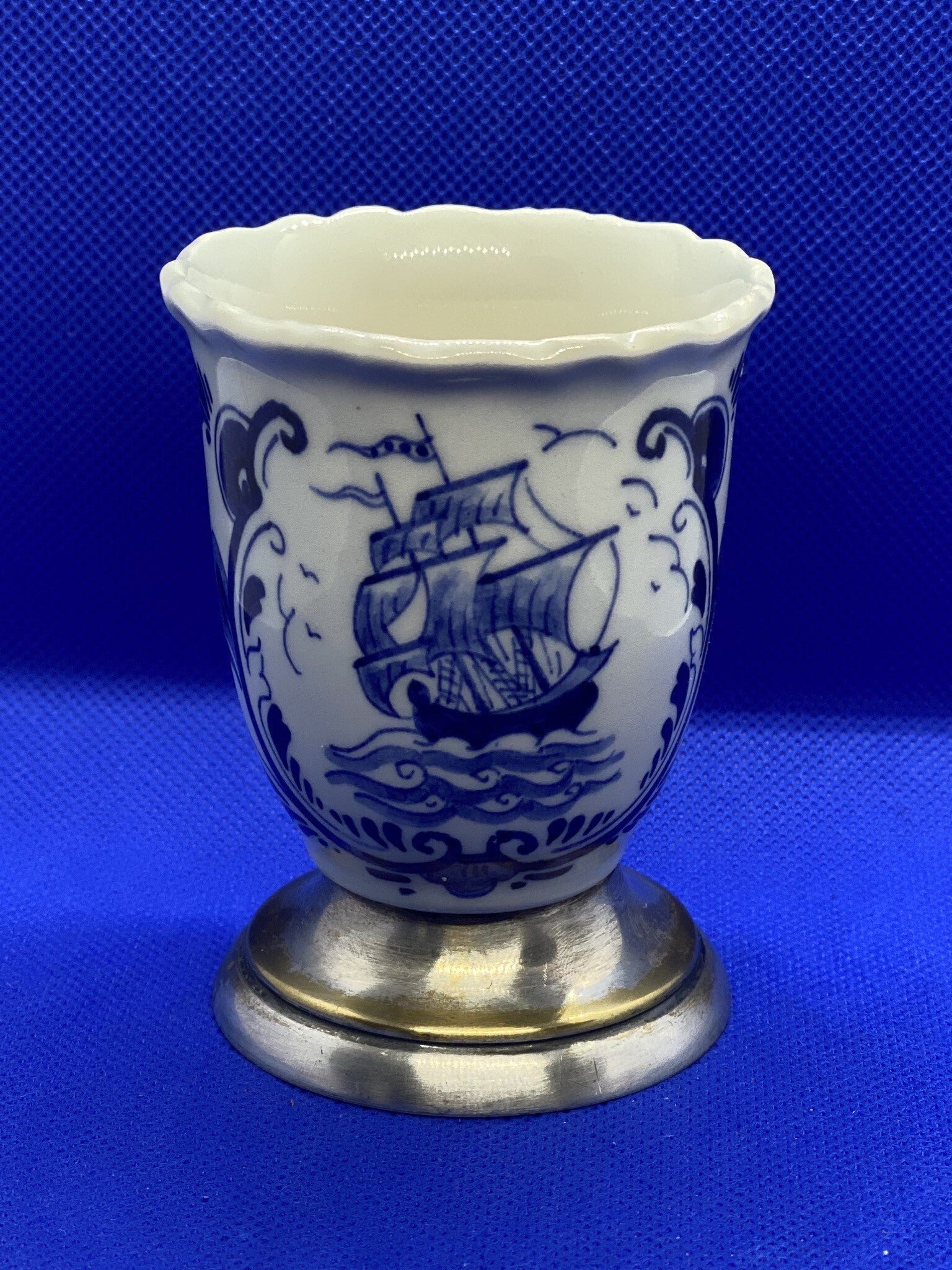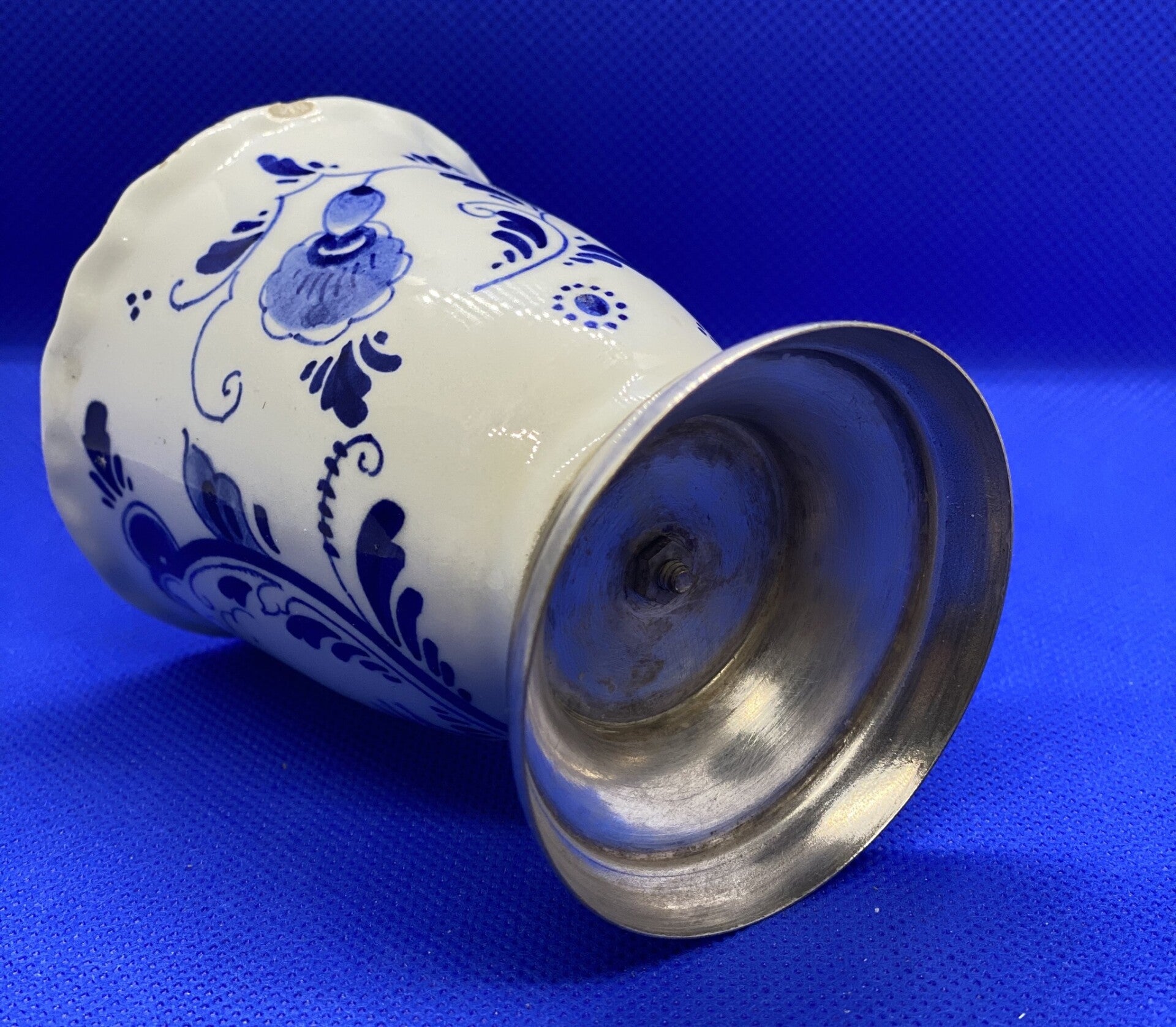 Twee delfts blauwe bekervazen op (waarschijnlijk verzilverde) voet.