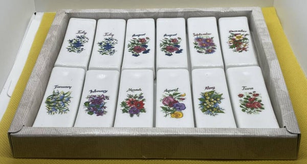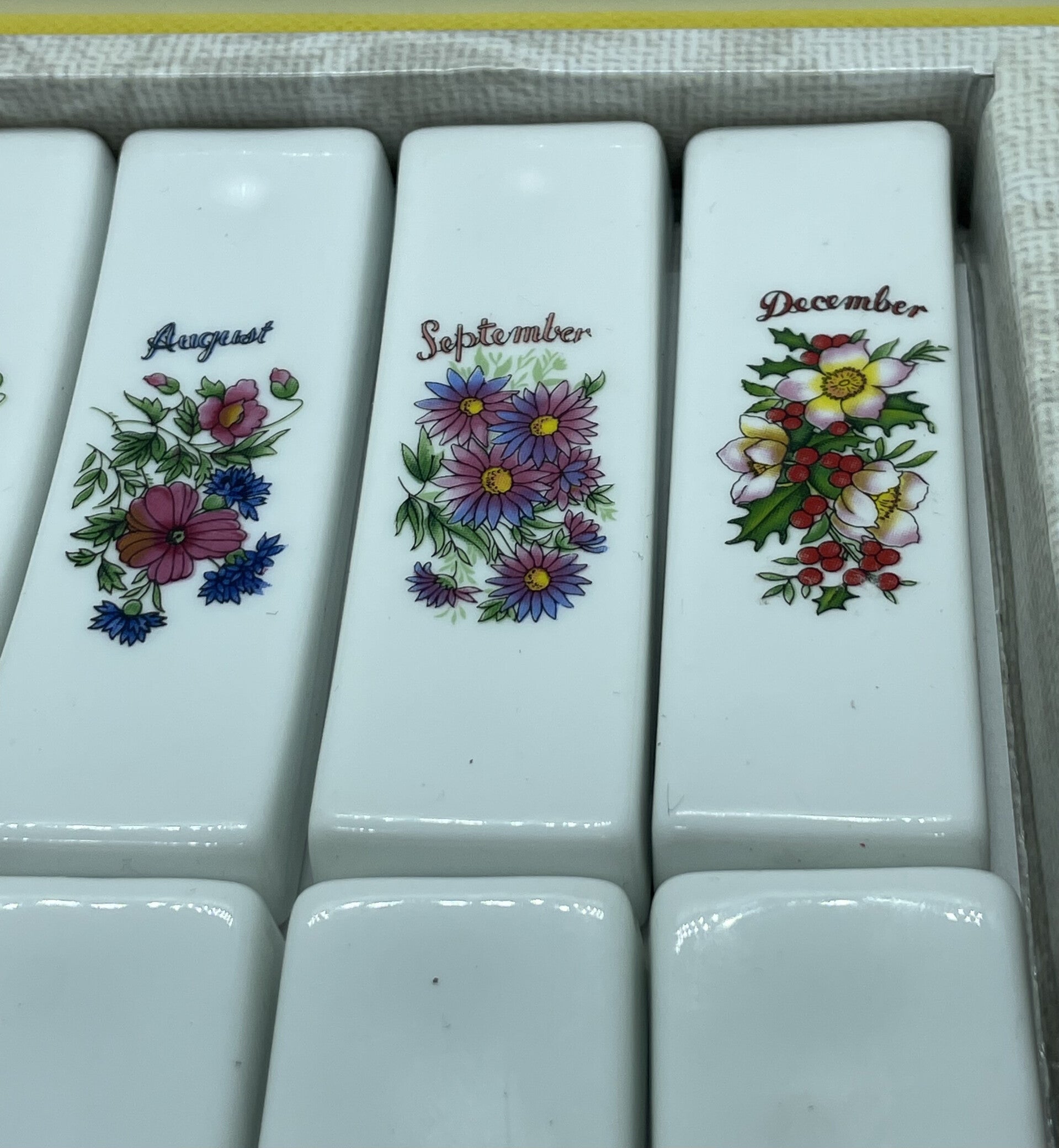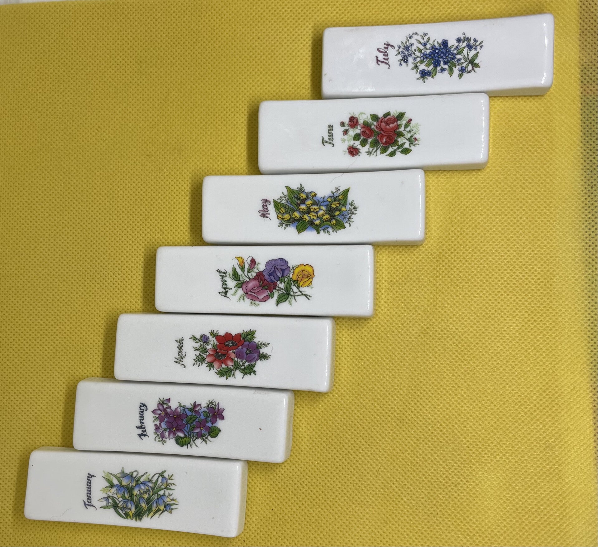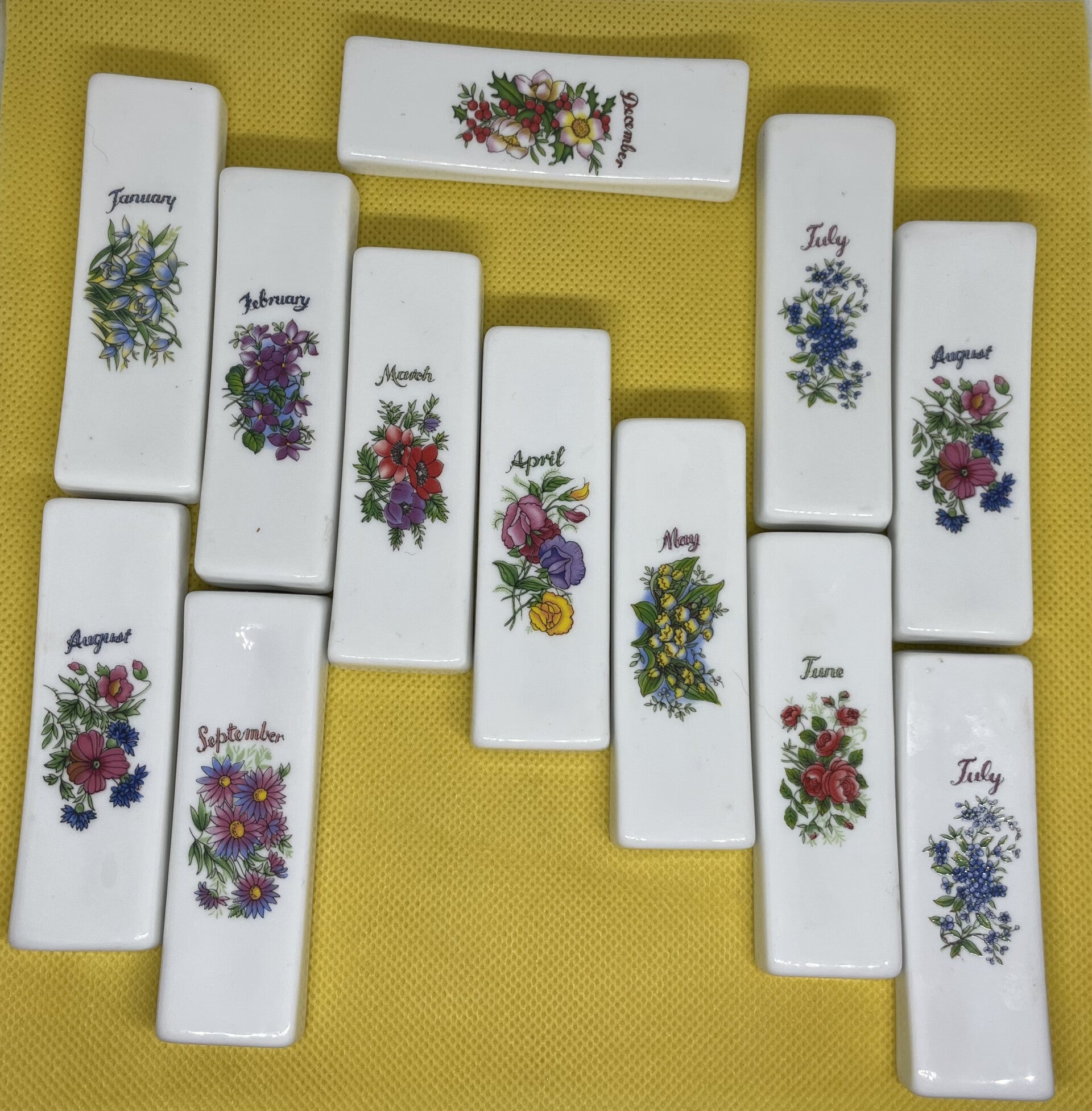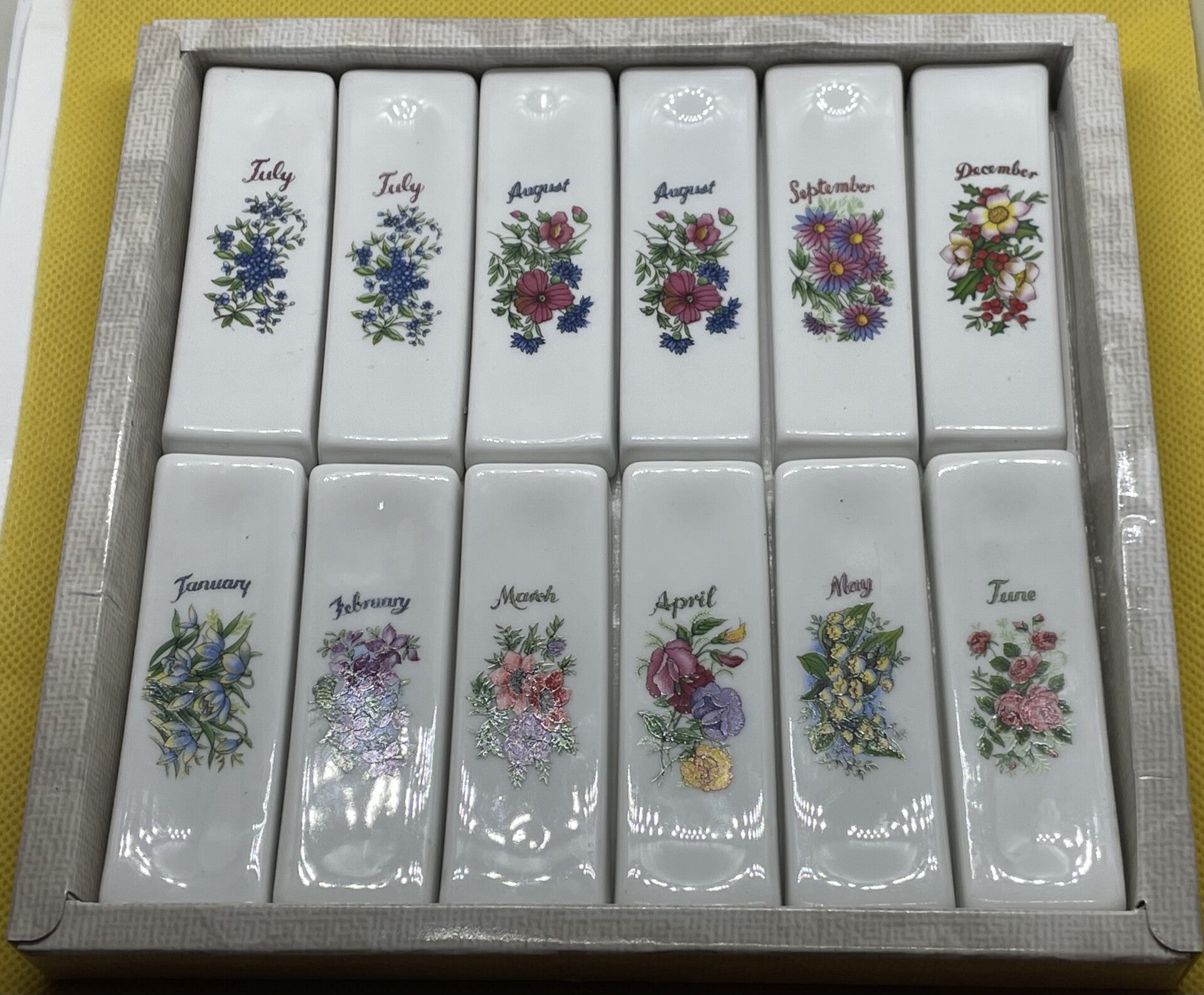 Flower of the month knife rests. Bone China. Bloemrijke proseleinen messenrust set. met bloemen en de maanden van het jaar. Manufacture by Sammi.