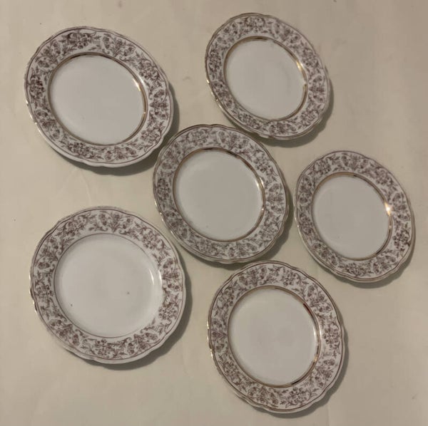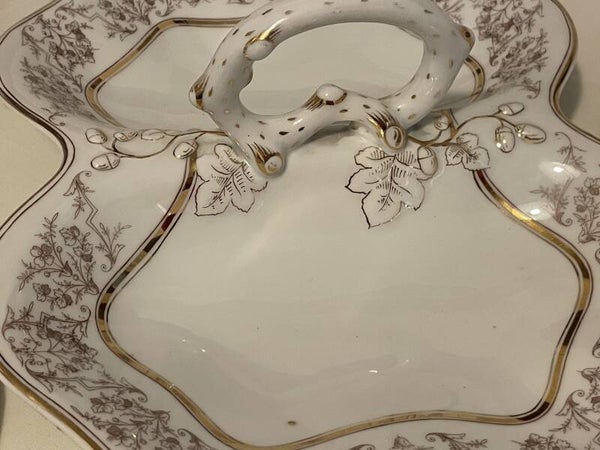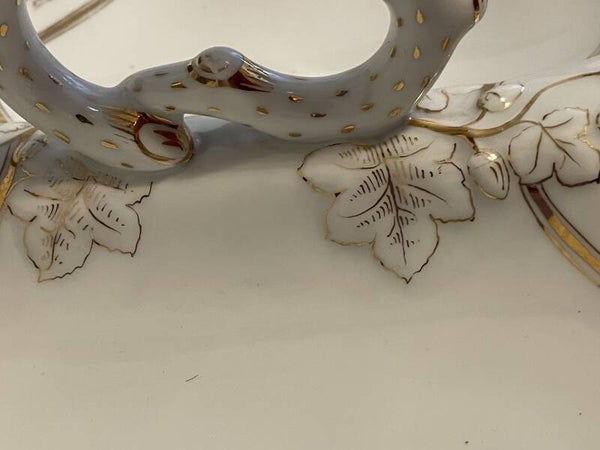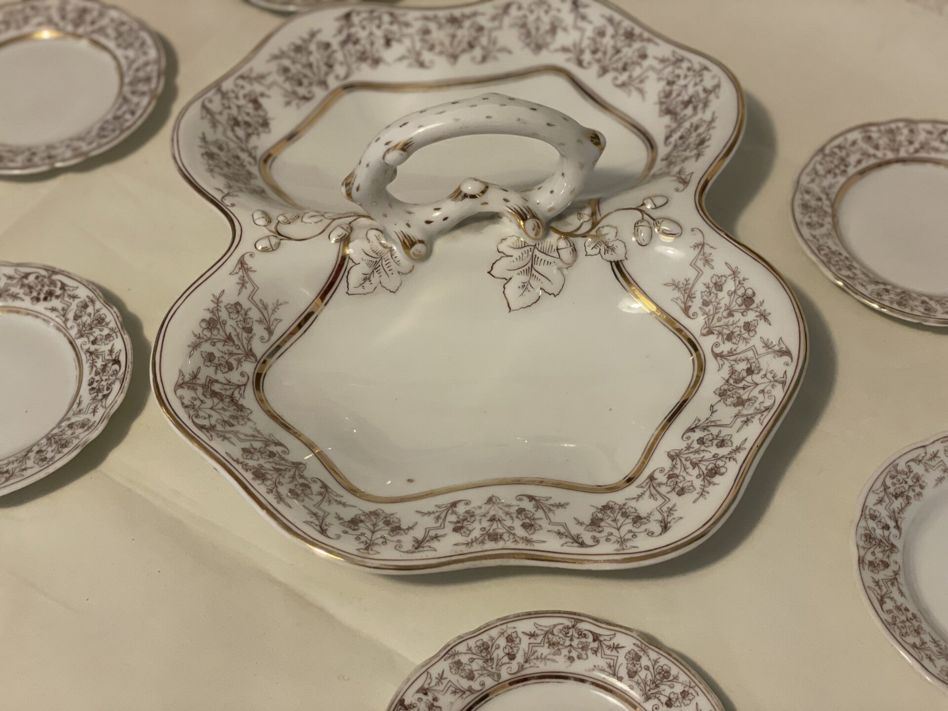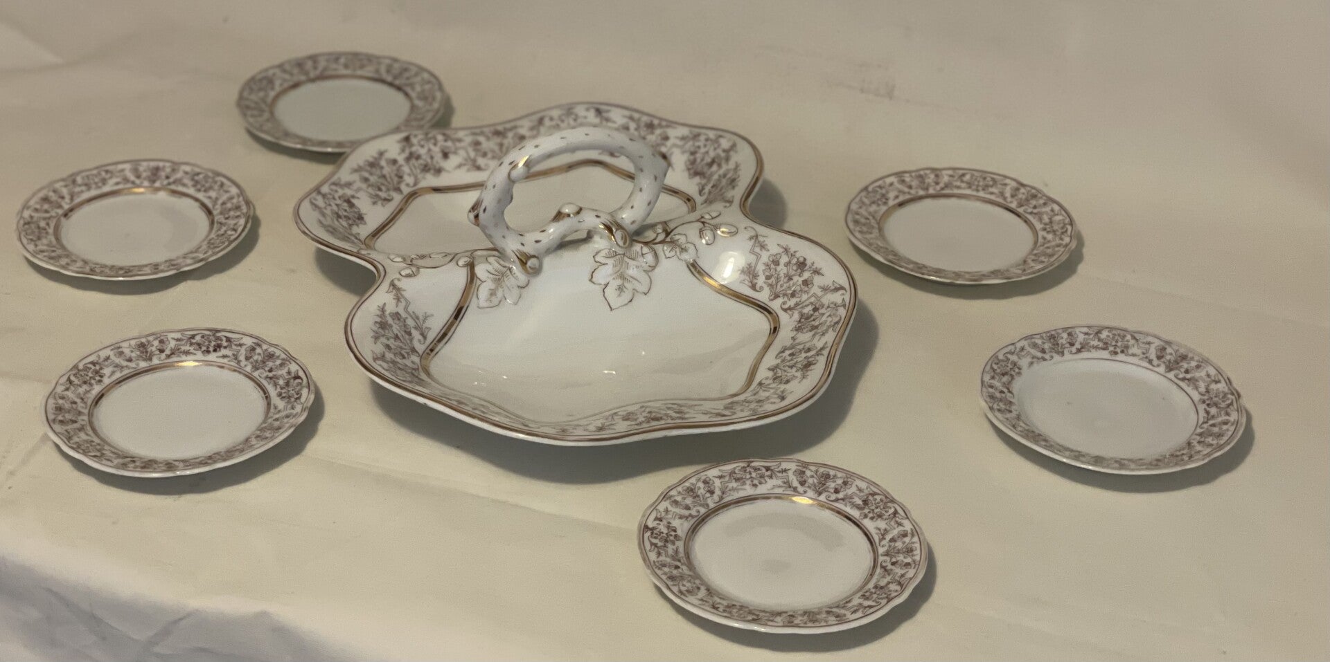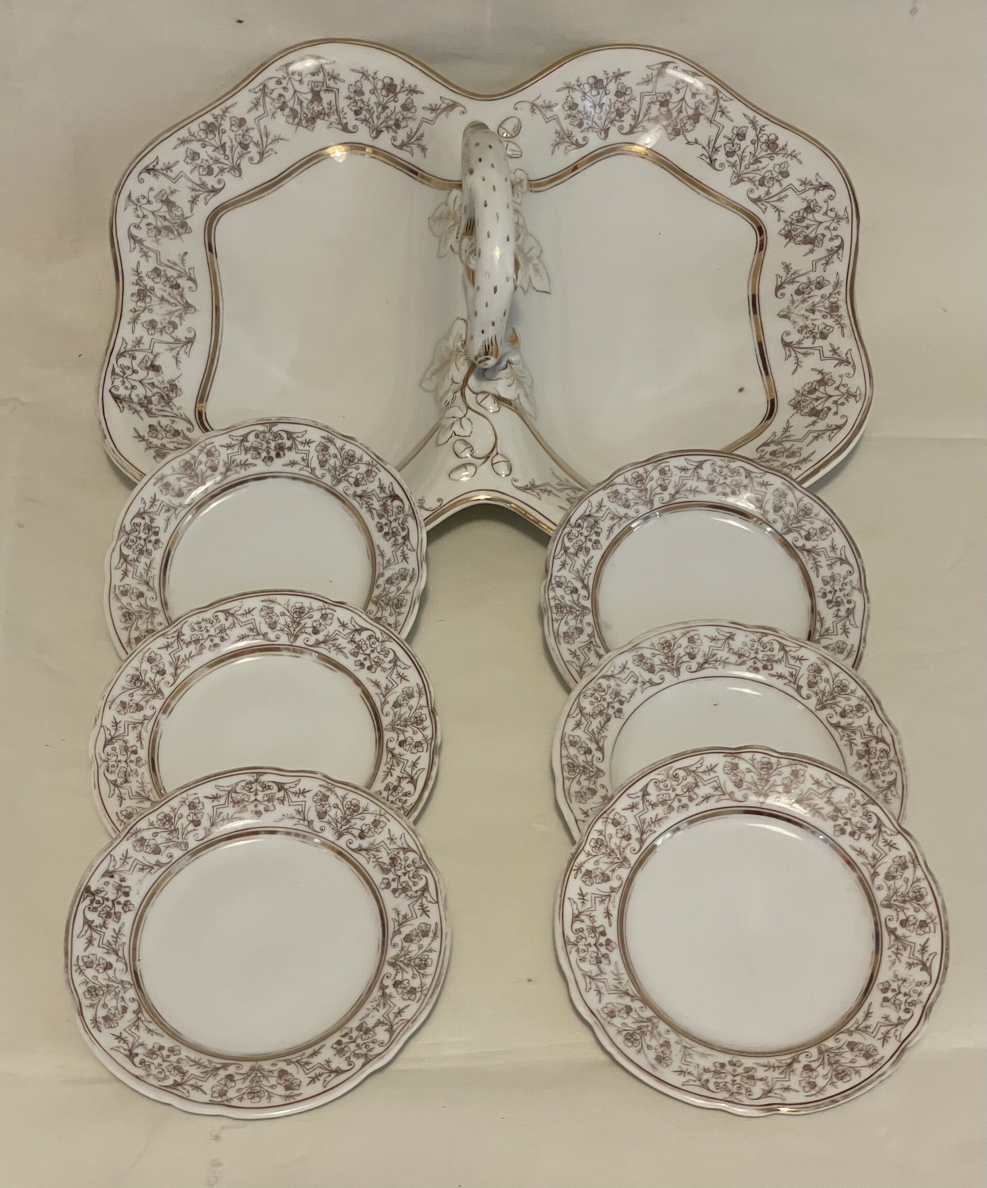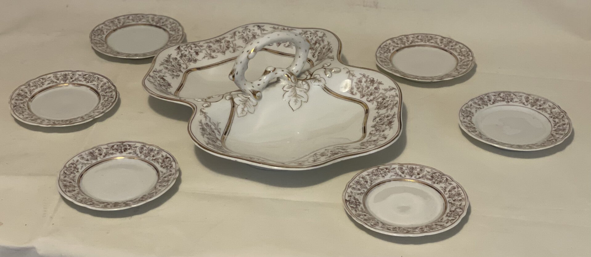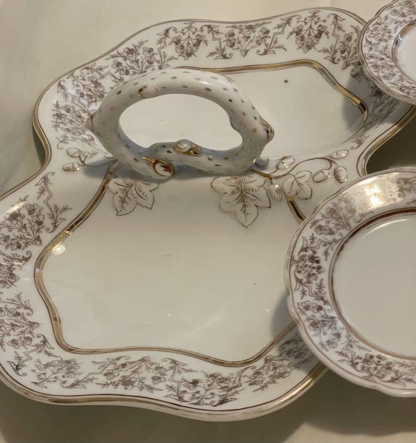 Porseleinen dessert set. 1 serveerblad (centerpiece) voor dessertjes en 6 dessertborden.