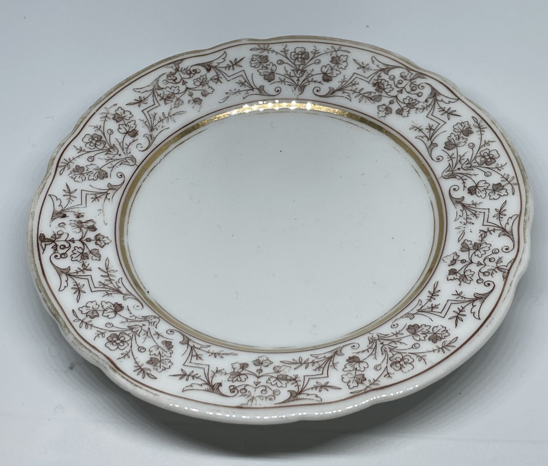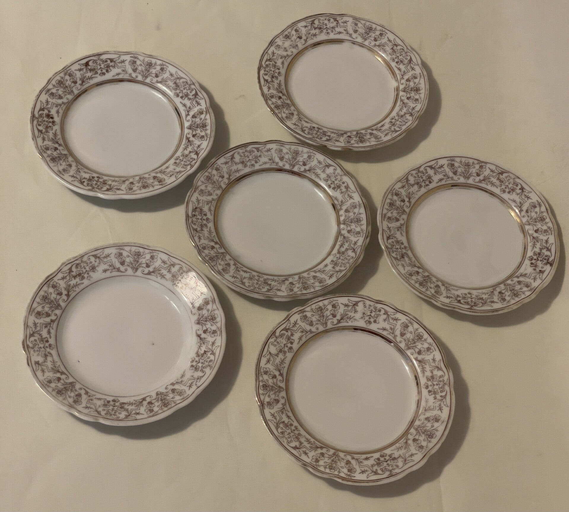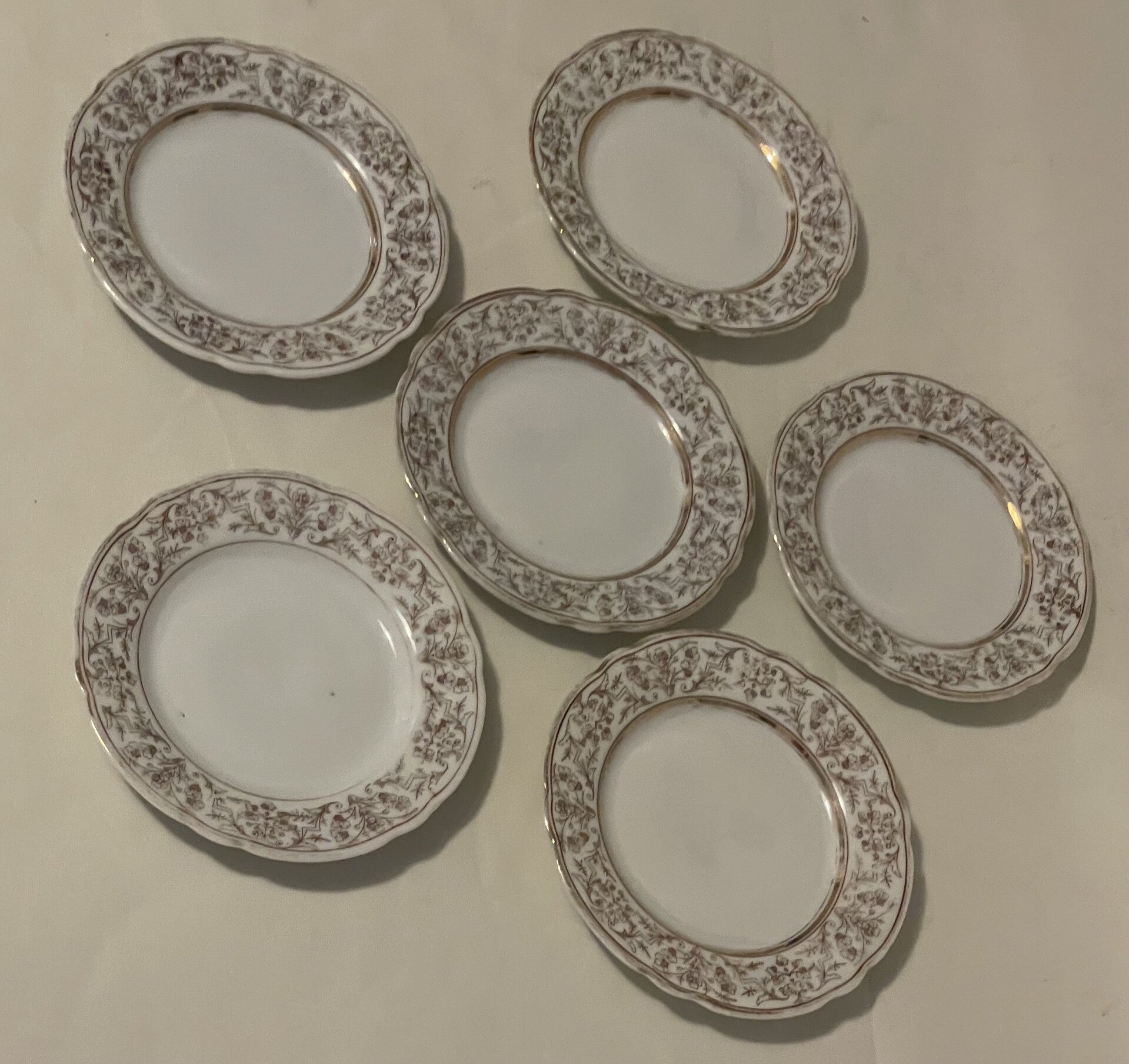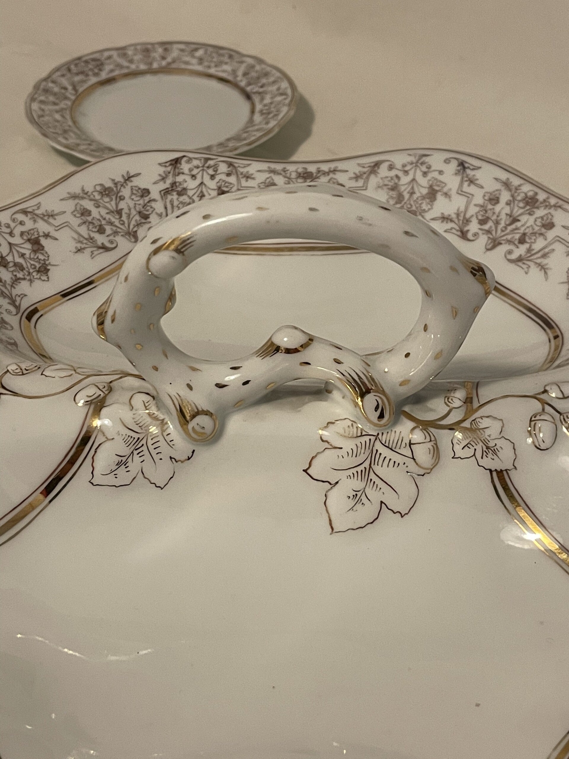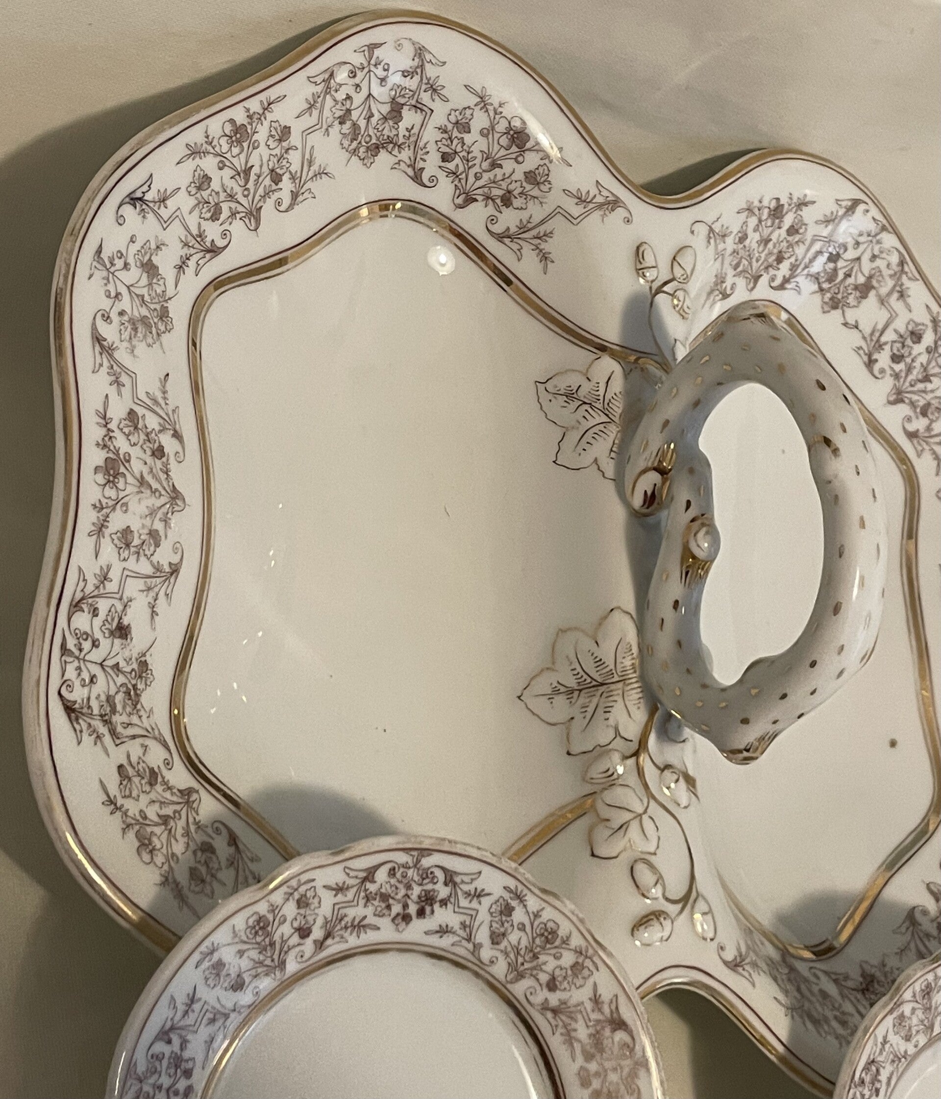 Porseleinen dessert set. 1 serveerblad (centerpiece) voor dessertjes en 6 dessertborden.
