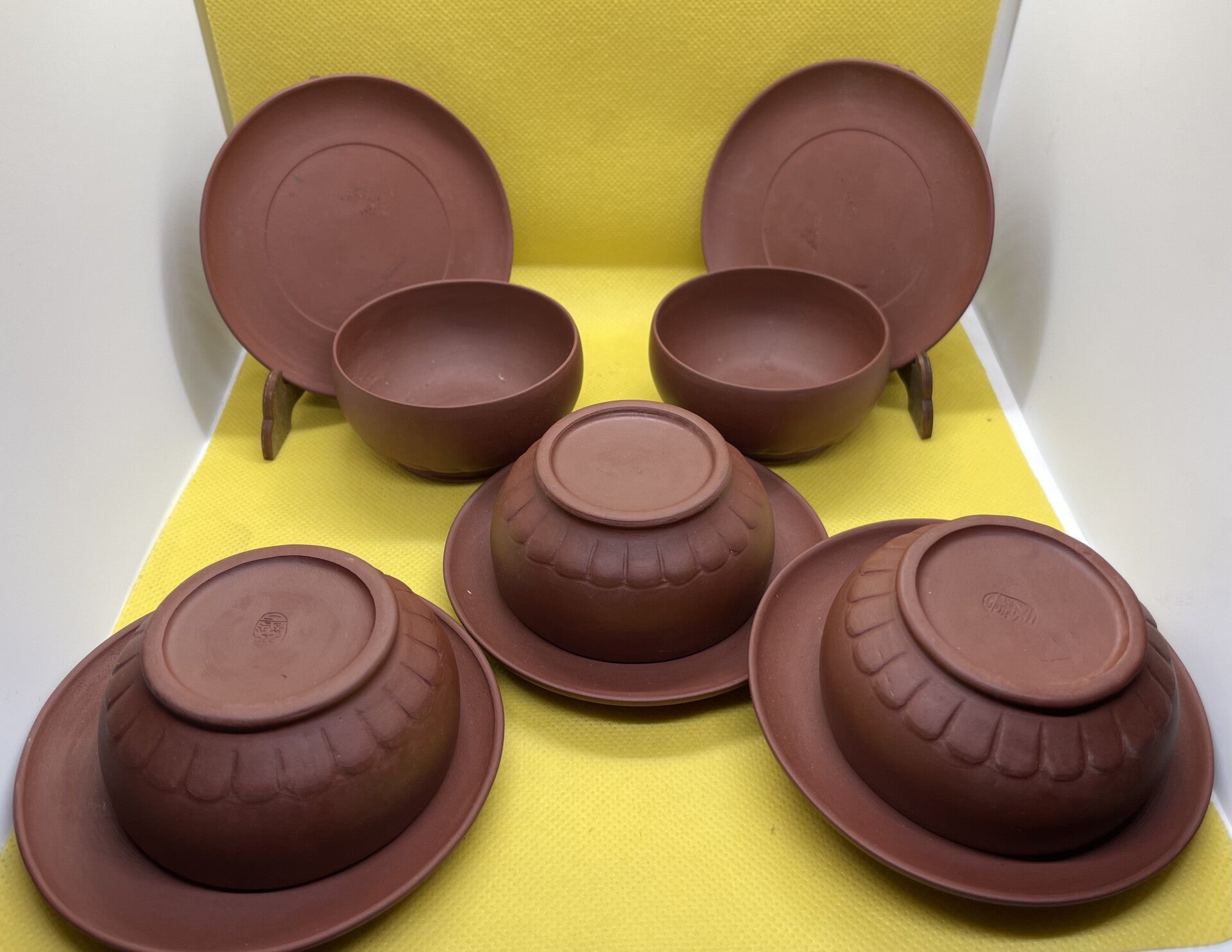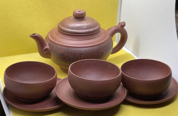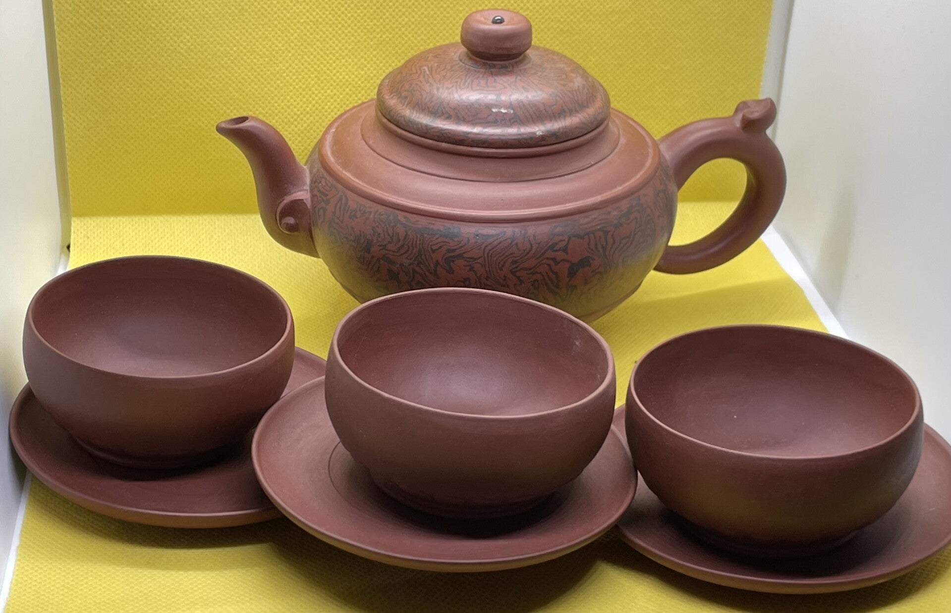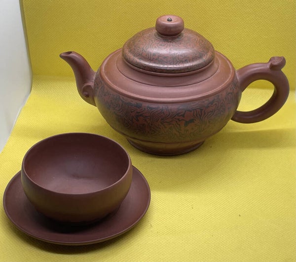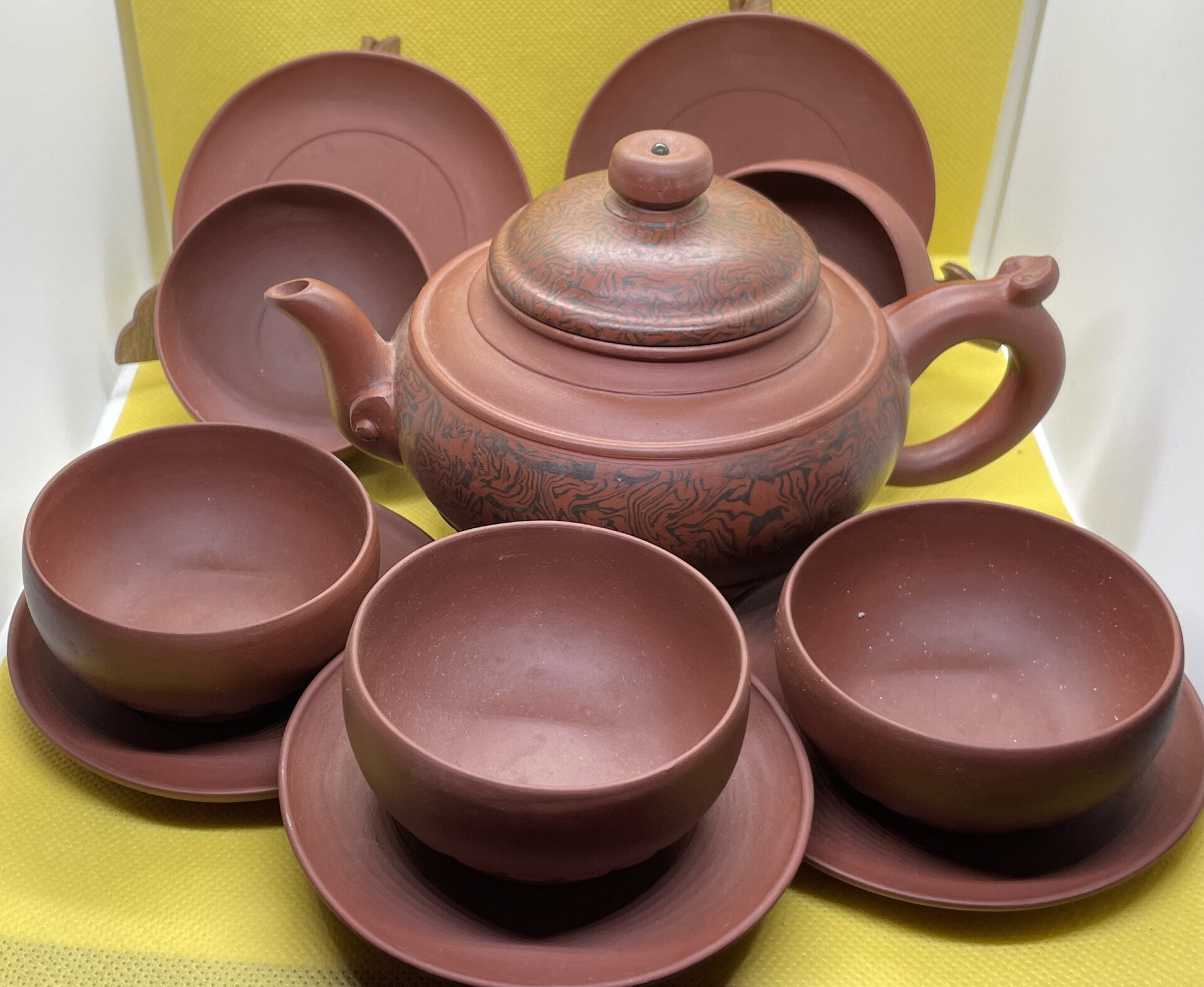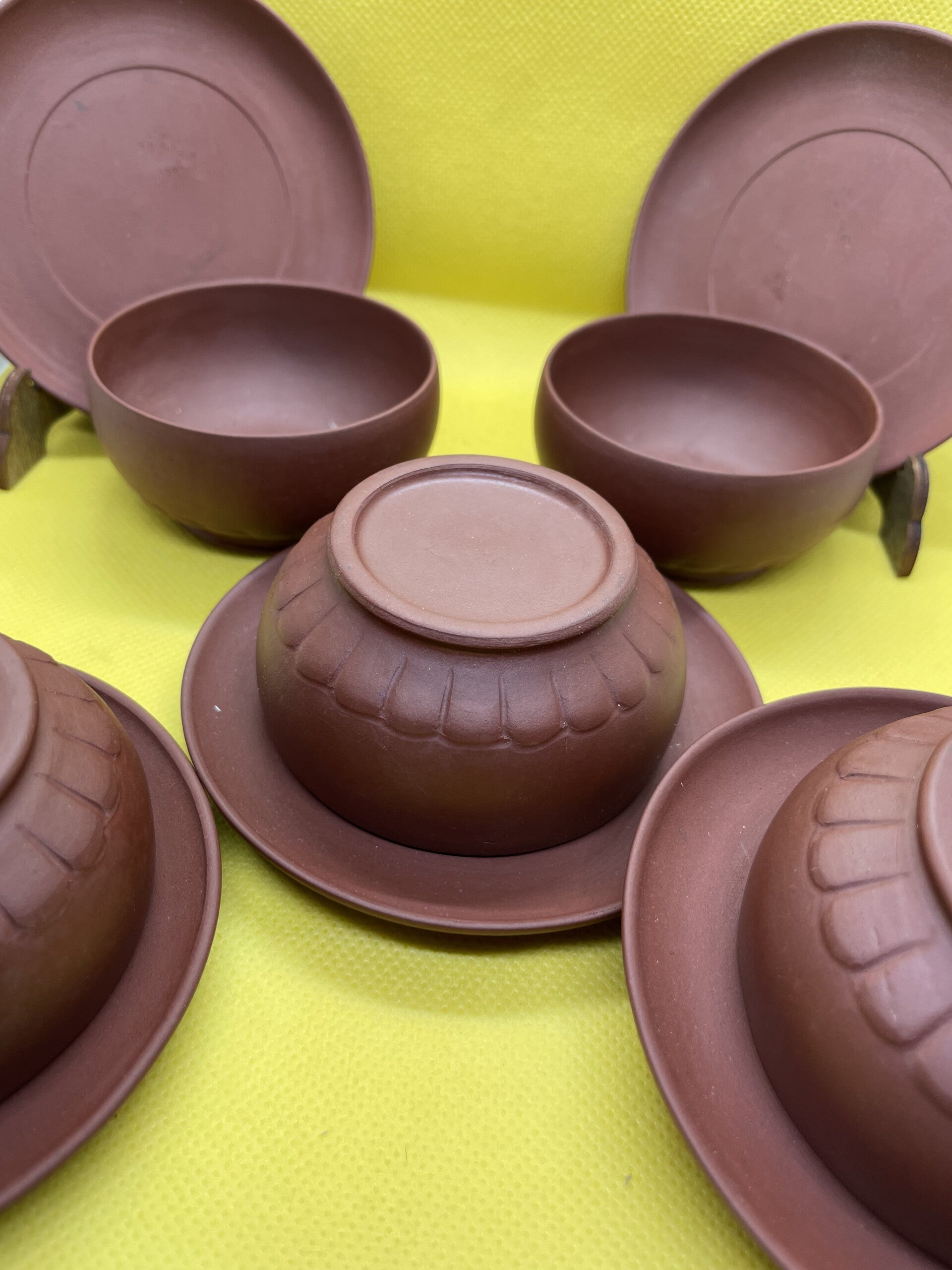 5 theekopjes en schoteltjes en een theepot. Chinese Zisha/ Yinix theepotjes, gegraveerd.