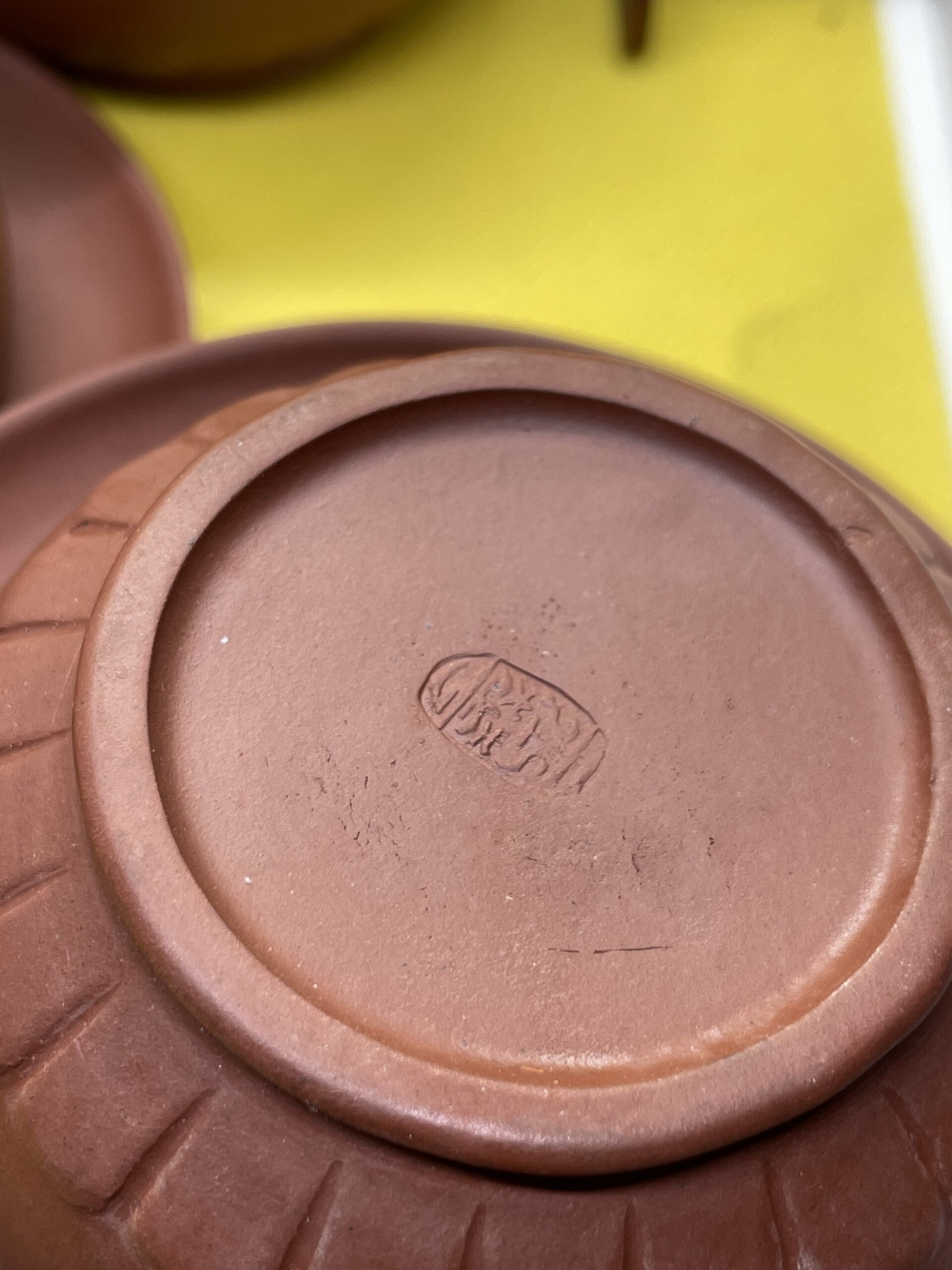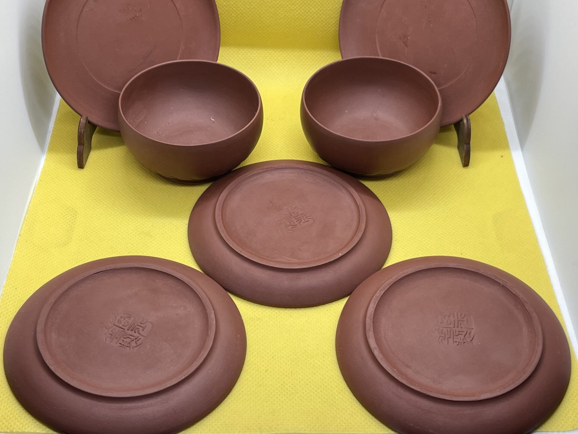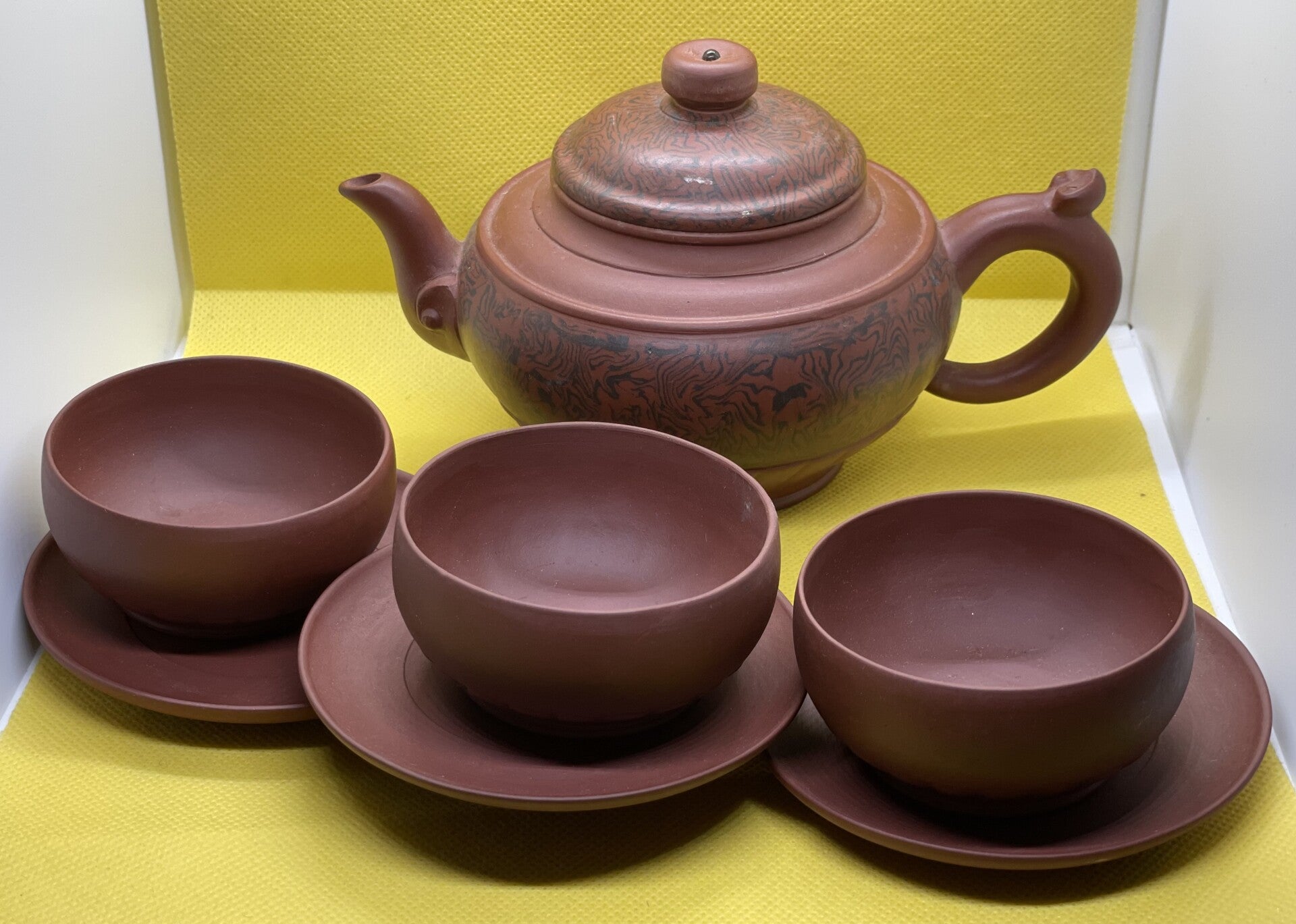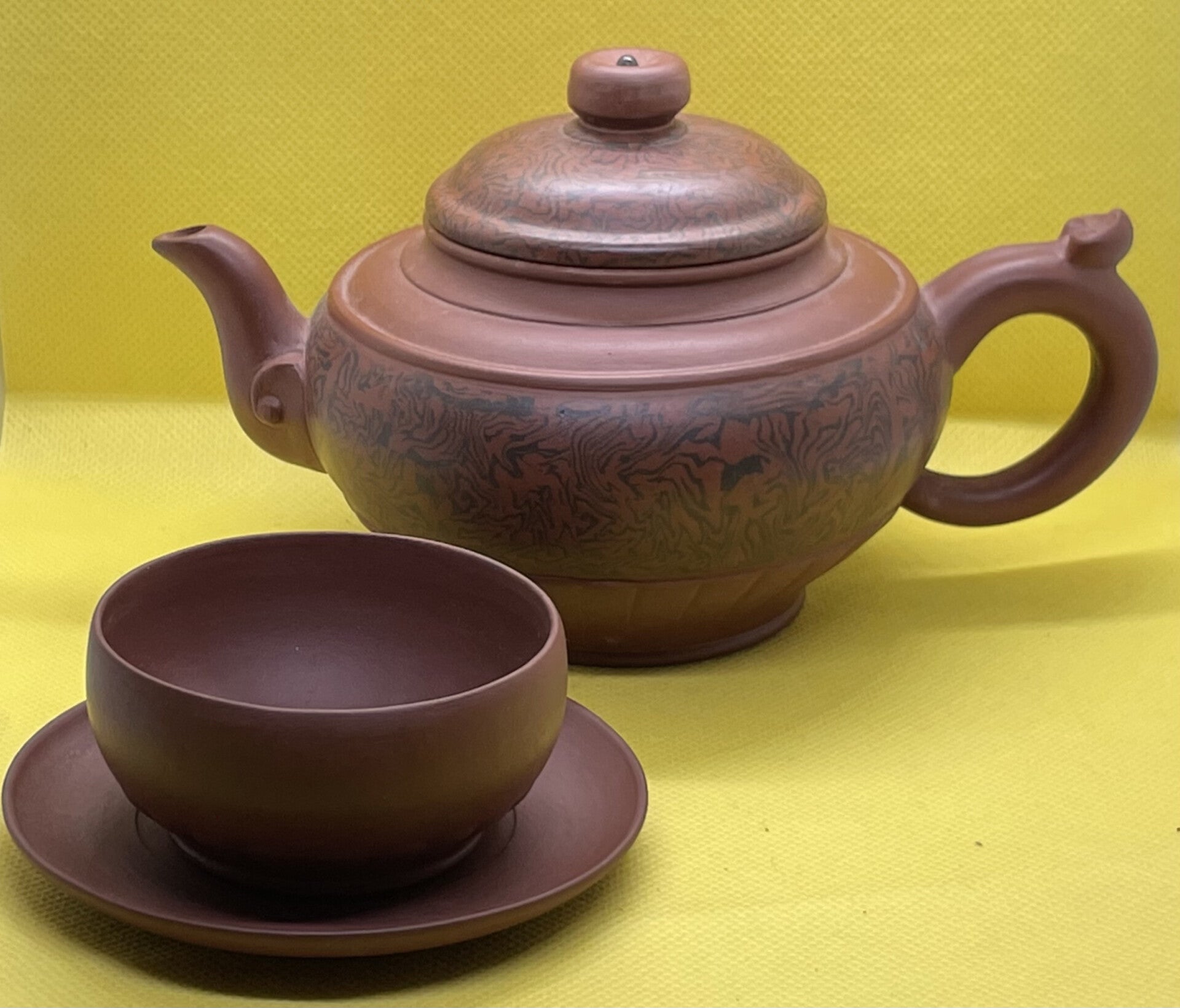 5 theekopjes en schoteltjes en een theepot. Chinese Zisha/ Yinix theepotjes, gegraveerd.