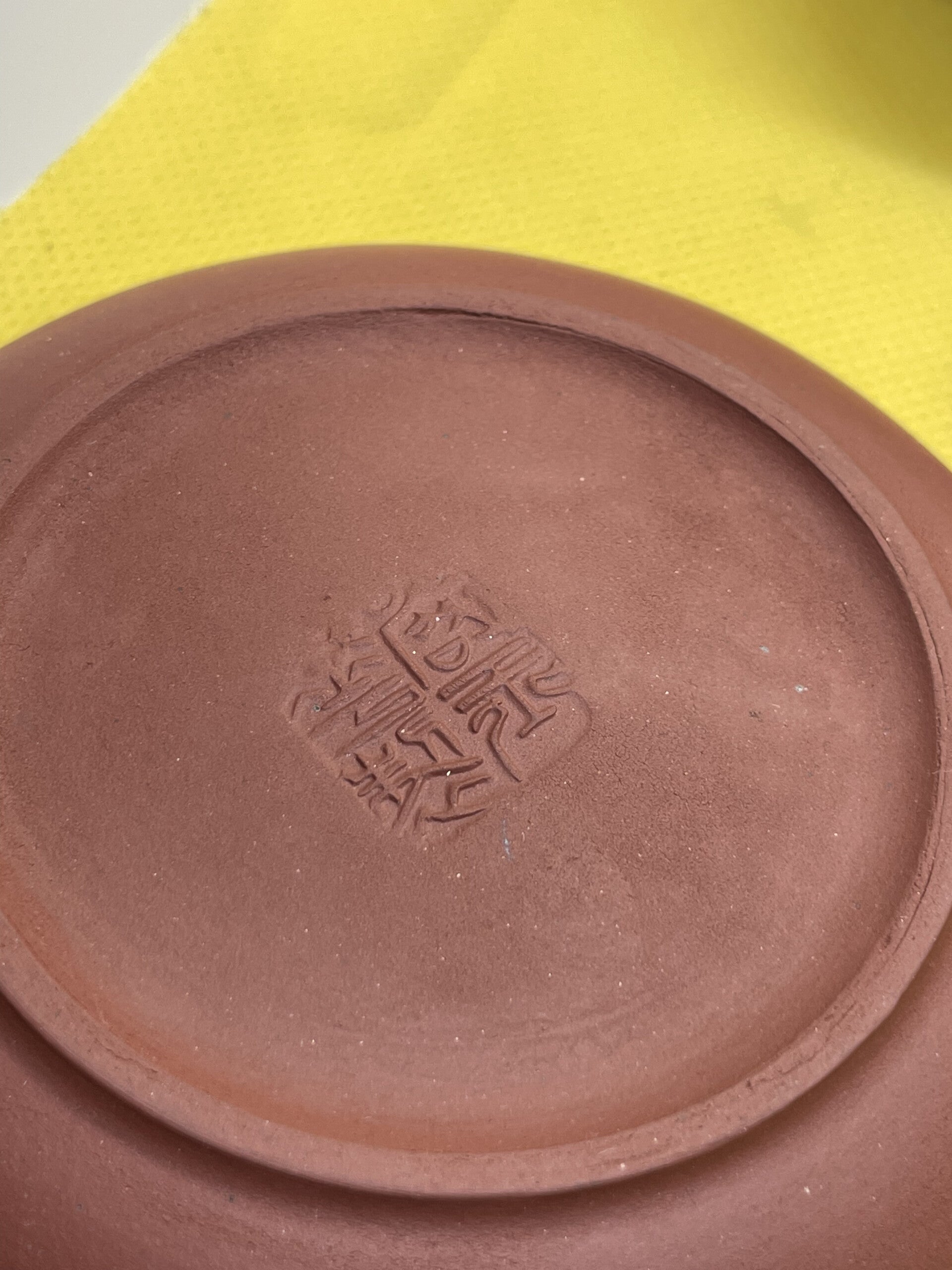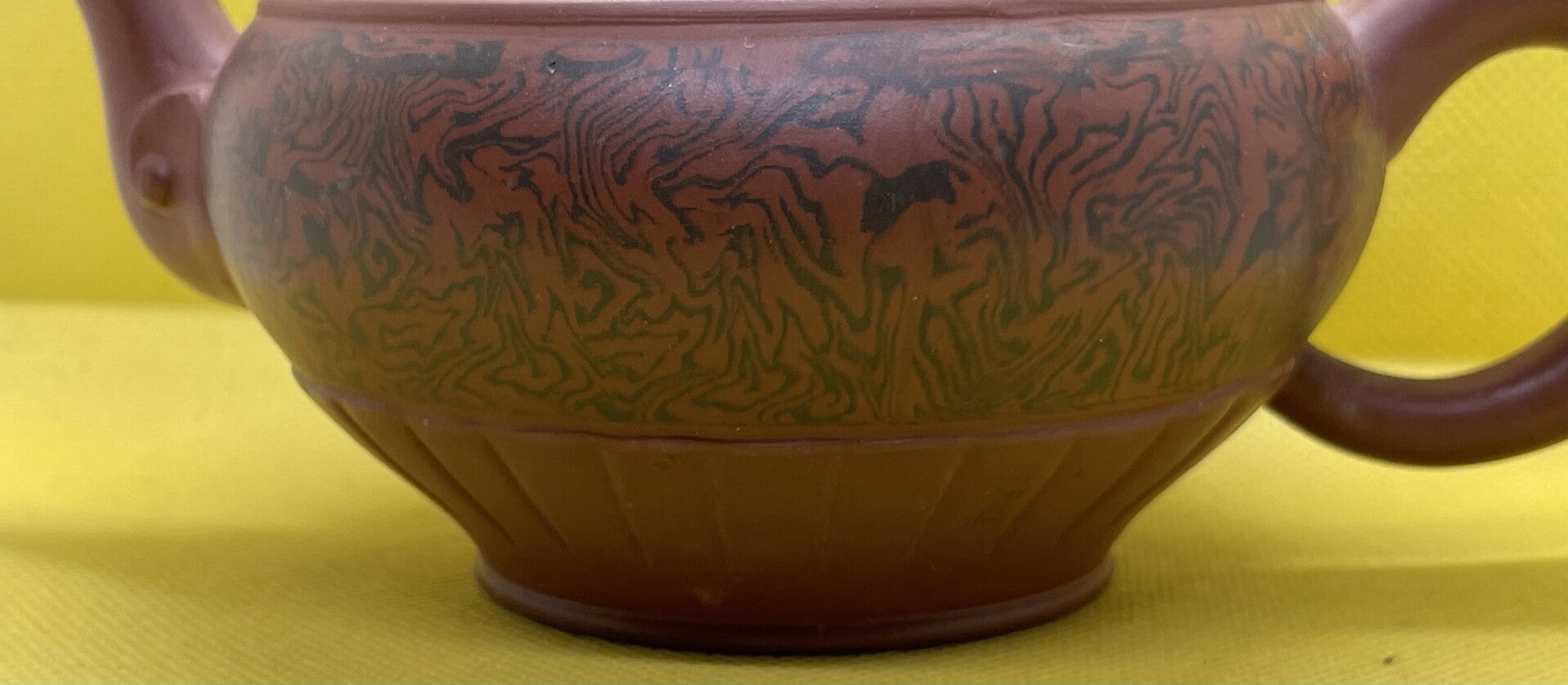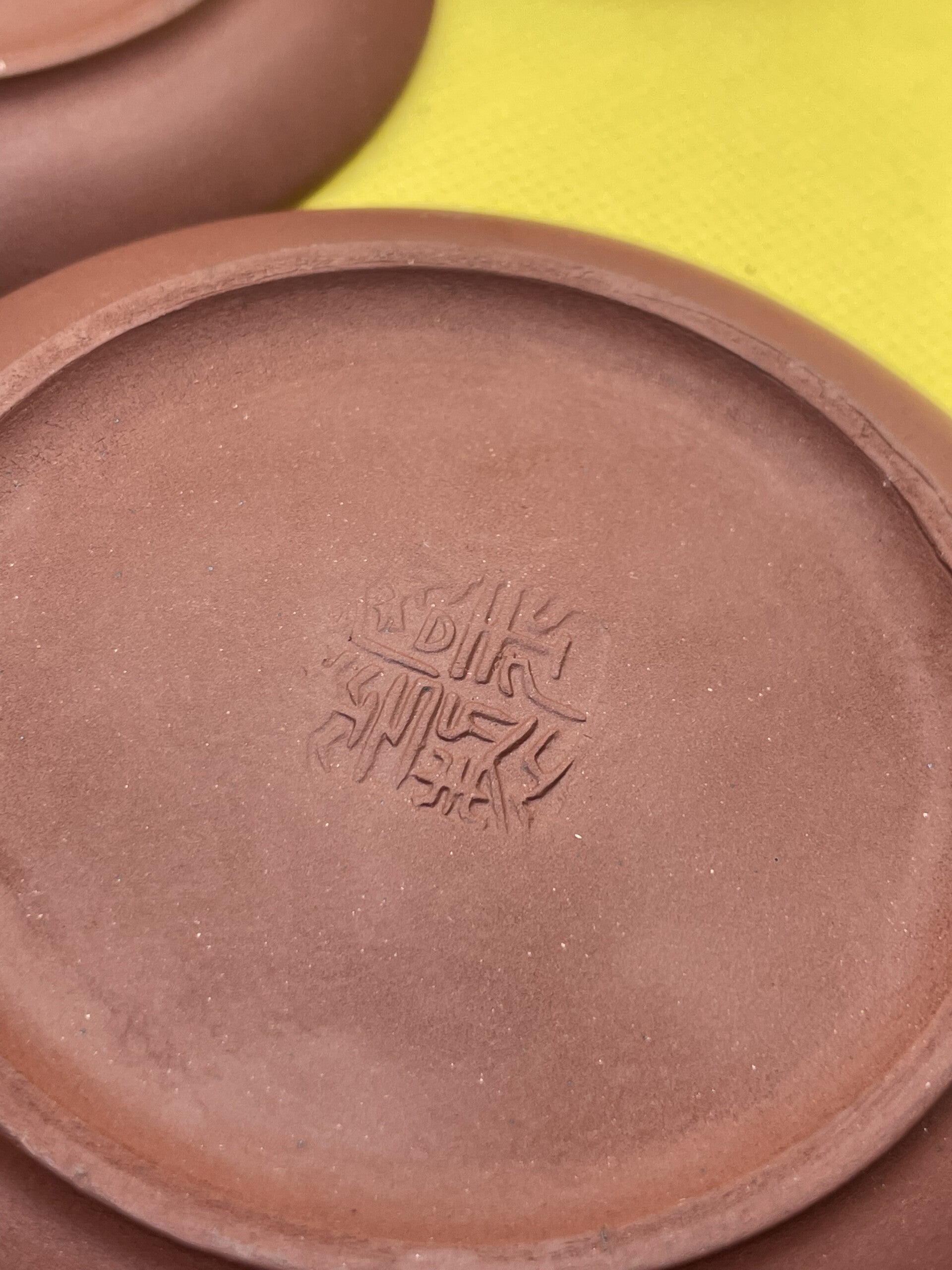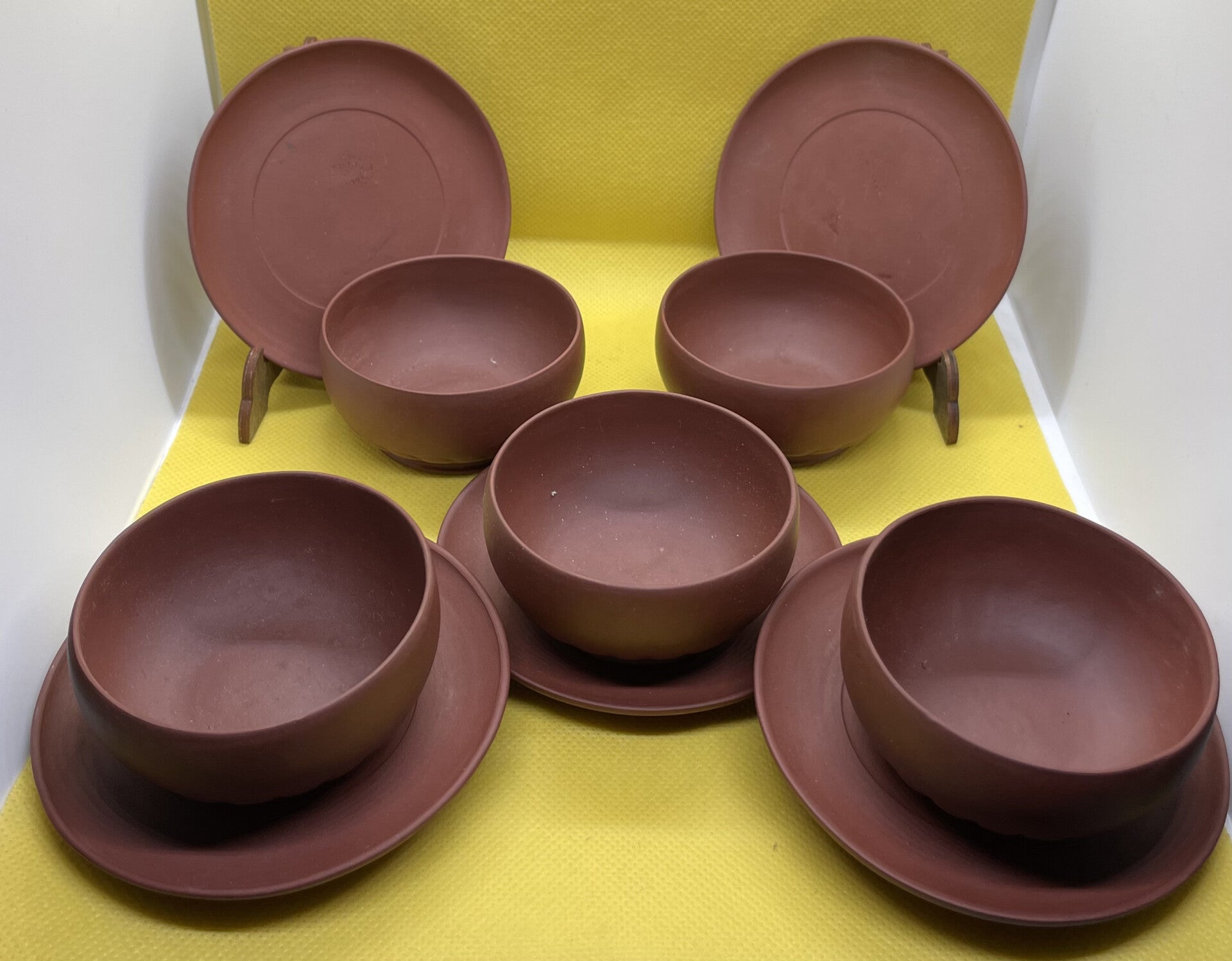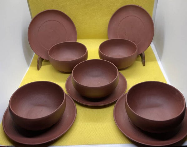 5 theekopjes en schoteltjes en een theepot. Chinese Zisha/ Yinix theepotjes, gegraveerd.