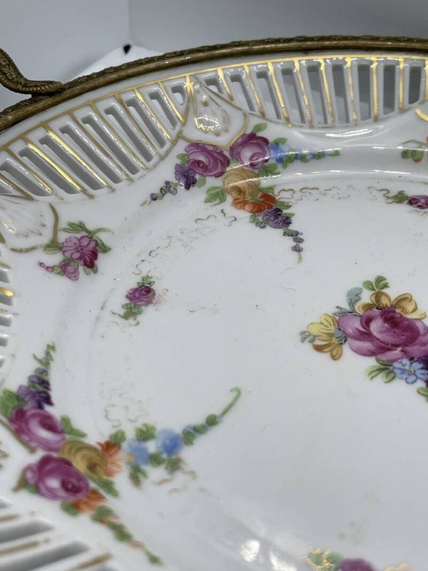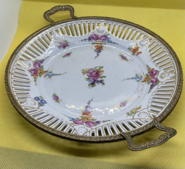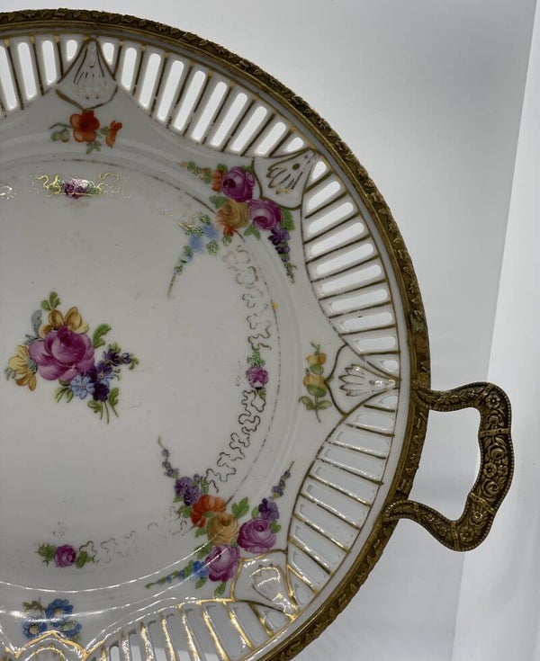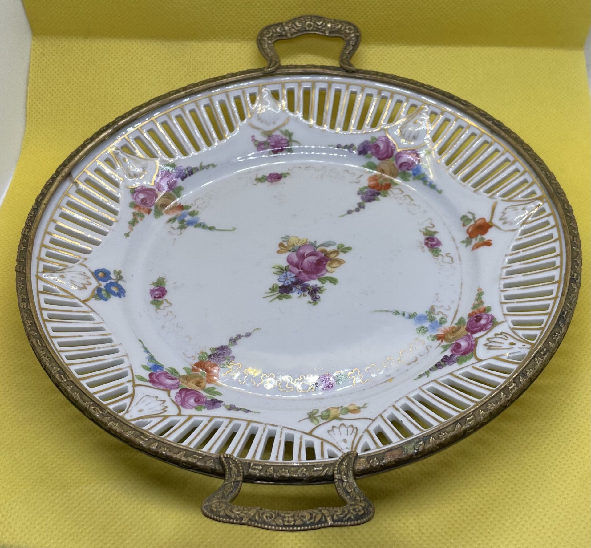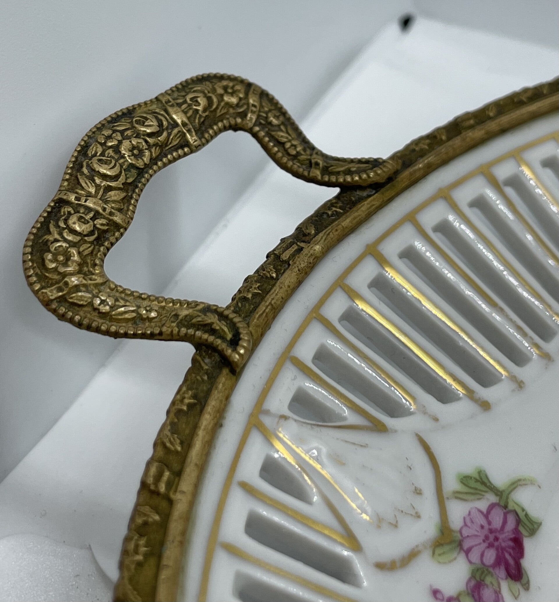 Porseleinen schaaltje met bronzen rand en met bloemen gedecoreerd.