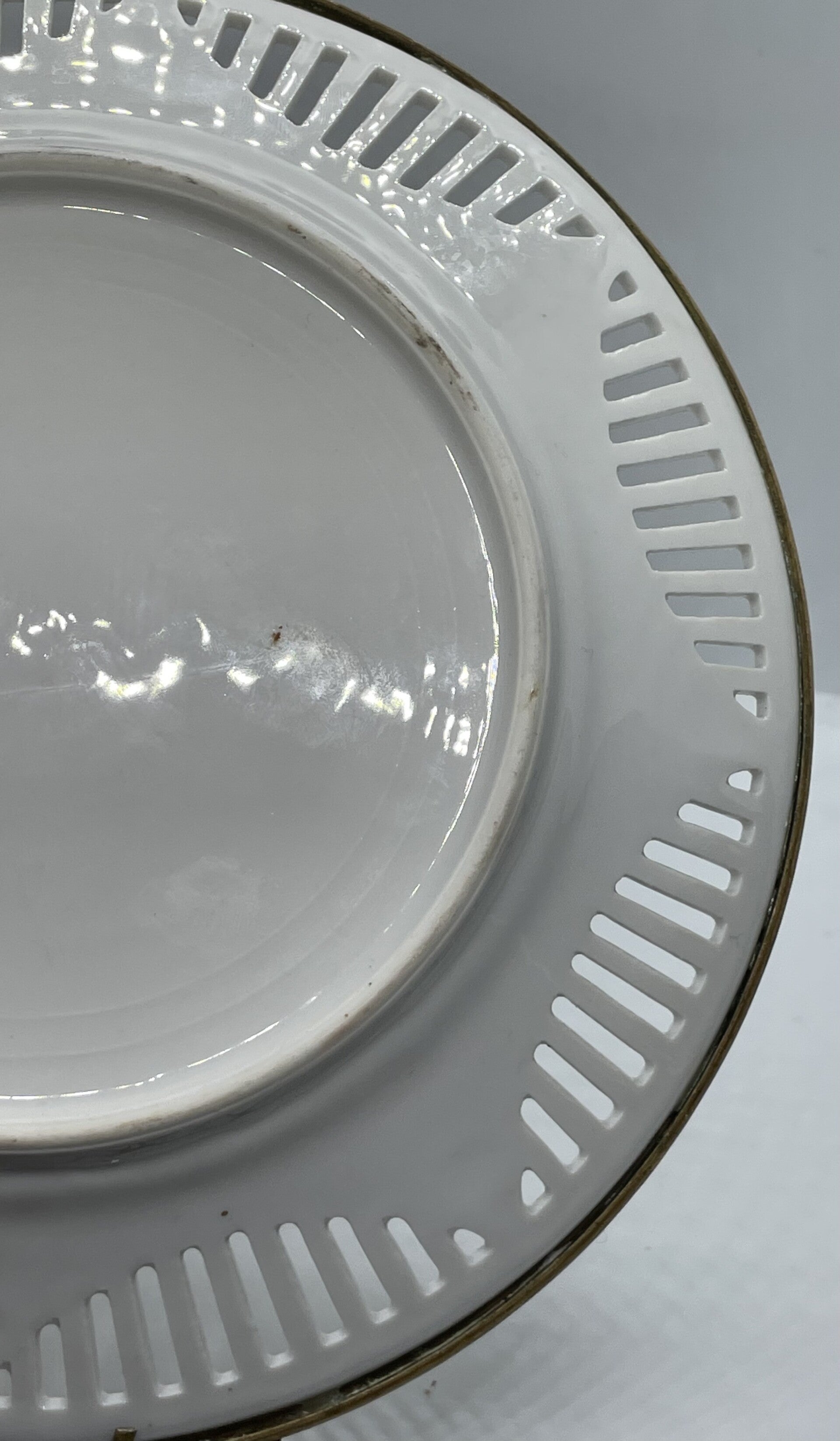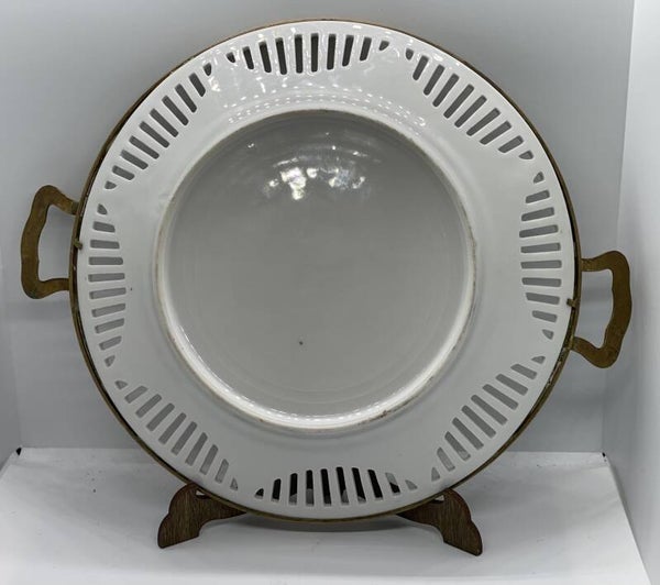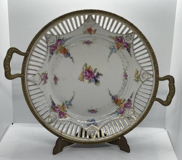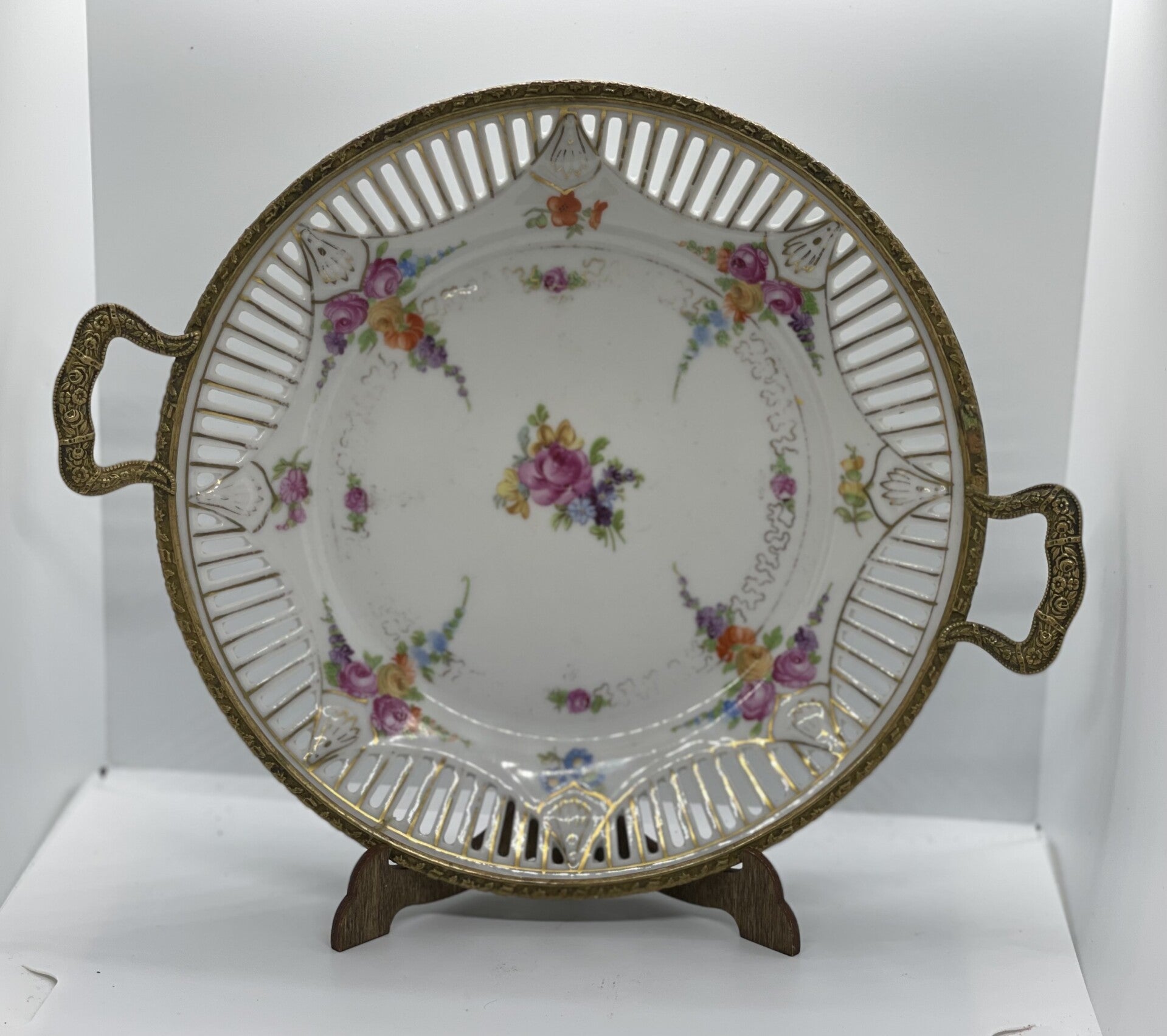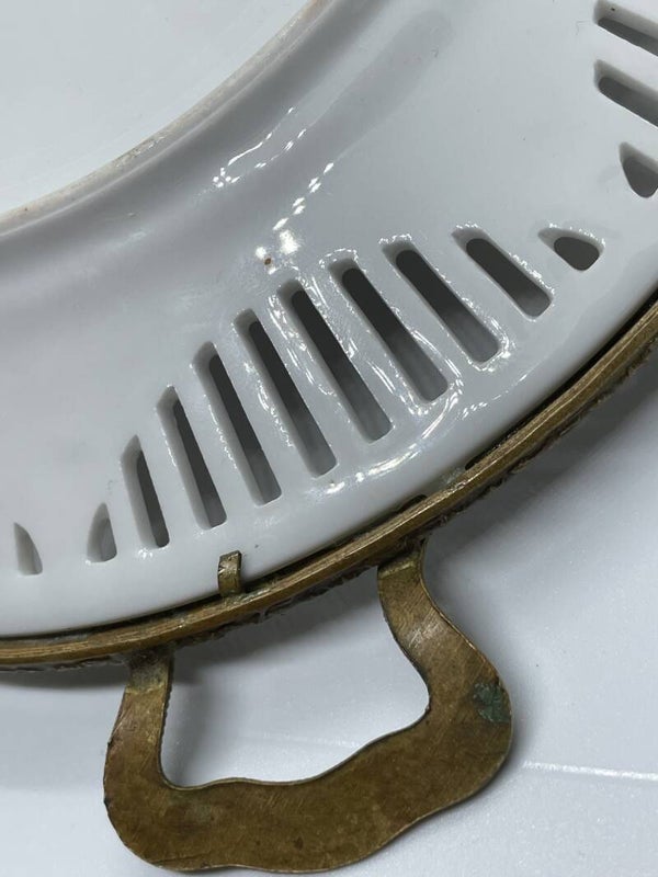 Porseleinen schaaltje met bronzen rand en met bloemen gedecoreerd.