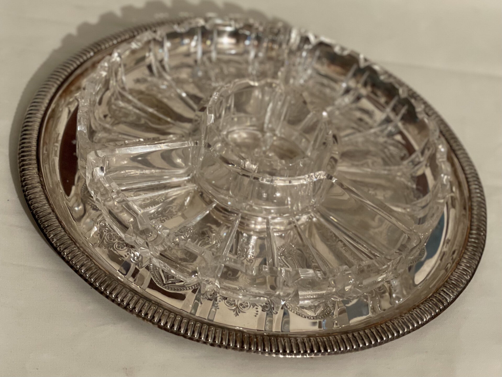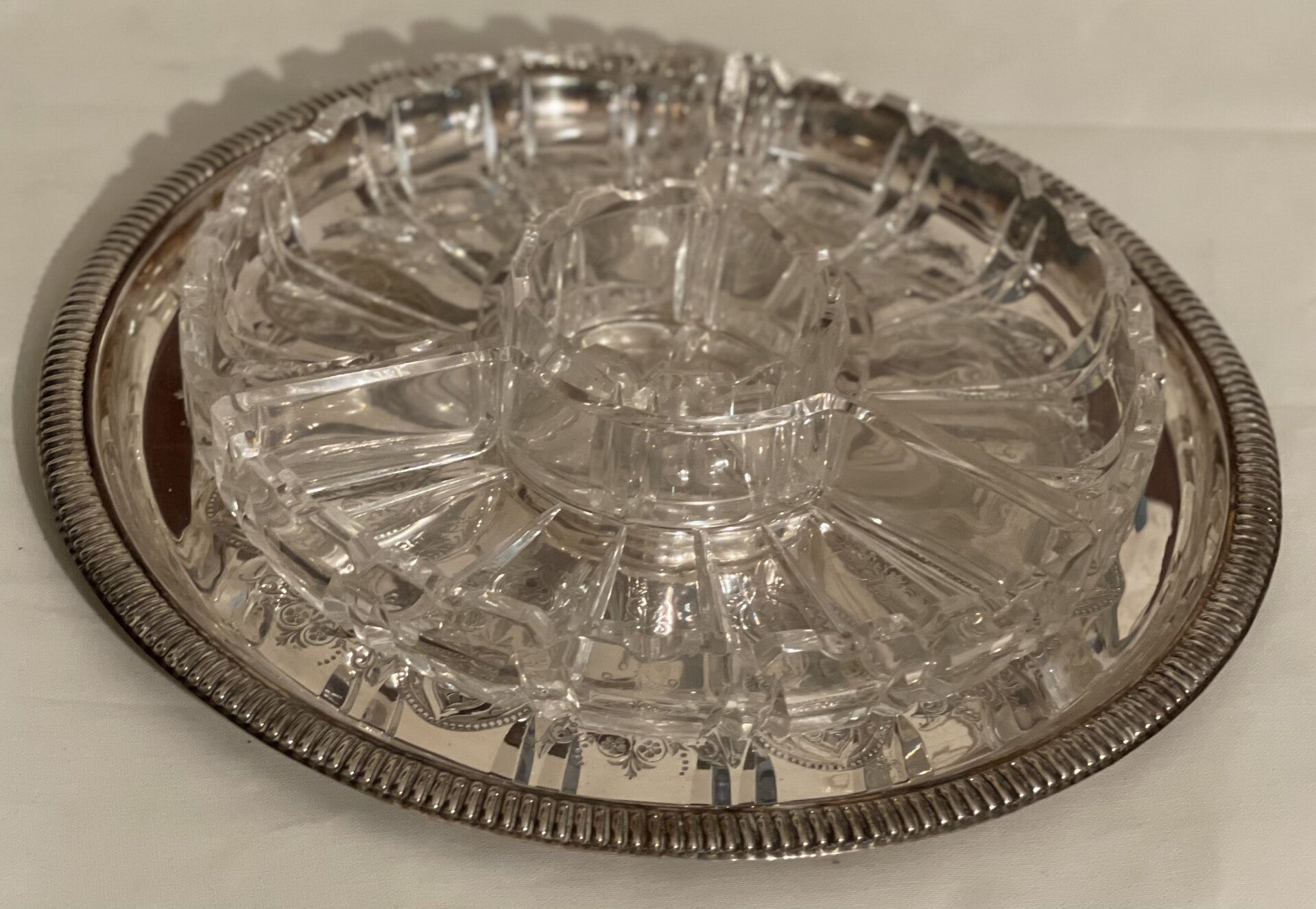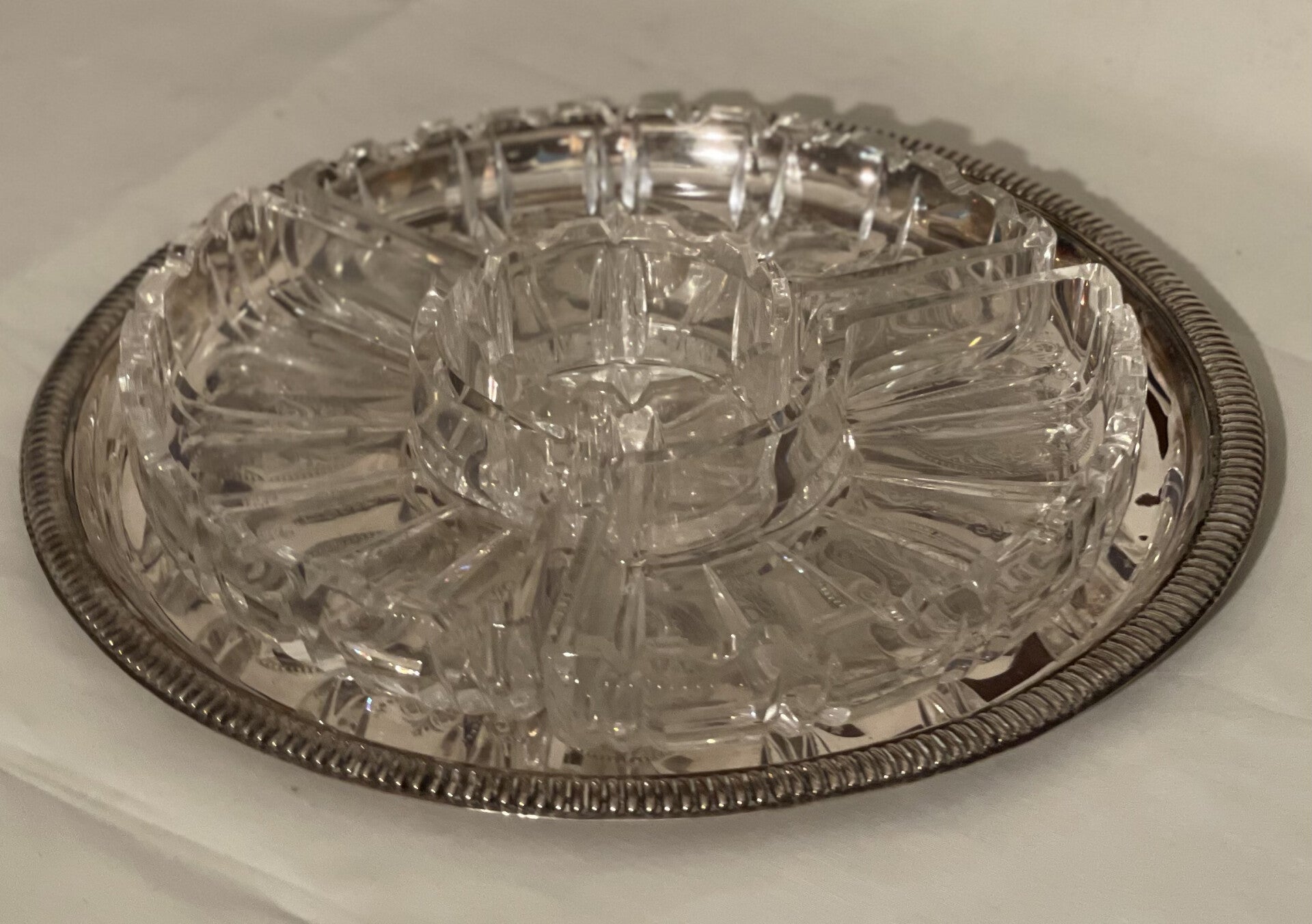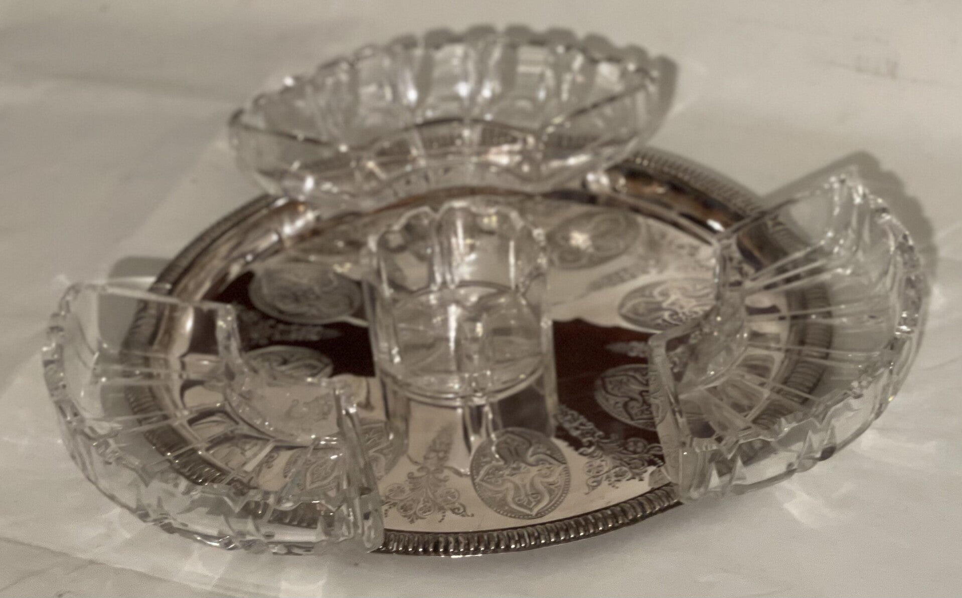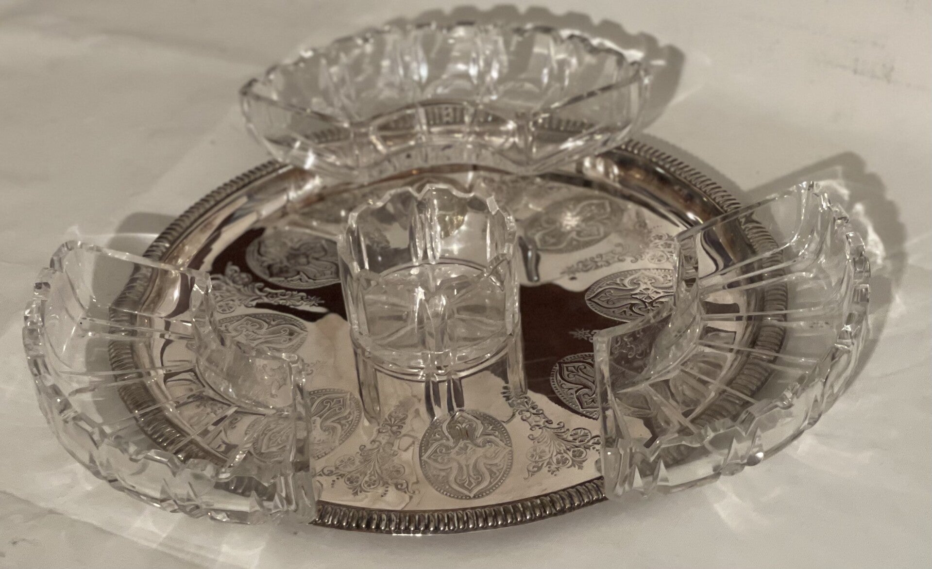 Borreldienblad, 4 kristallen scchaaltjes op verzilverde dienblad.