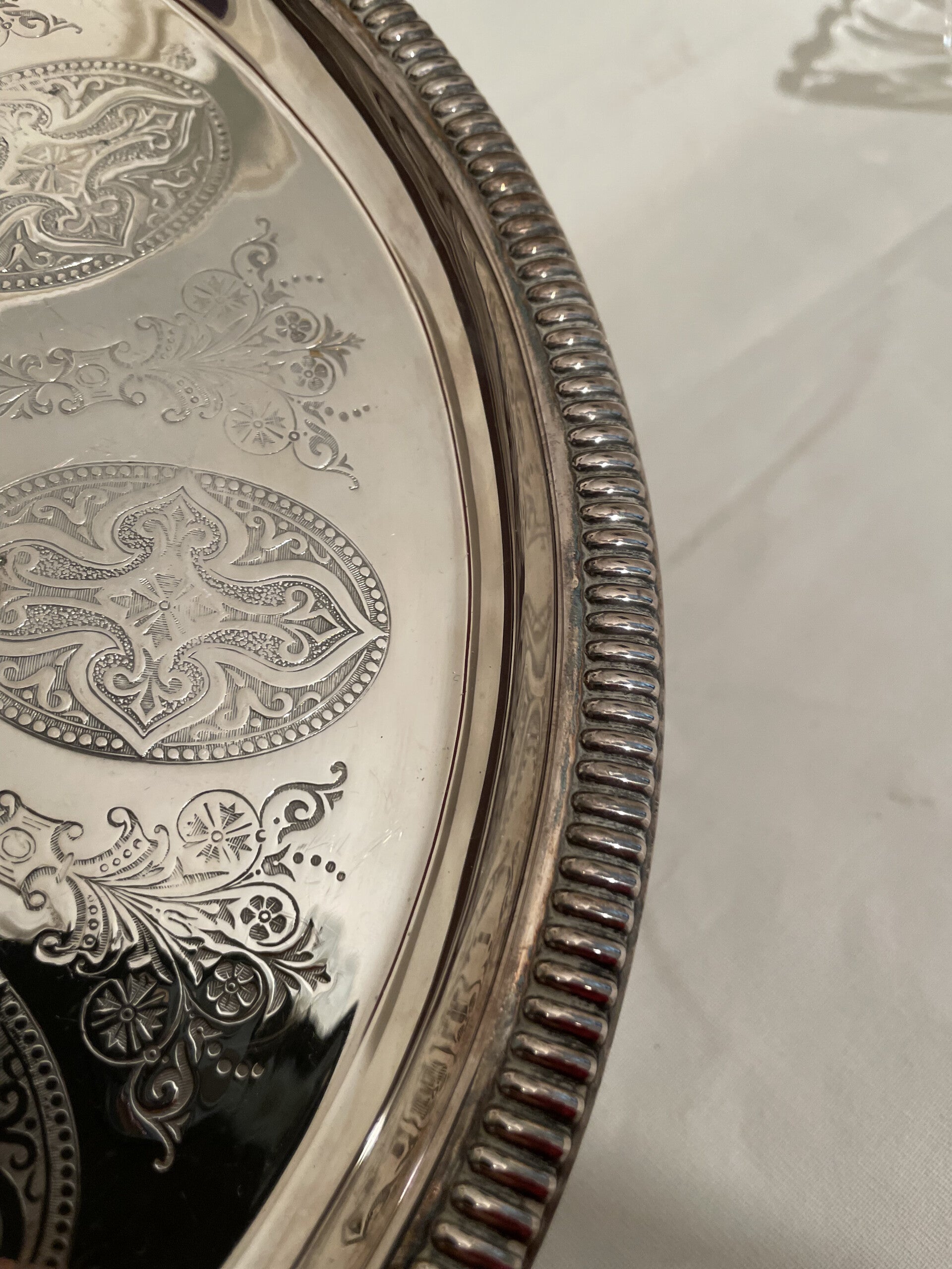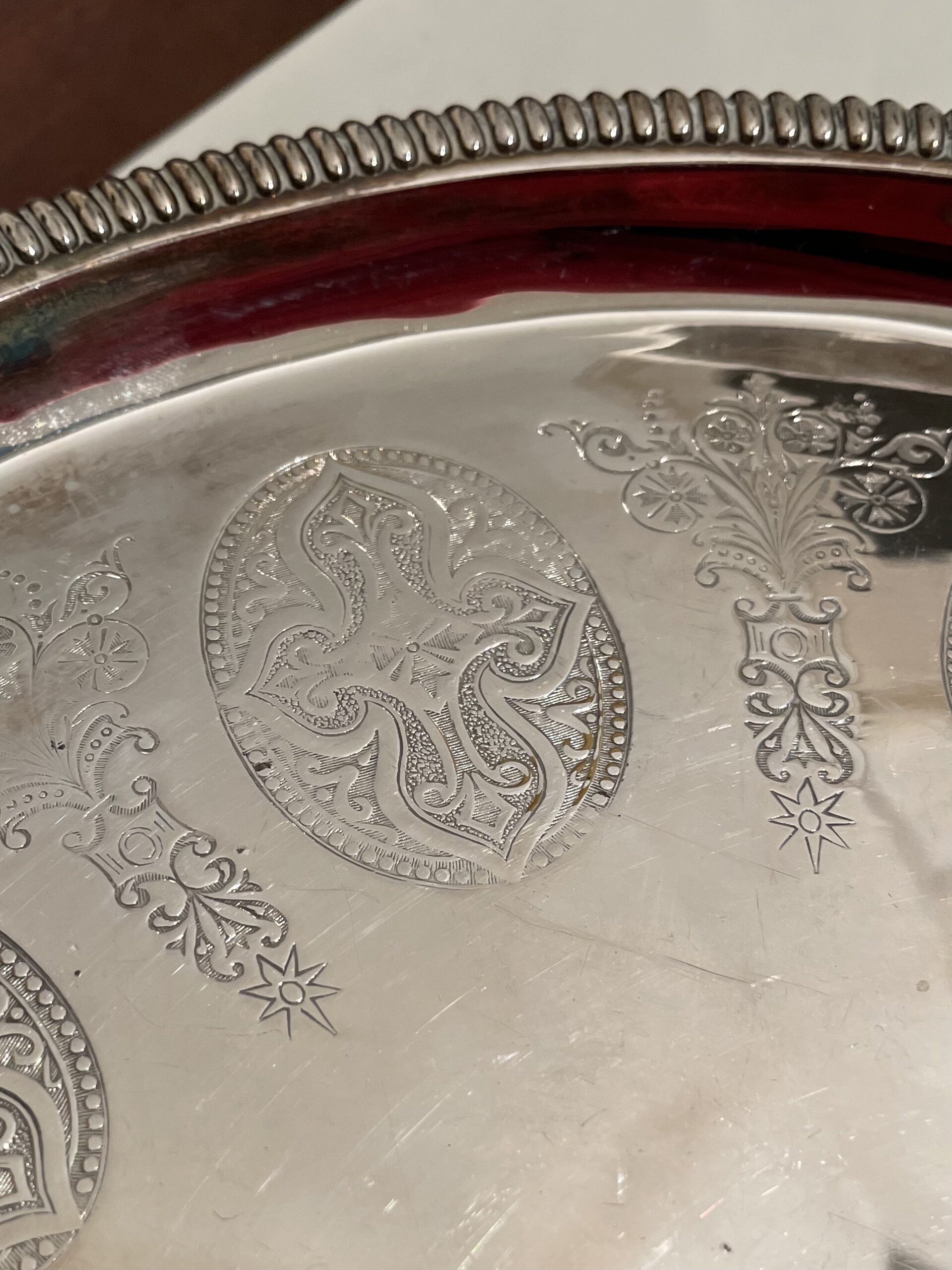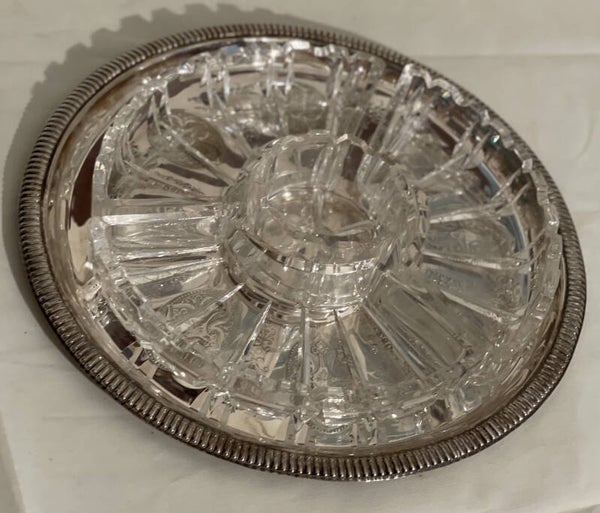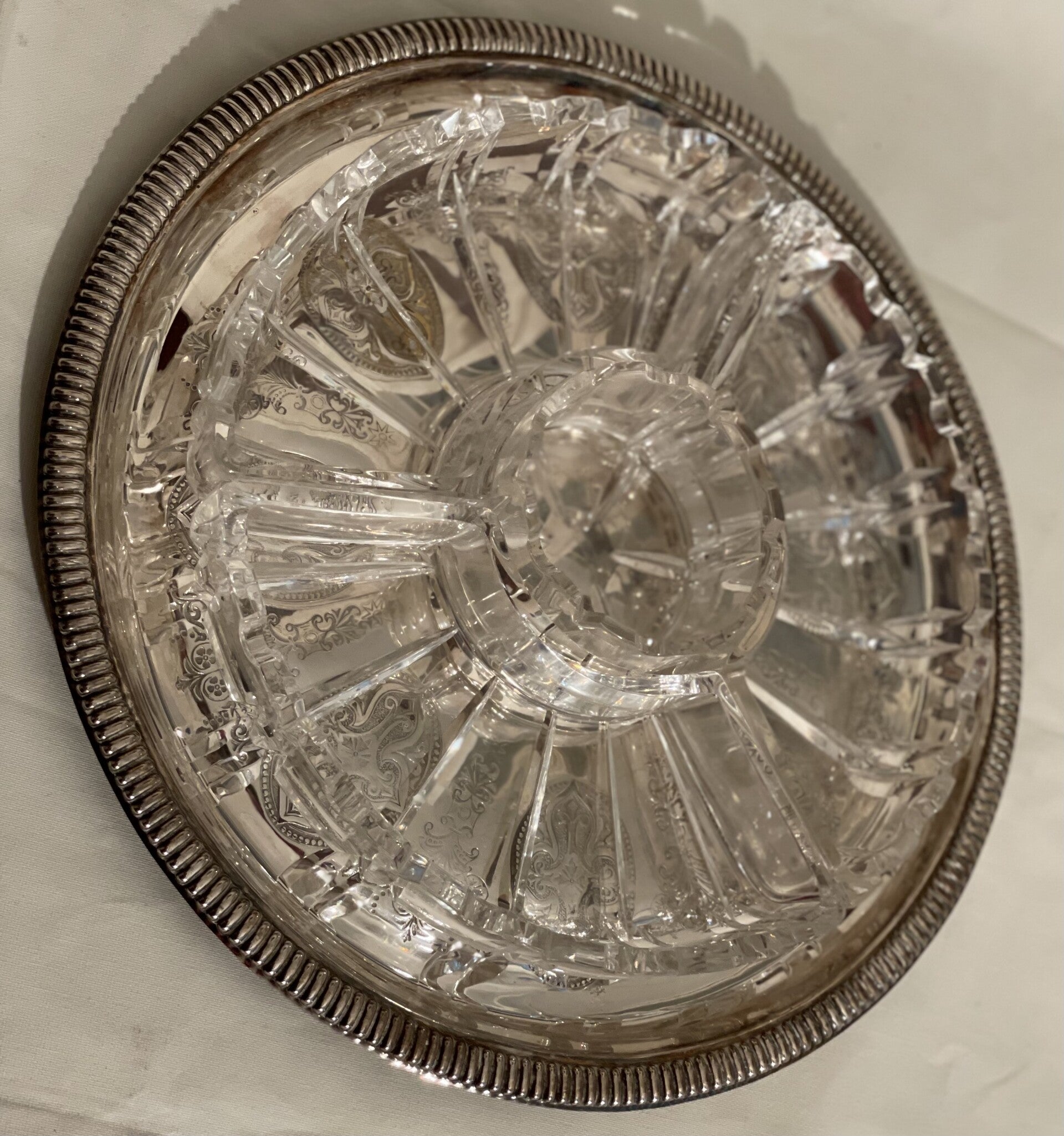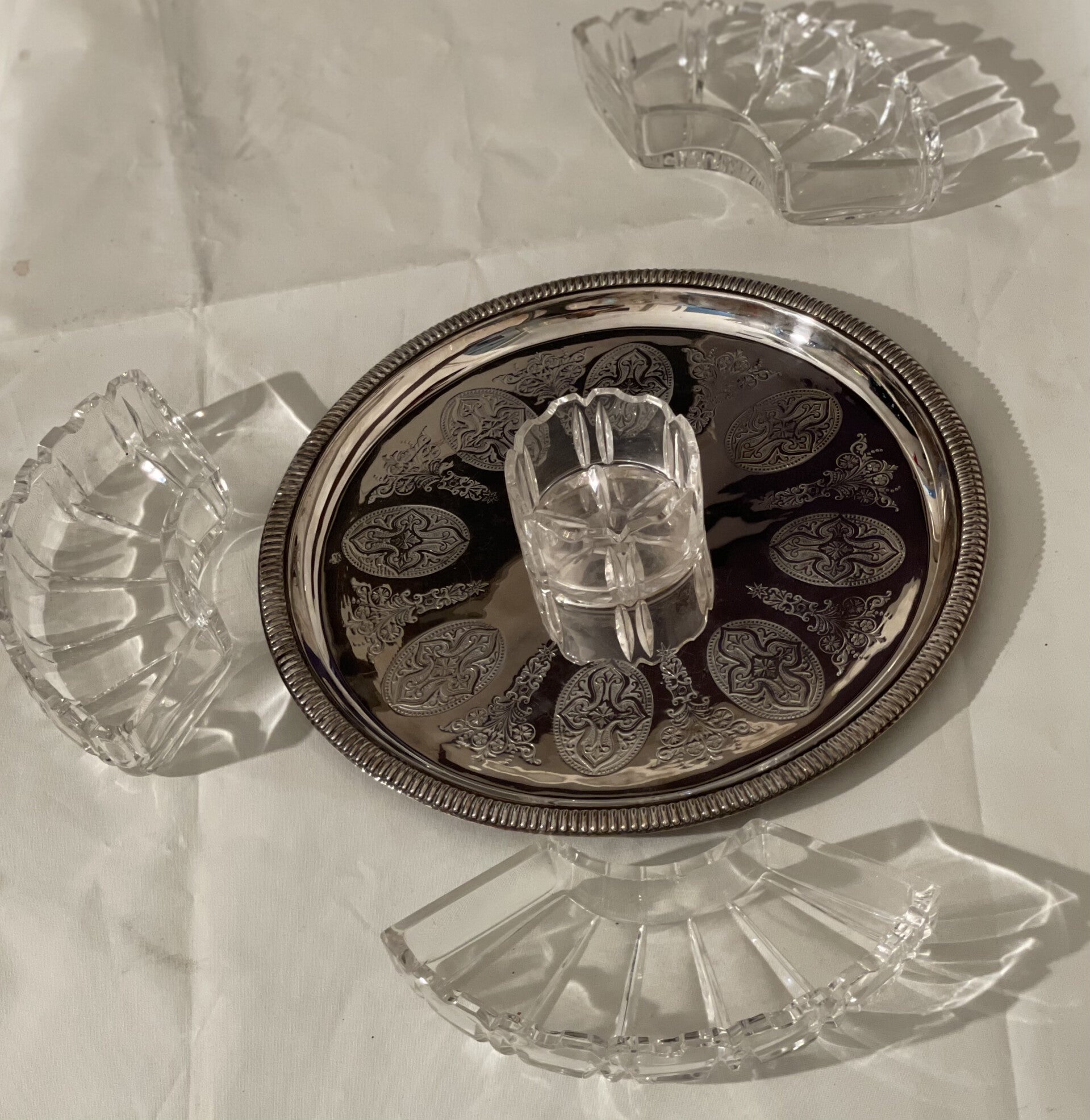 Borreldienblad, 4 kristallen scchaaltjes op verzilverde dienblad.